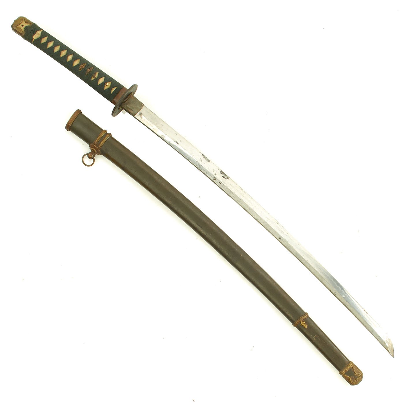 Offered in very good condition, the blade is still mostly sharp, with just a few tiny nicks/chips on the edge (HA) of the blade. Overall the polish on the blade is good, though there is wear and oxidation to the blade overall. It does not look to have been properly stored after the war, however the temper line is still quite vibrant. The blade length is approximately 26 3/8 inches and overall length 37 3/4 inches. The katana has a handmade arsenal made blade with an asymmetrically rounded (haagari) tang, and a proper geometric kissaki (tip) with a fair yokote (division between body and tip). Temper line (hamon) is visible, and is a very attractive GUNOME (zig-zag) pattern. The kissaki still has a boshi, but staining makes the shape hard to see.