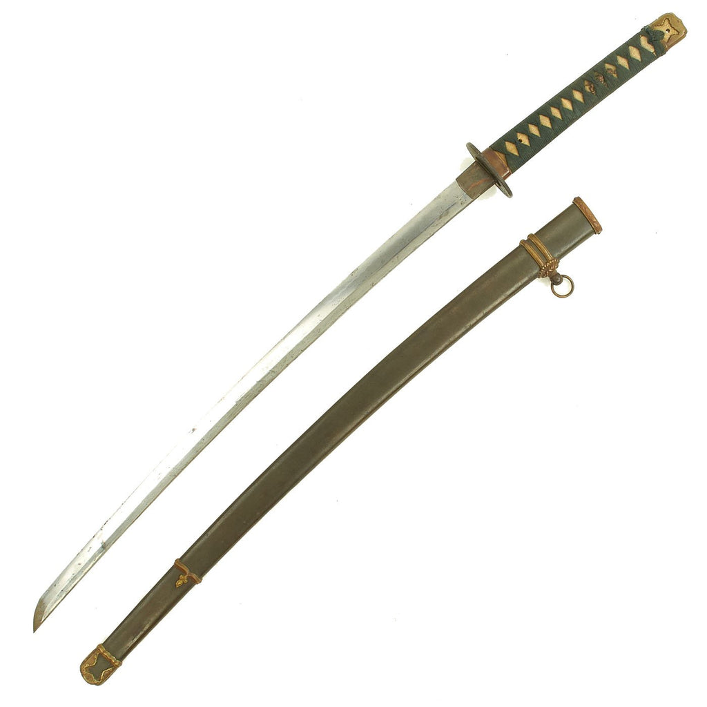 Original Item: Only One Available. Purchased from a recent private auction, this is a very nice wartime production high grade Japanese officer Katana in a 98 Shin-Gunto (九八式軍刀 kyūhachi-shiki guntō) scabbard. The fittings for the blade itself definitely predate the WWII period, and the crossguard may be hundreds of years old. The blade tang is both signed by the maker, and is handmade in the traditional fashion. A Shin-Guntō (新軍刀, new military sword) is a weapon and symbol of rank used by the Imperial Japanese Army between the years of 1935 and 1945. This is a very nice example, though it does show mild service use and oxidation on the blade.