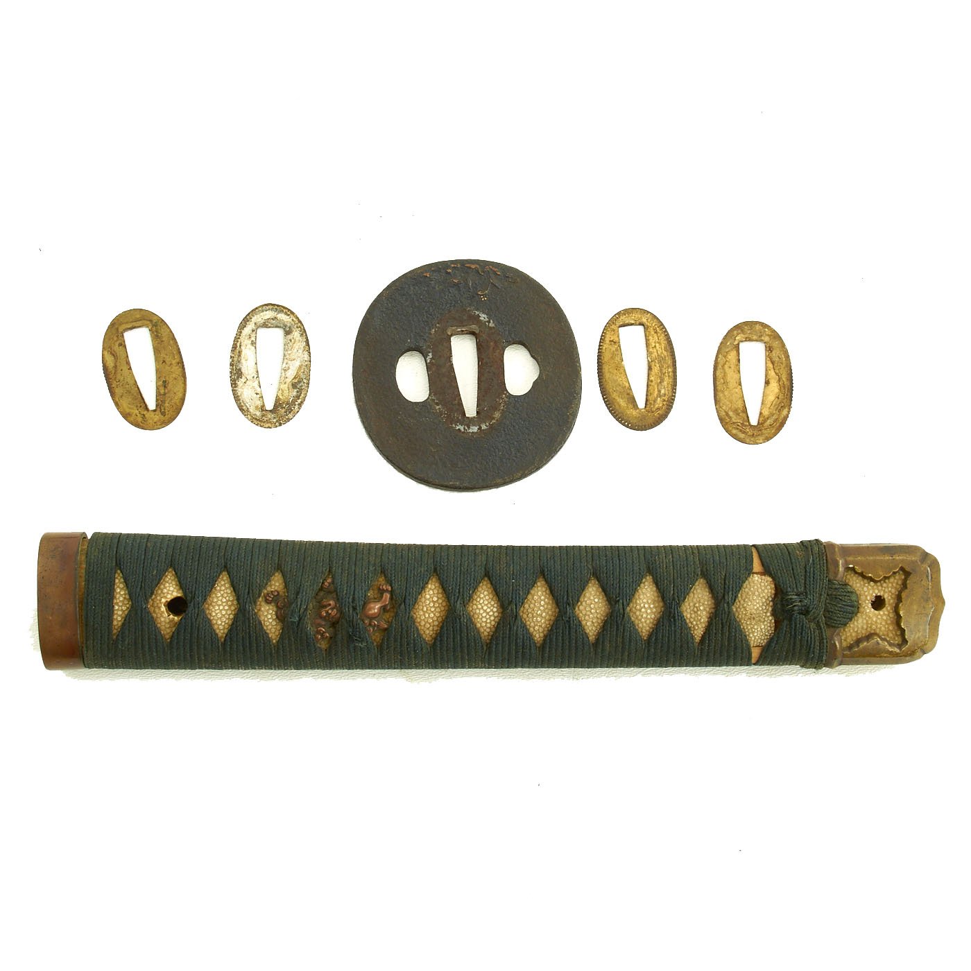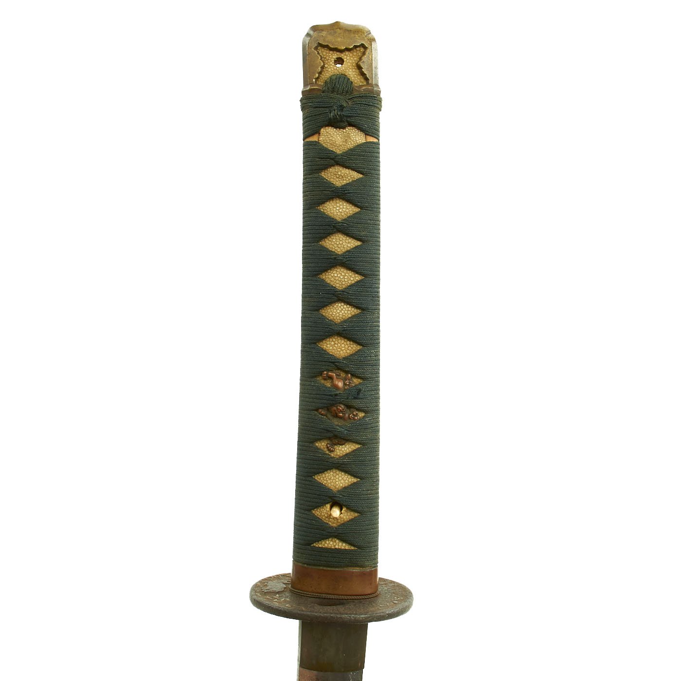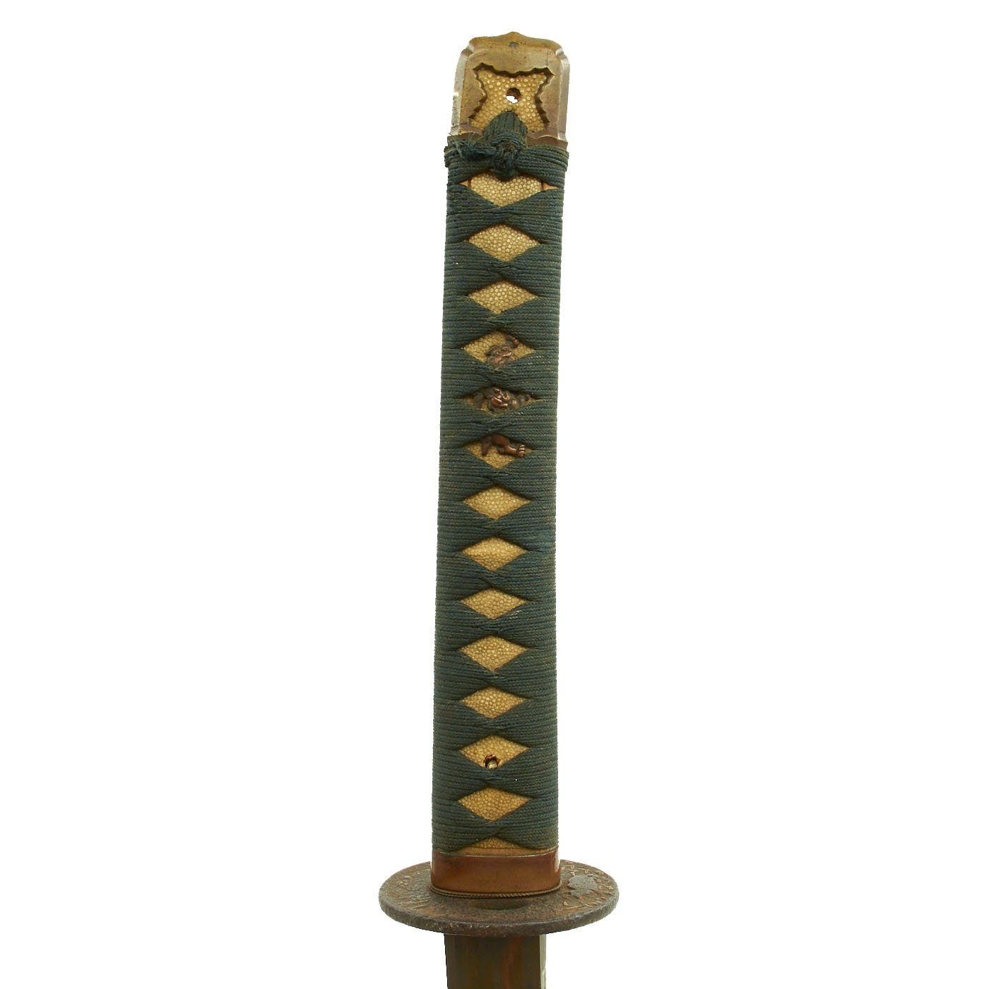 The blade mountings are the classic pre-war style with a very old round Iron Tsuba (cross guard), which has some brass natural wooded scenes on one side. The menuki (grip decorations) are stylized dogs, and not the standard Army Cherry Blossoms. The Kabuto-gane (pommel cap) is simplified, and the sarute (end loop) is missing, or was never installed. This has the hallmarks of a wartime blade that was outfitted with some family supplied material for the tsuka (handle). There are 4 Seppa (spacers) around the cross guard to keep the fit tight, though the tsuba is now a bit loose.. The blade collar (habaki) looks to be bronze alloy, with a partly blacked finish.
