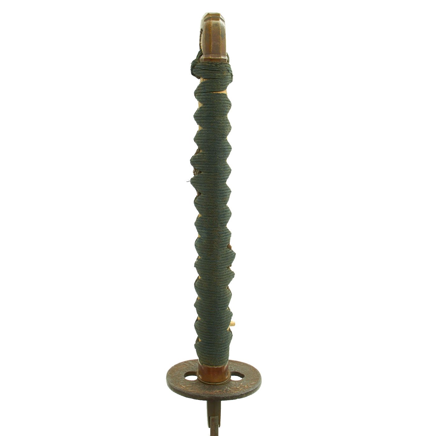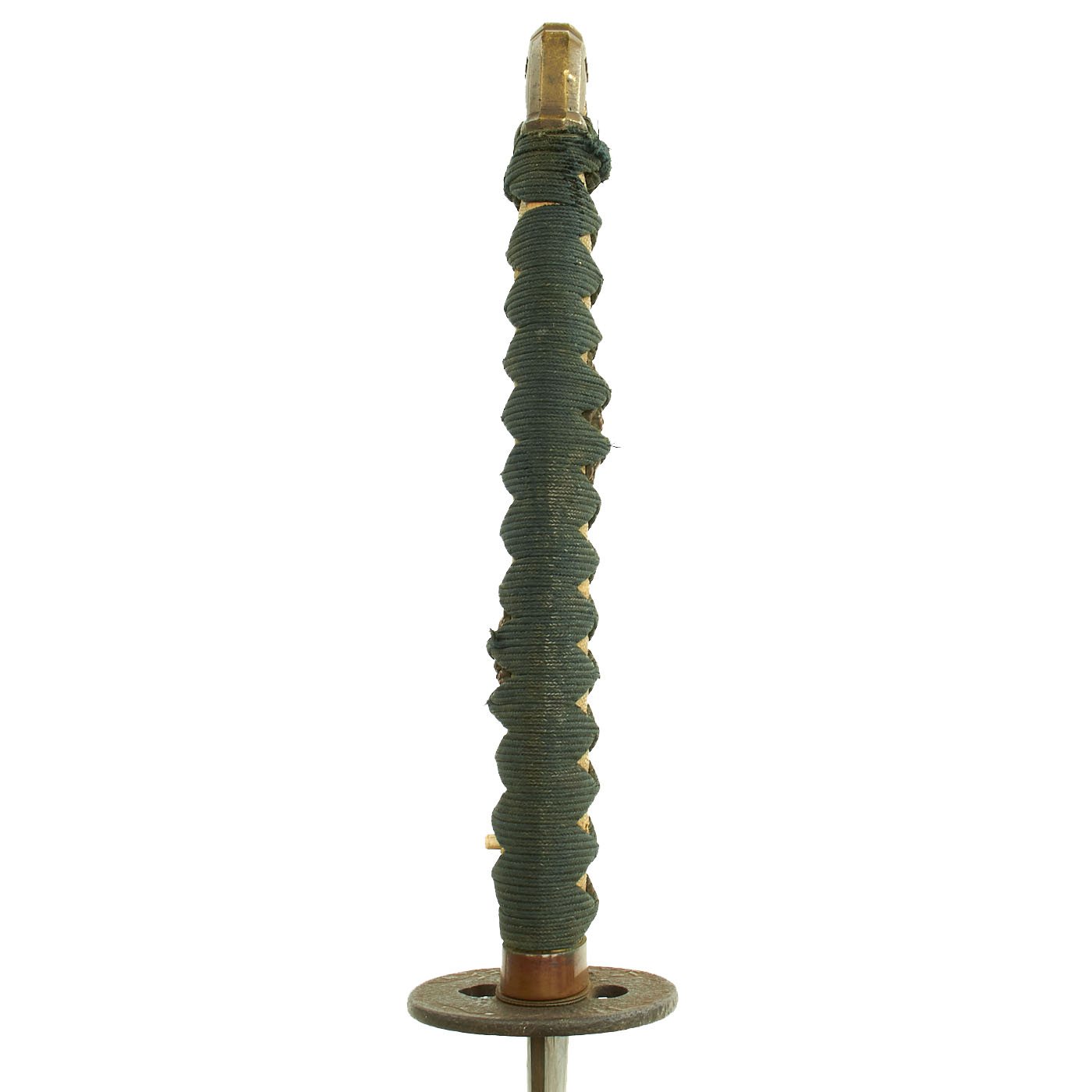 The handle (tsuka) has an nice stingray skin (Sa-Me) grip, which is fully intact. It has a complete Green Ito (cloth binding), which does show wear and age. There is a bit of wear, with some light overall staining and dirt. There is a single wooden securing peg (mekugi) still present, which looks to be a post war replacement. With the sword came a small piece of paper, which looks to originally have been wrapped around the nakago (tang), though we do not know if it has information about the sword, or whether it was just used to make the tsuka fit better.