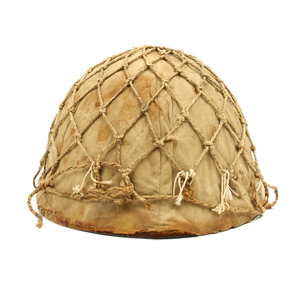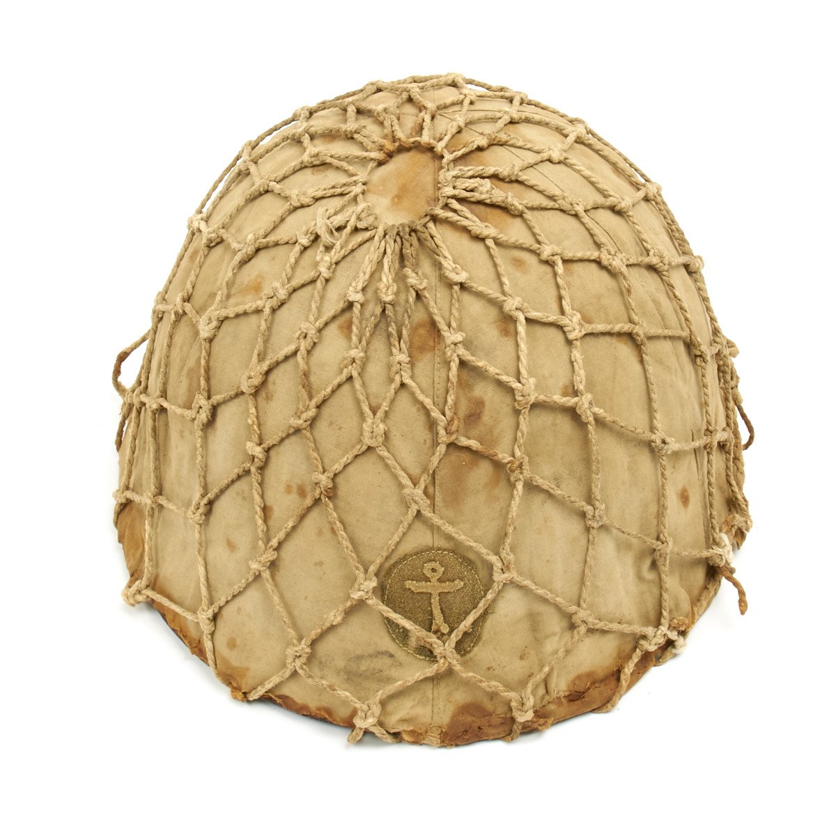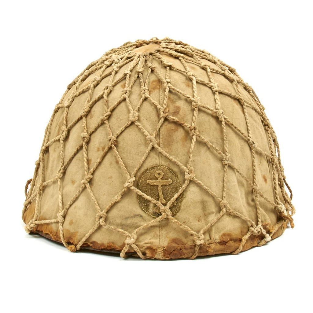 Acquired directly from a USMC Veteran of the Pacific Campaign estate this is an extraordinary World War II Japanese Special Naval Landing Forces Marine Division combat helmet that is complete with the first pattern cloth cover and original camouflage net!