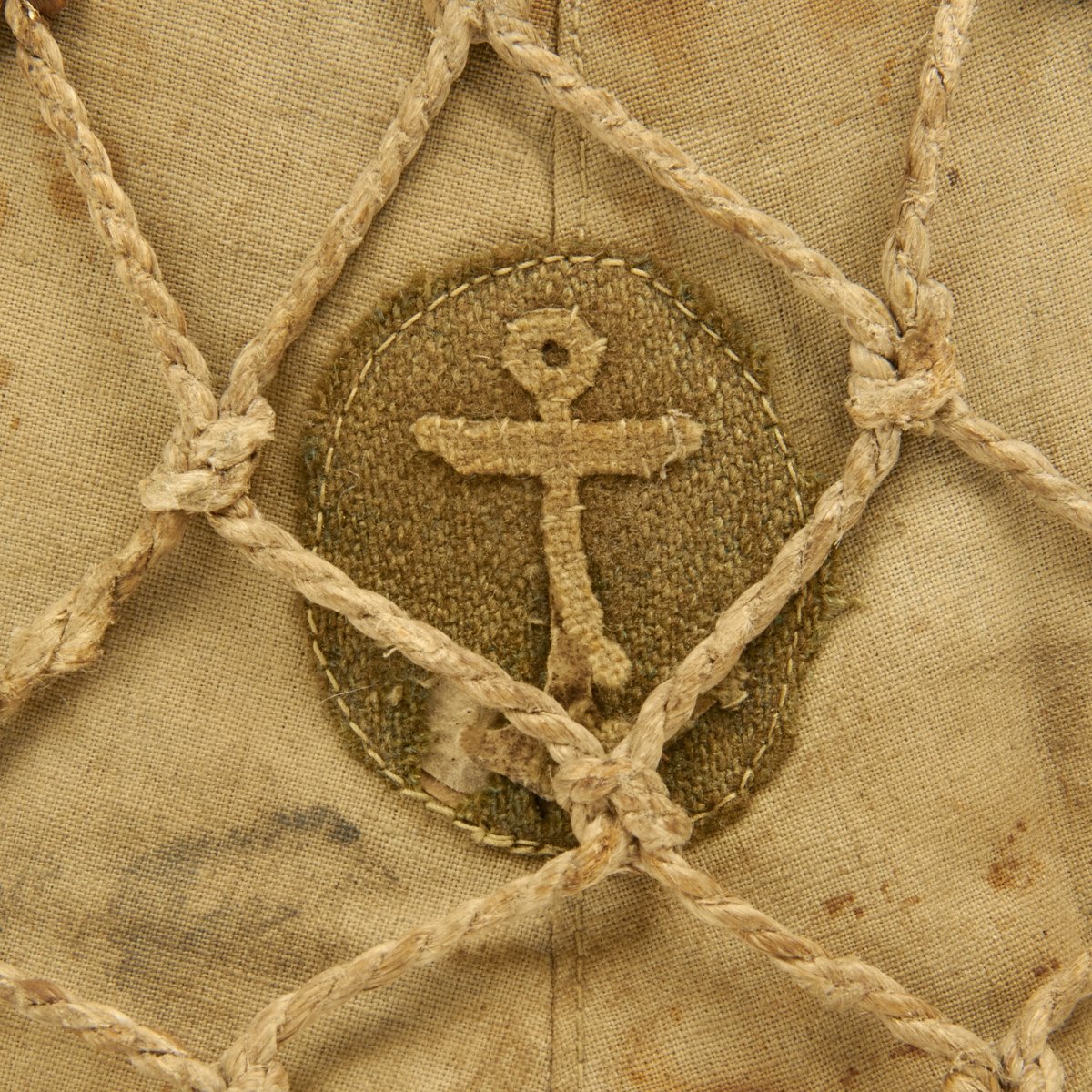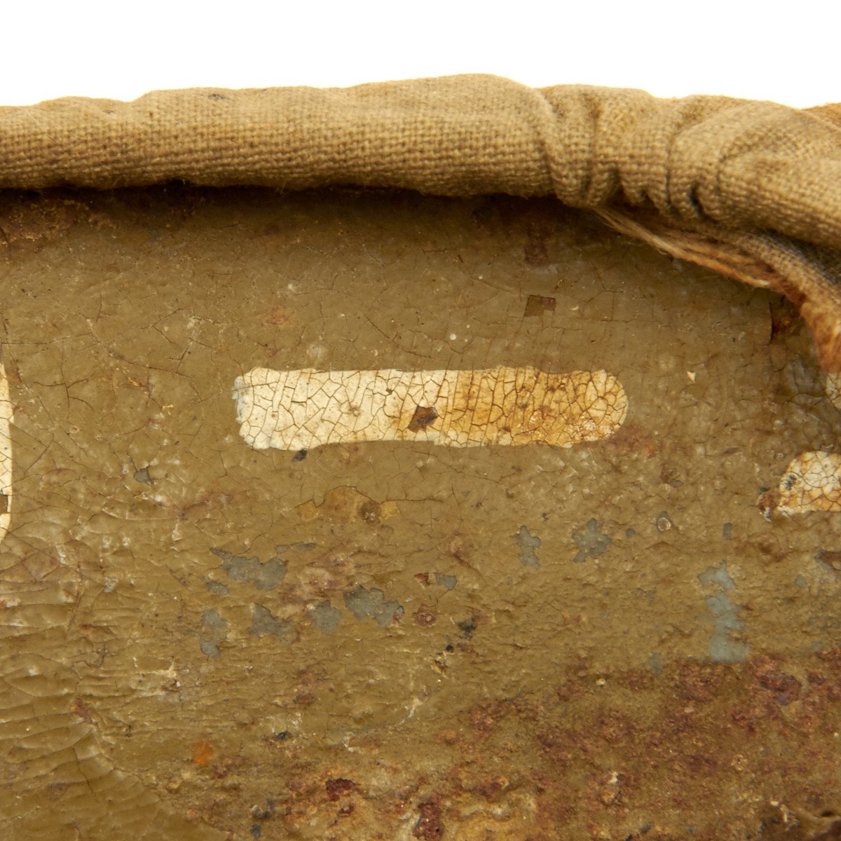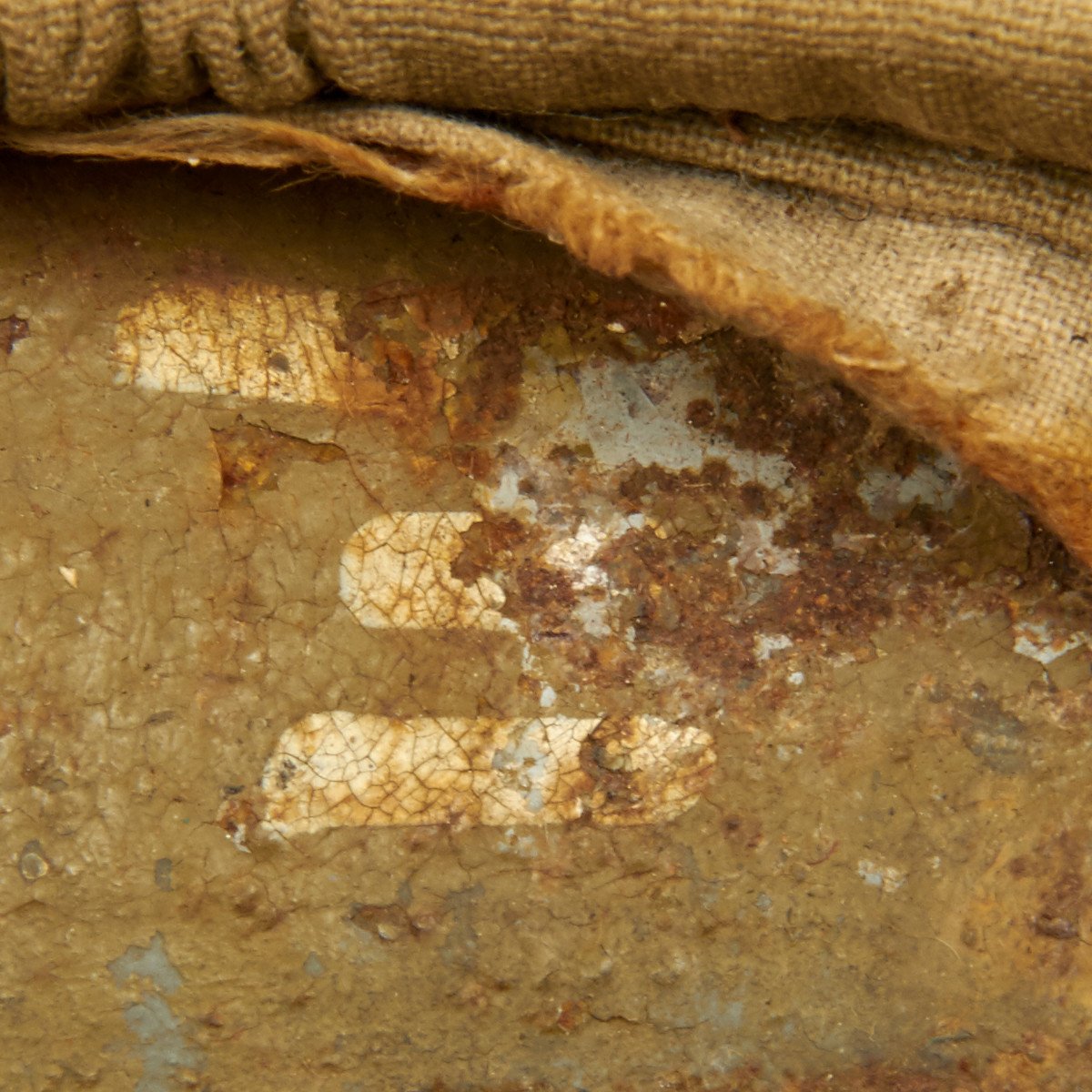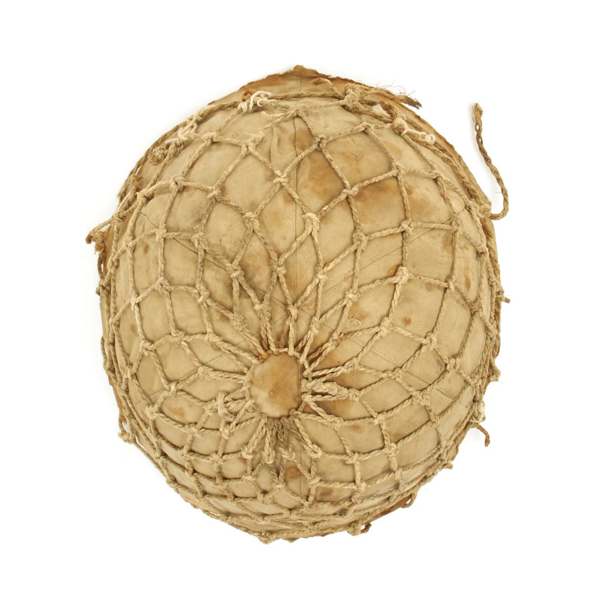 The net is intact and is clearly impressed into the cloth cover. The cover, not surprisingly, exhibits some stains but it, too, is intact. The cloth Imperial Japanese Navy insignia is on the front of the cover. There are a few small spots on the edge of the helmet where the first pattern cover has worn through, and the known tendency of this to happen with the first pattern covers especially if the helmet was waterlogged or left in standing water. It is impossible to determine the extent of the paint on the helmet shell because the cover and the net that are on the helmet have so obviously been on the helmet since the war that removing them, or even attempting to remove them, would damage the historical integrity of the helmet.