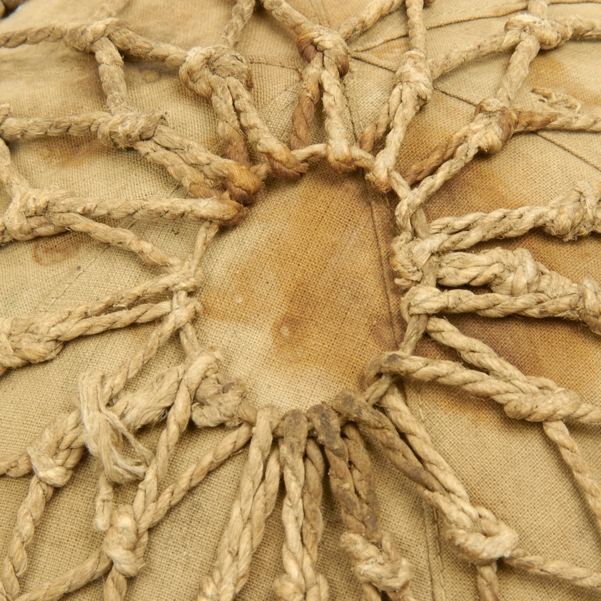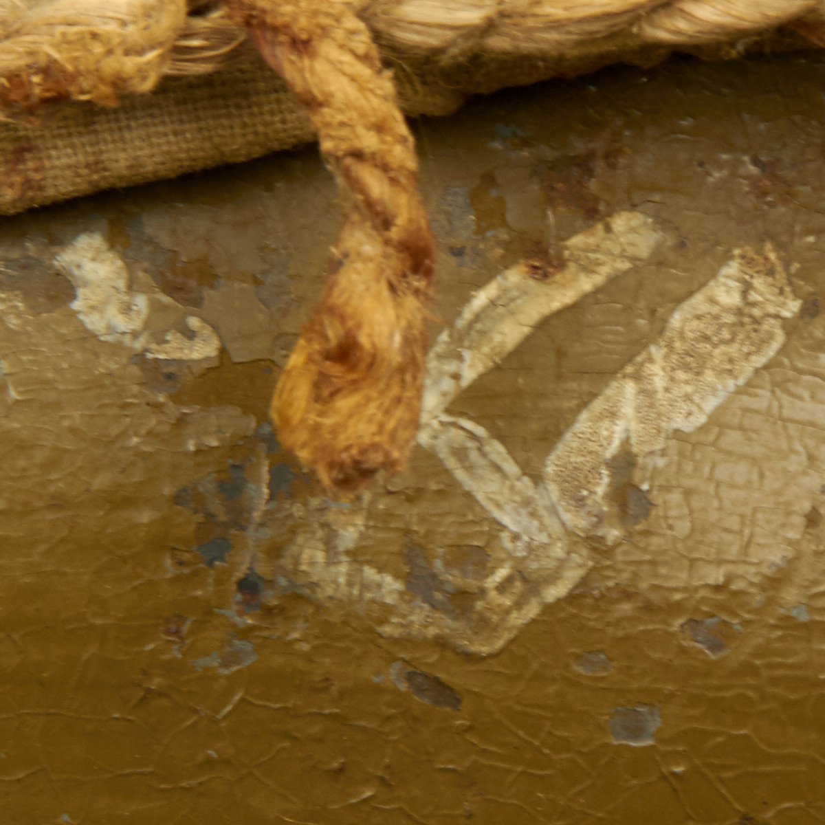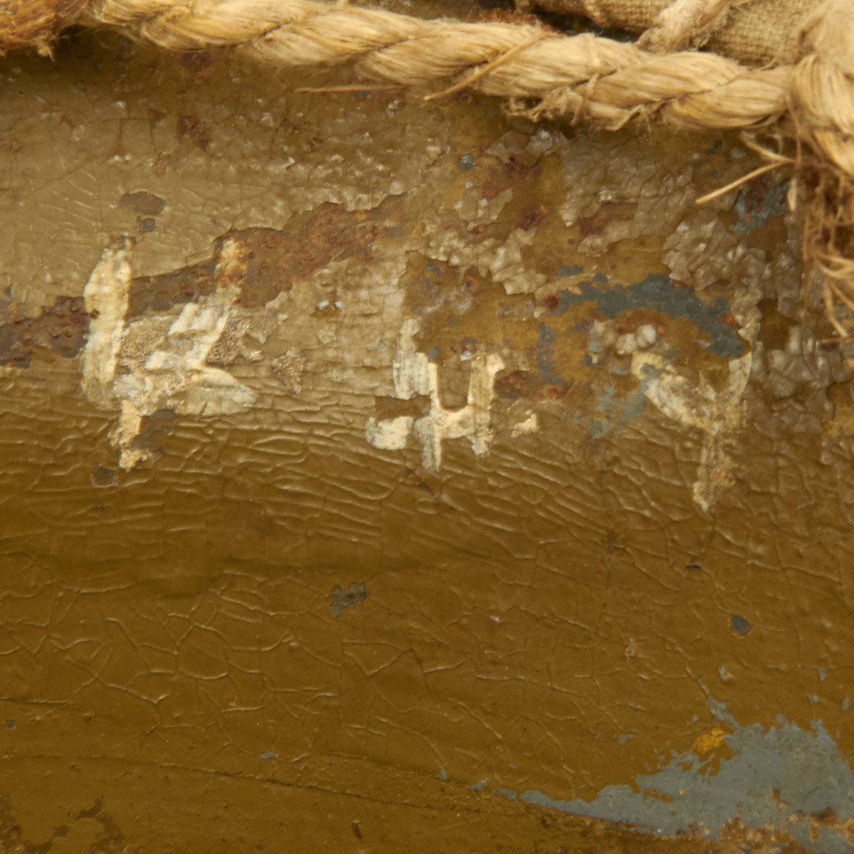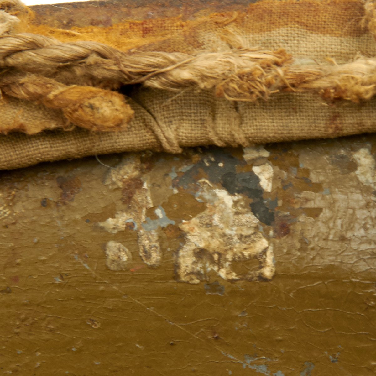 The net is intact and is clearly impressed into the cloth cover. The cover, not surprisingly, exhibits some stains but it, too, is intact. The cloth Imperial Japanese Navy insignia is on the front of the cover. There are a few small spots on the edge of the helmet where the first pattern cover has worn through, and the known tendency of this to happen with the first pattern covers especially if the helmet was waterlogged or left in standing water. It is impossible to determine the extent of the paint on the helmet shell because the cover and the net that are on the helmet have so obviously been on the helmet since the war that removing them, or even attempting to remove them, would damage the historical integrity of the helmet.