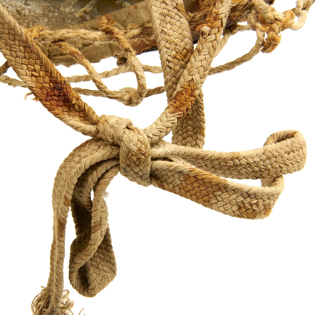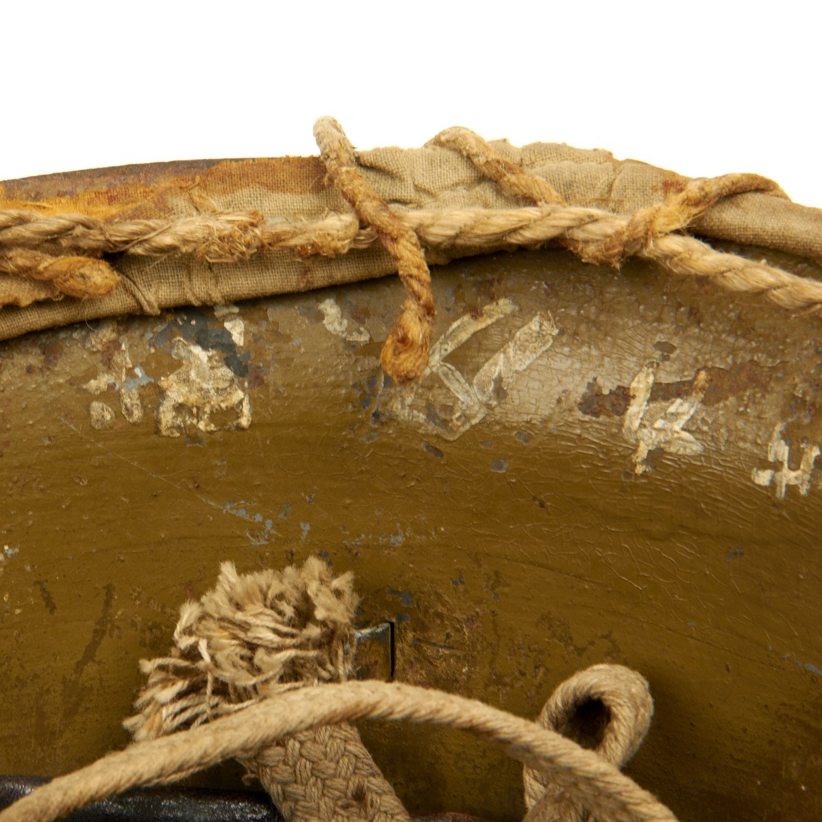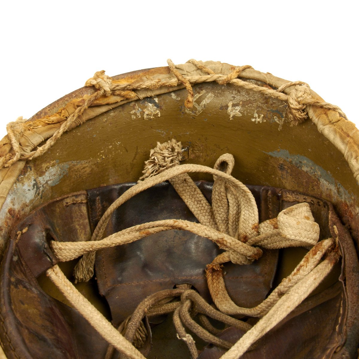 The interior leather liner of the helmet shows wear that is completely consistent with the helmet having been worn in combat and it is entirely matching with the wear and use on the helmet as a whole. The cloth chin straps are also present and they still remain tied together, just as they were when the helmet was used by the Japanese Marine who last wore it.