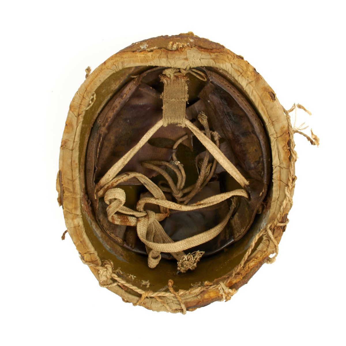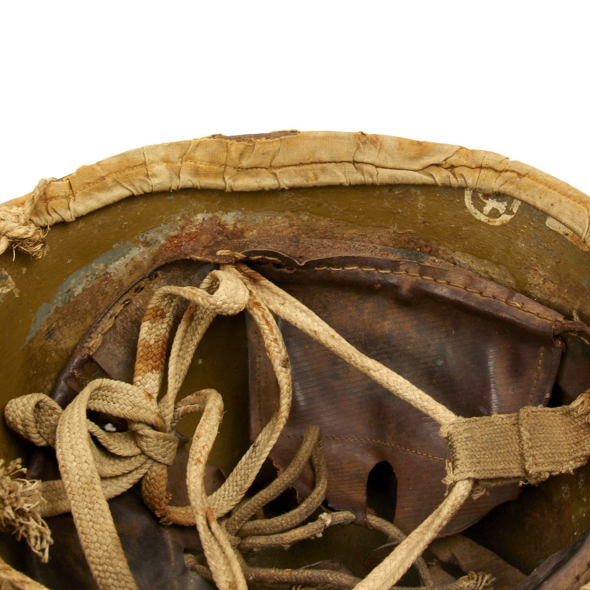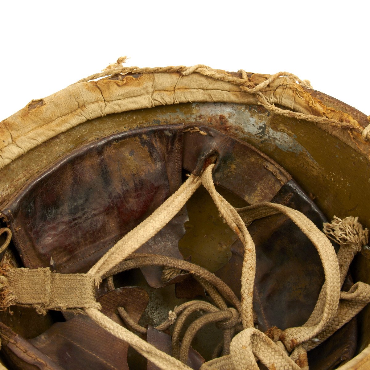 The interior leather liner of the helmet shows wear that is completely consistent with the helmet having been worn in combat and it is entirely matching with the wear and use on the helmet as a whole. The cloth chin straps are also present and they still remain tied together, just as they were when the helmet was used by the Japanese Marine who last wore it.