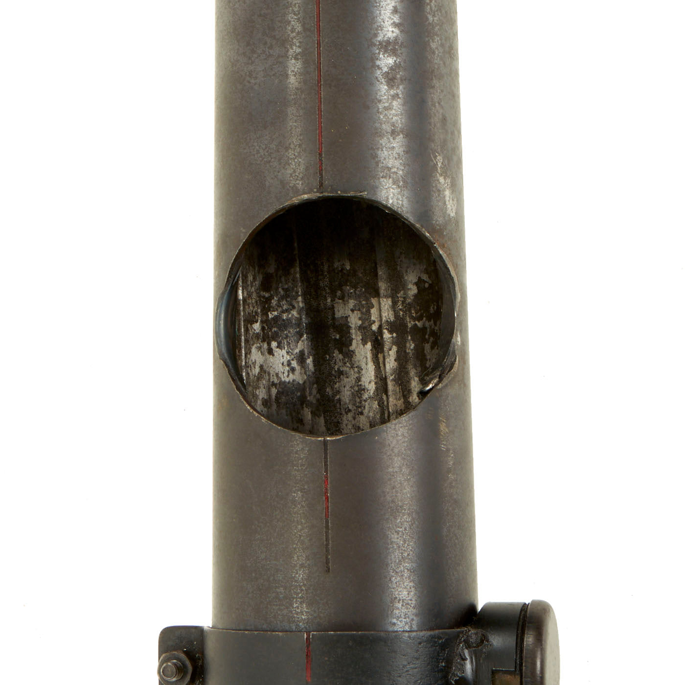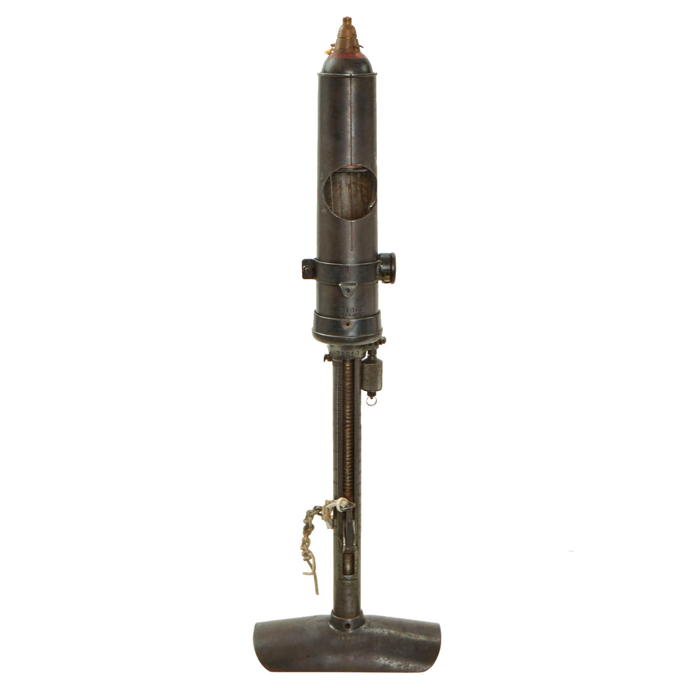 This example is fitted with a rare mechanical level, which is attached via a band that goes around the barrel. This would normally be at the bottom of the barrel, but it has been moved up so that the serial number and other markings on the barrel can be seen. It unfortunately is not quite functional, as the weight inside seems to have broken off of the rotating assembly.