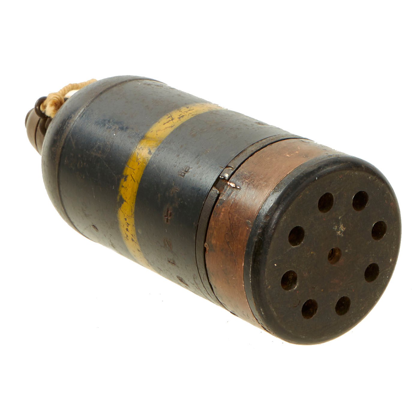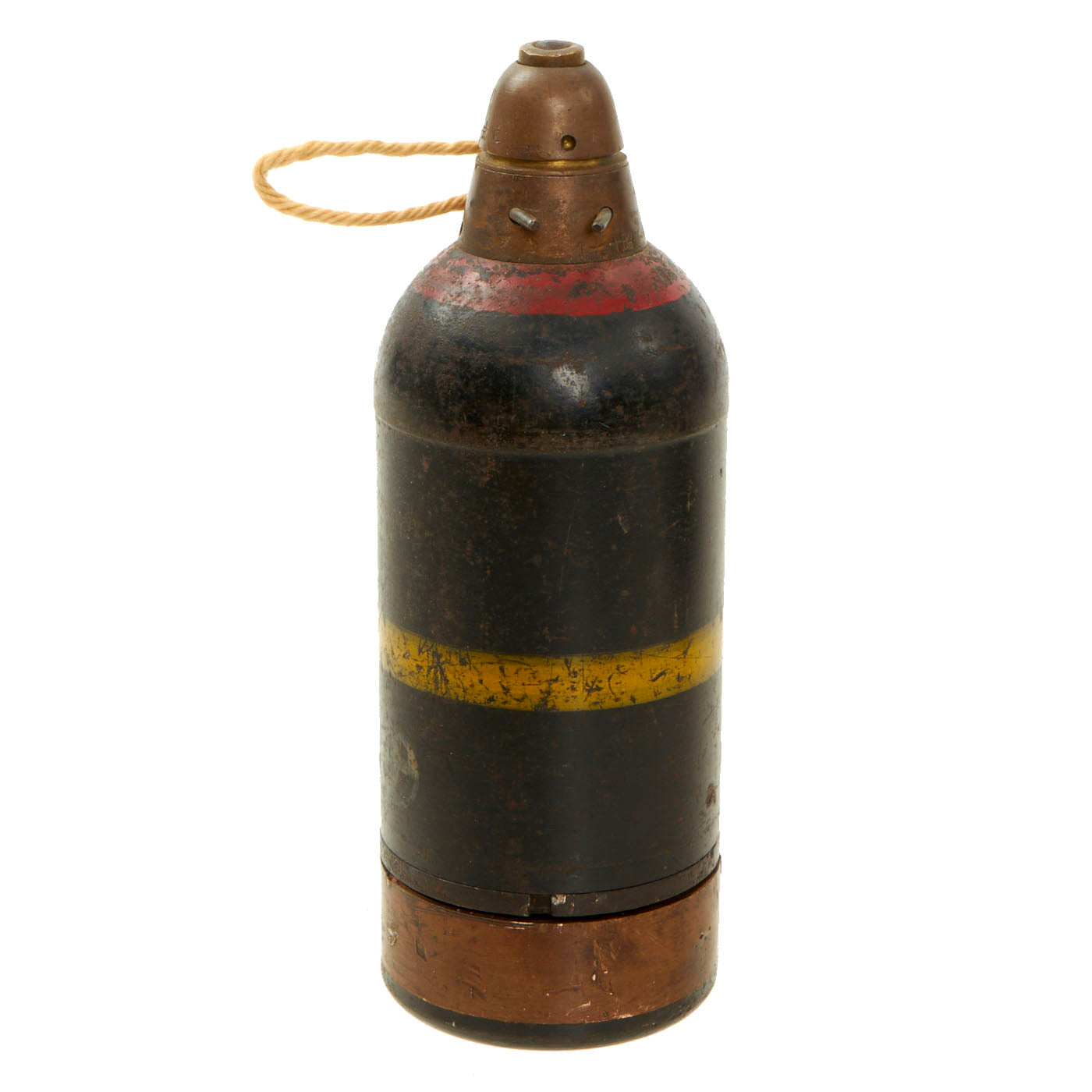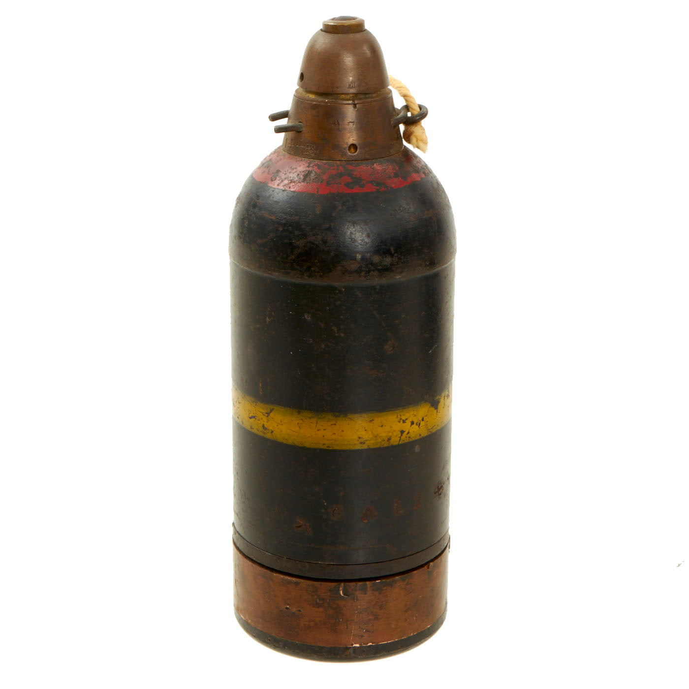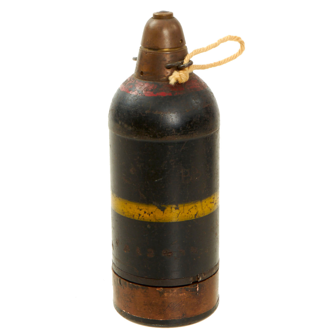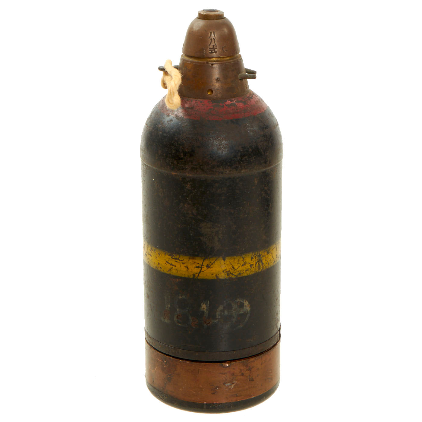 The included Inert 50mm Mortar, Type 89 grenade is also dated on the side of both the fuze and housing with 七 十 昭, for Showa 17 - 1942. It is in good condition as well, with the fuse, pin and pull string.