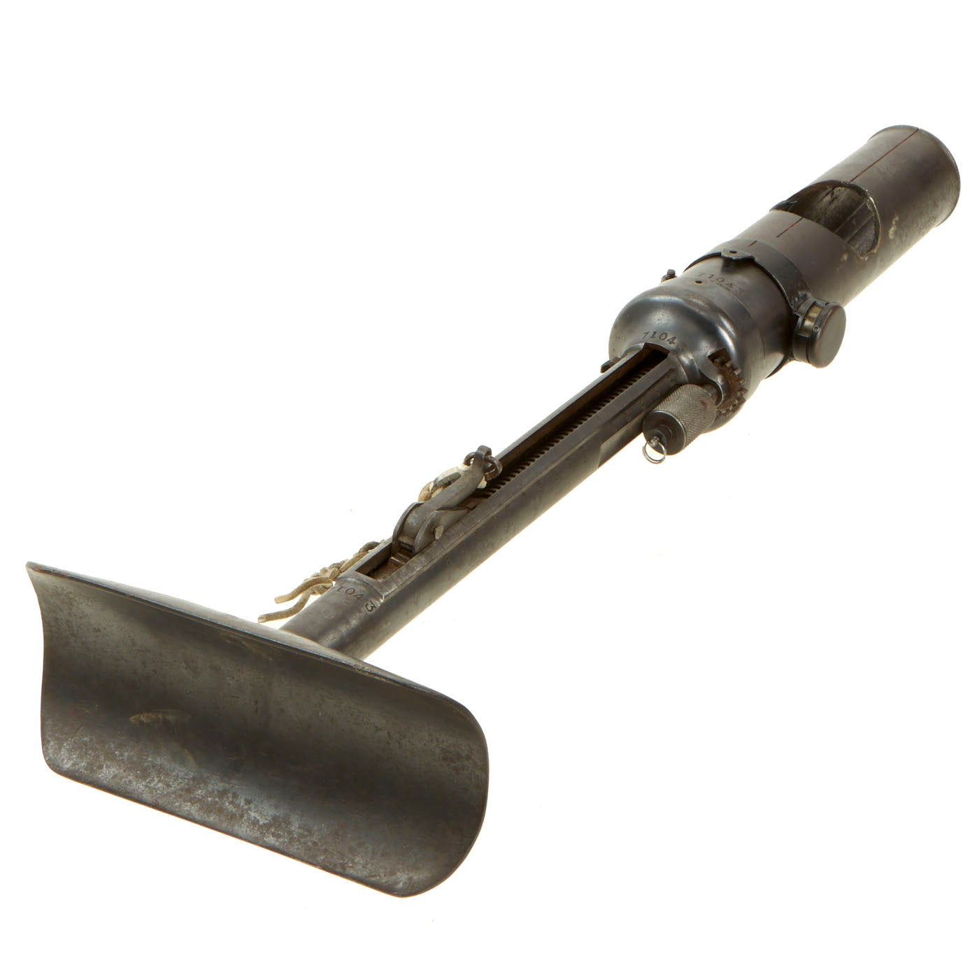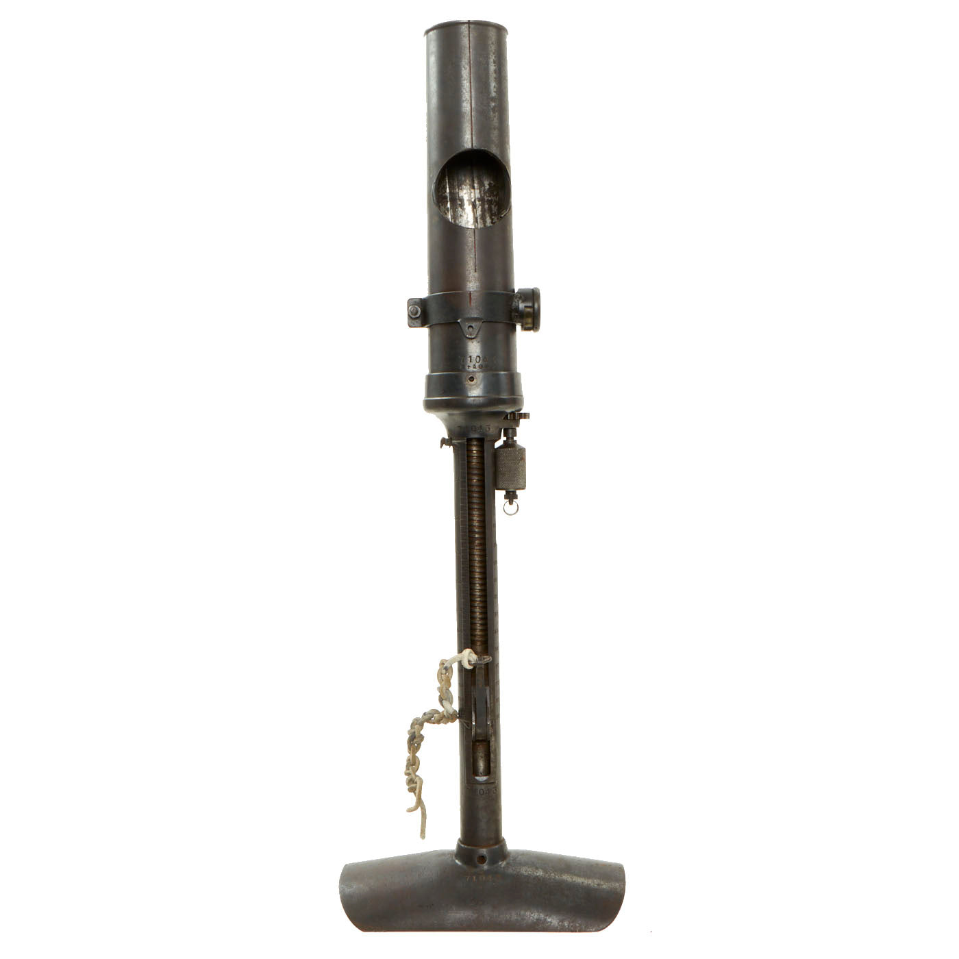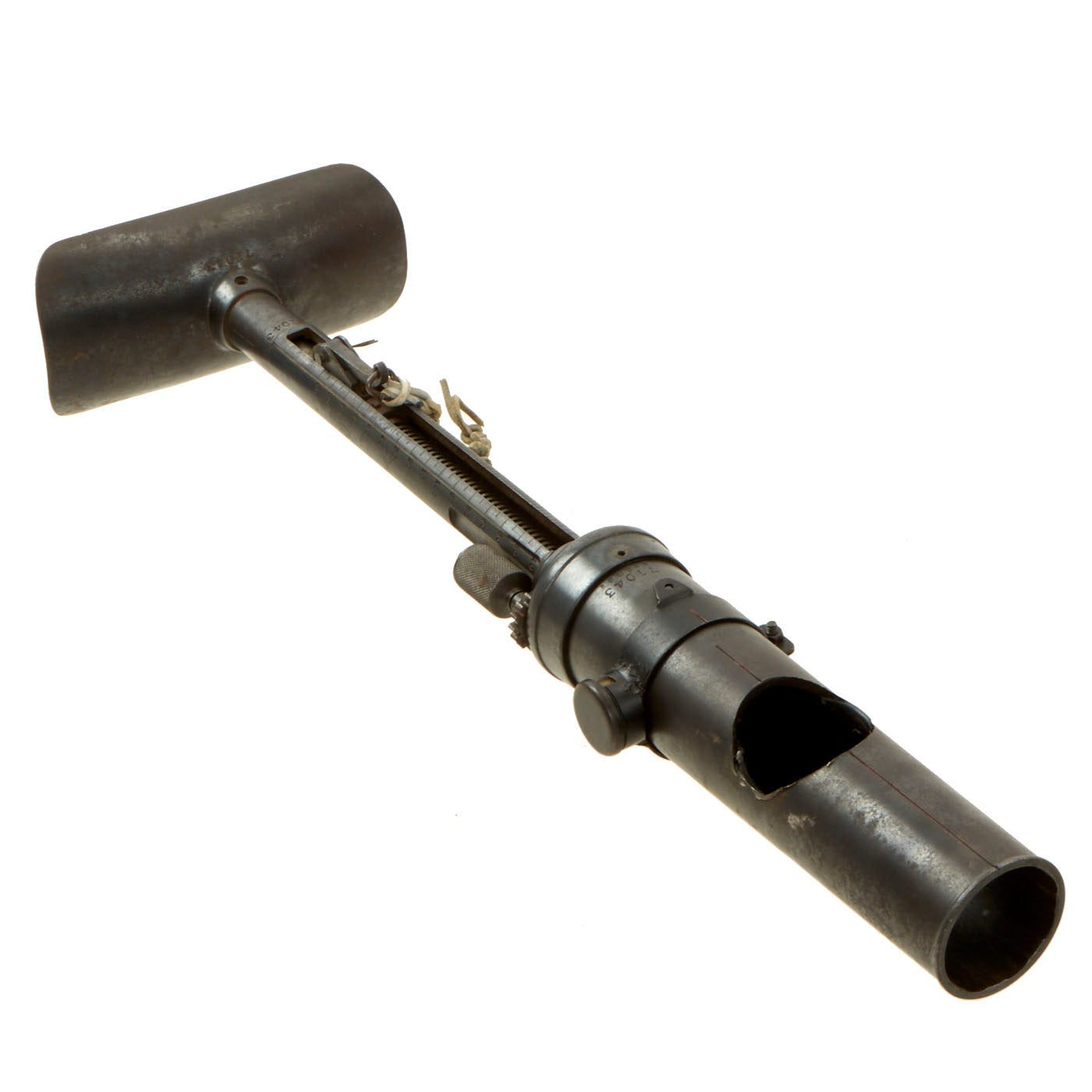 This very good example is nicely marked with serial number 71043, that is matched on the barrel, tube cup, support/range adjustment, and base assembly. Shortened number 043 and 71043 are on the other smaller components. The tube has been drilled with a bore-width hole and had the trigger rendered inoperable per ATF regulations to deactivate. The range adjustment gear is still present and functional, so the trigger can be moved up and down along with the inert firing assembly.