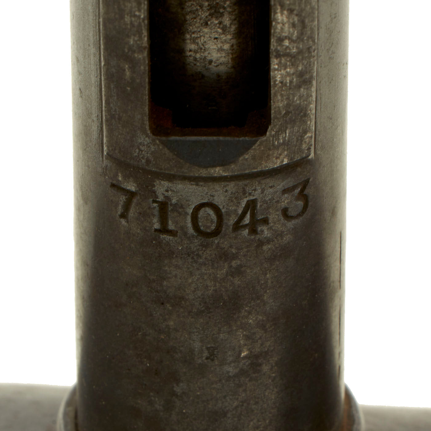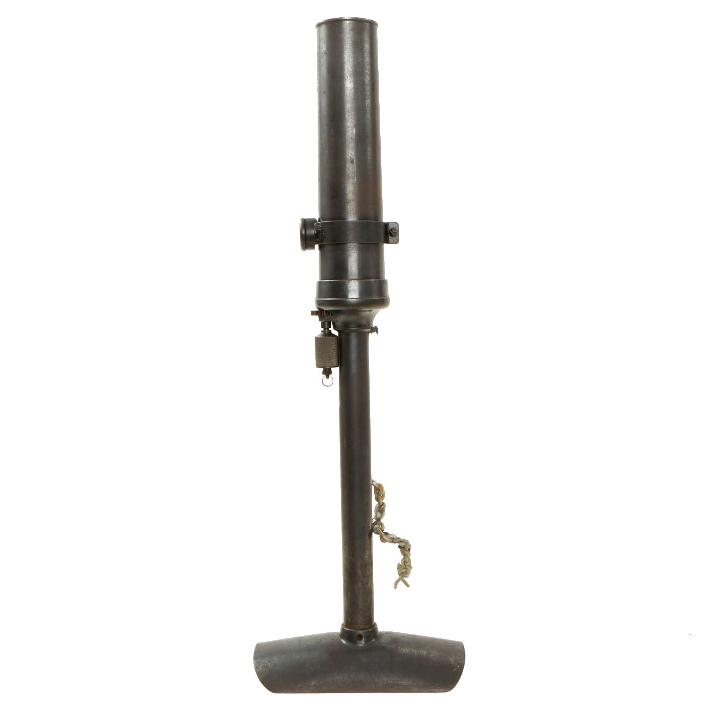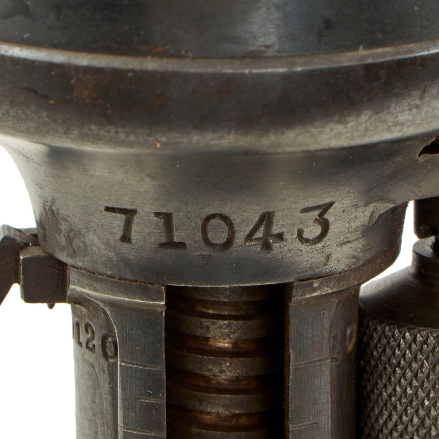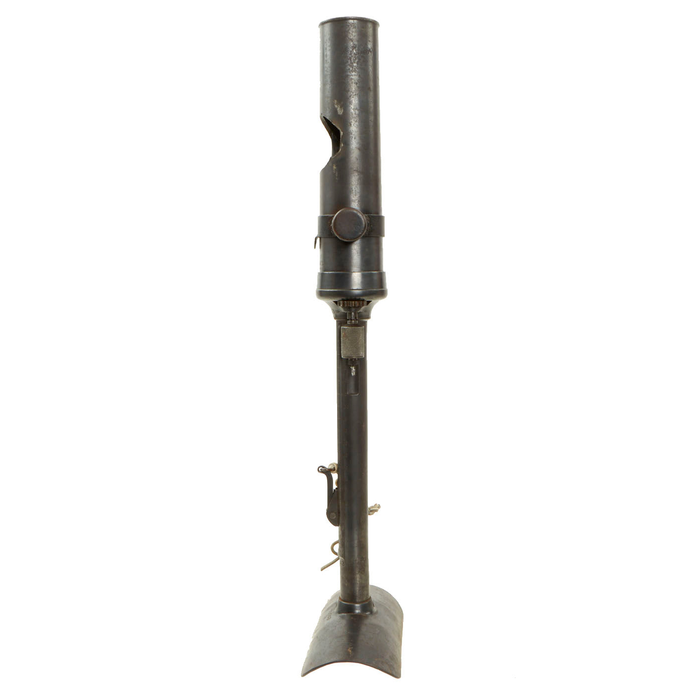 This very good example is nicely marked with serial number 71043, that is matched on the barrel, tube cup, support/range adjustment, and base assembly. Shortened number 043 and 71043 are on the other smaller components. The tube has been drilled with a bore-width hole and had the trigger rendered inoperable per ATF regulations to deactivate. The range adjustment gear is still present and functional, so the trigger can be moved up and down along with the inert firing assembly.