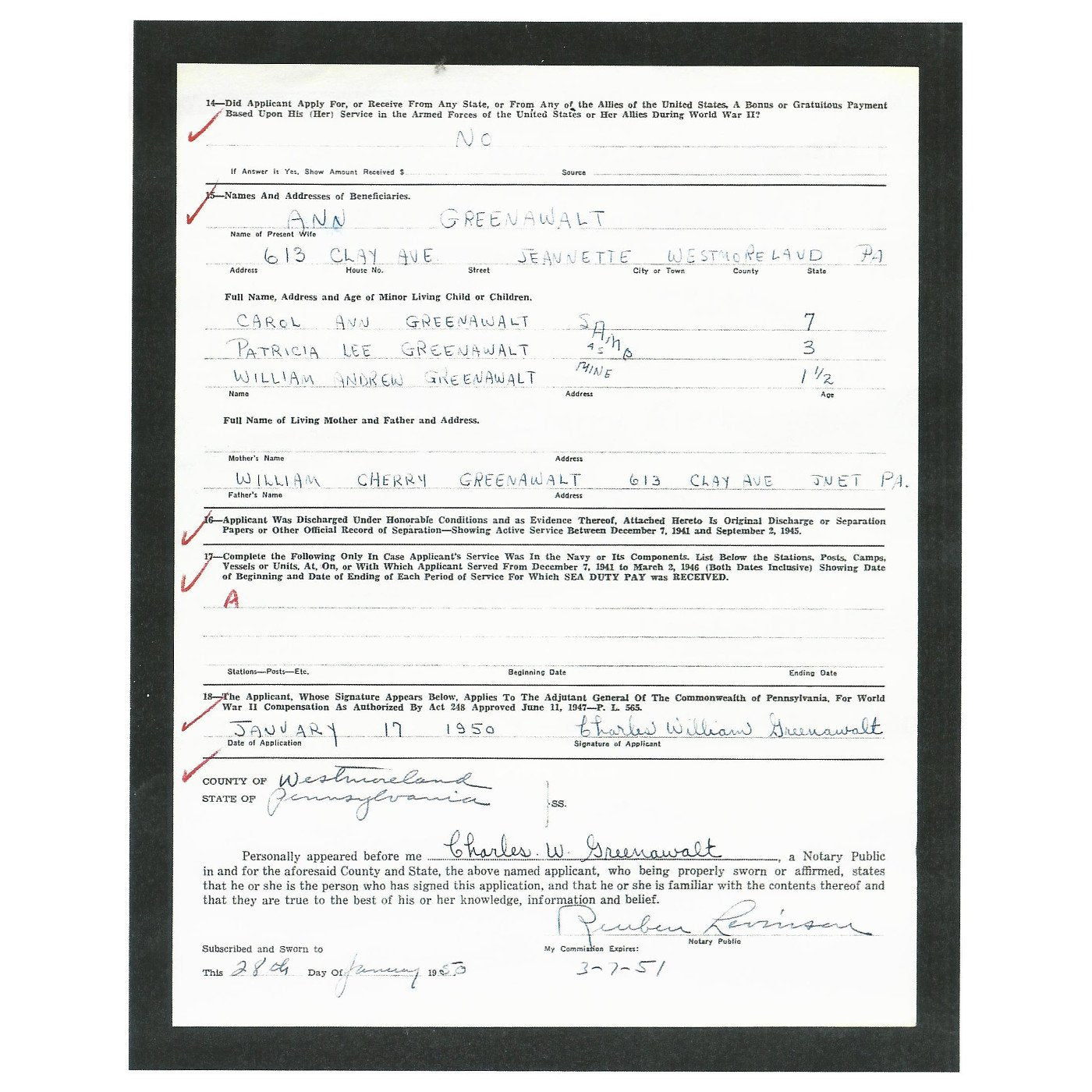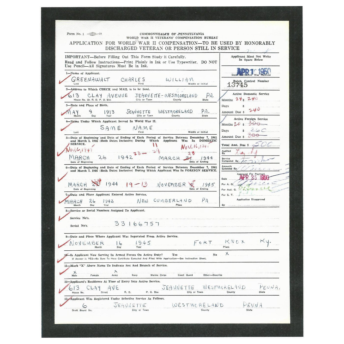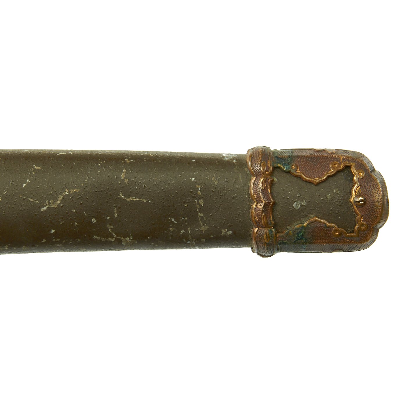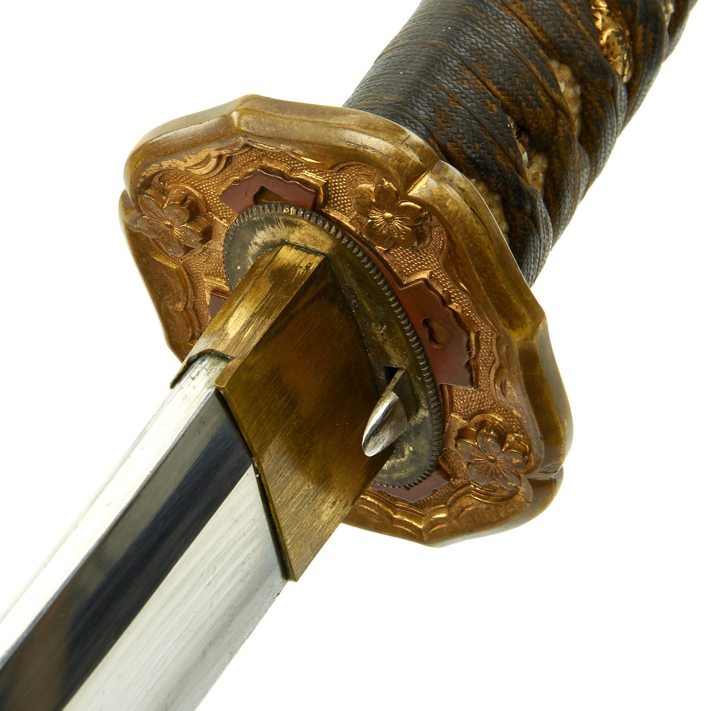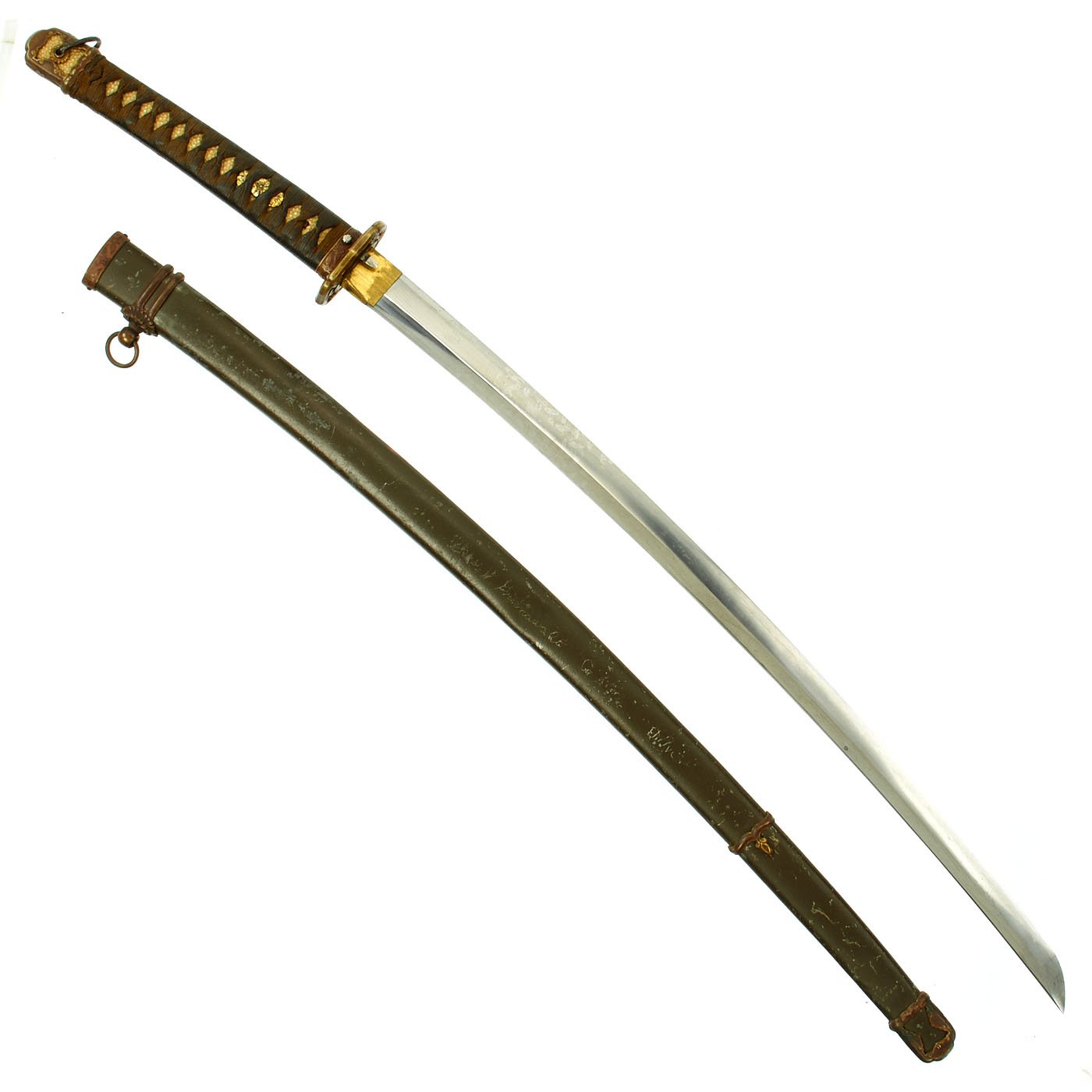 Original Item: Only One Available. Purchased directly from a collector, this is a very nice wartime production high grade Japanese officer Katana in the Type 94 Gunto (九四式軍刀 kyūyon-shiki guntō) setting. A Shin-Guntō (新軍刀, new military sword) is a weapon and symbol of rank used by the Imperial Japanese Army between the years of 1935 and 1945. This is a very nice example, and does show some use in the field. It was captured in the field by Pvt. Charles W. Greenawalt (A.S.N. 33166757), who scratched his name into the paint of the scabbard. Included are printouts of his registration card and pension forms.