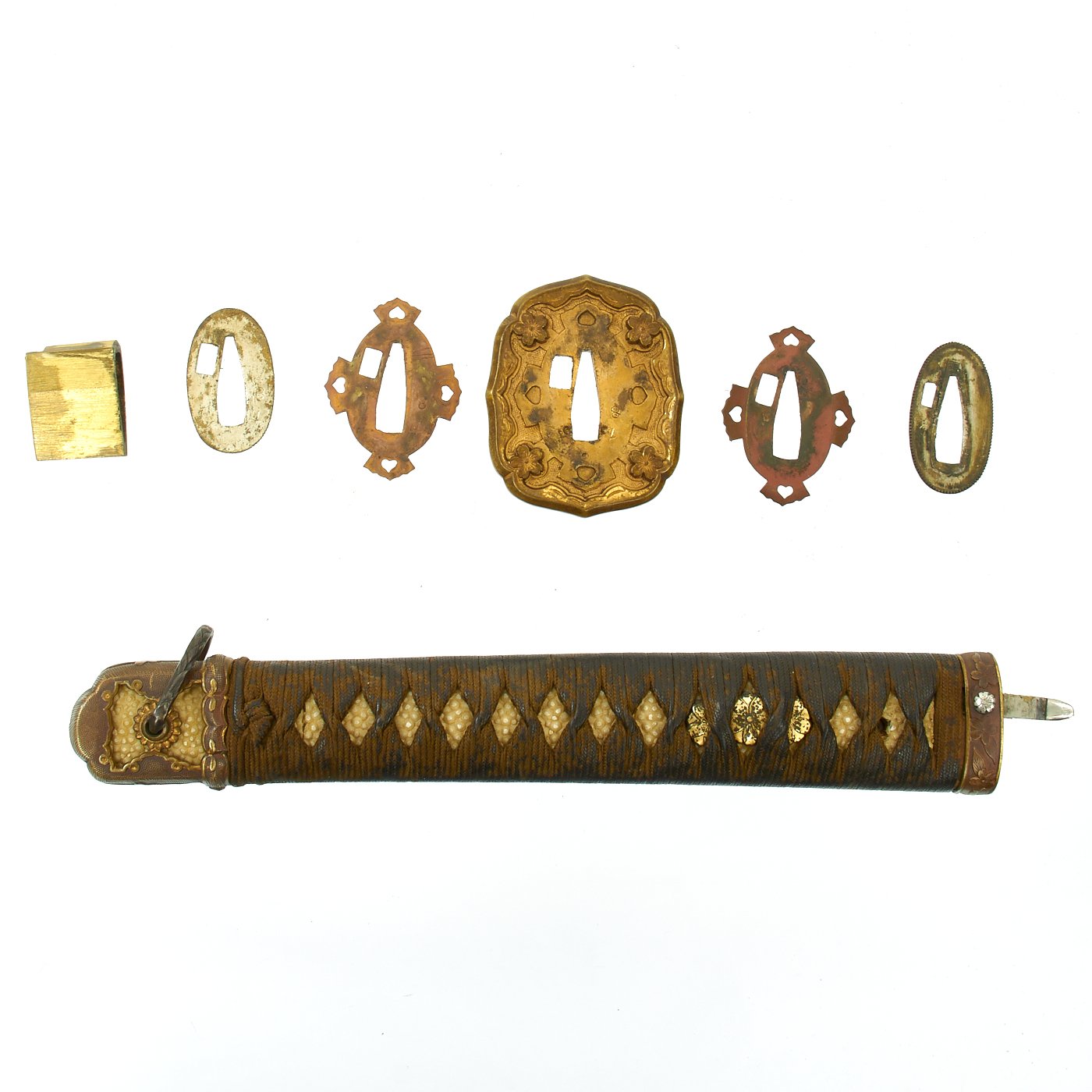 The fittings are all marked with western number 8 and Japanese number 九 (Kyu), or 9. This indicates that they are a matched set made specifically for this blade, and have not been "swapped out" over the years. Combinations of Western and Japanese numbers are common on fittings.