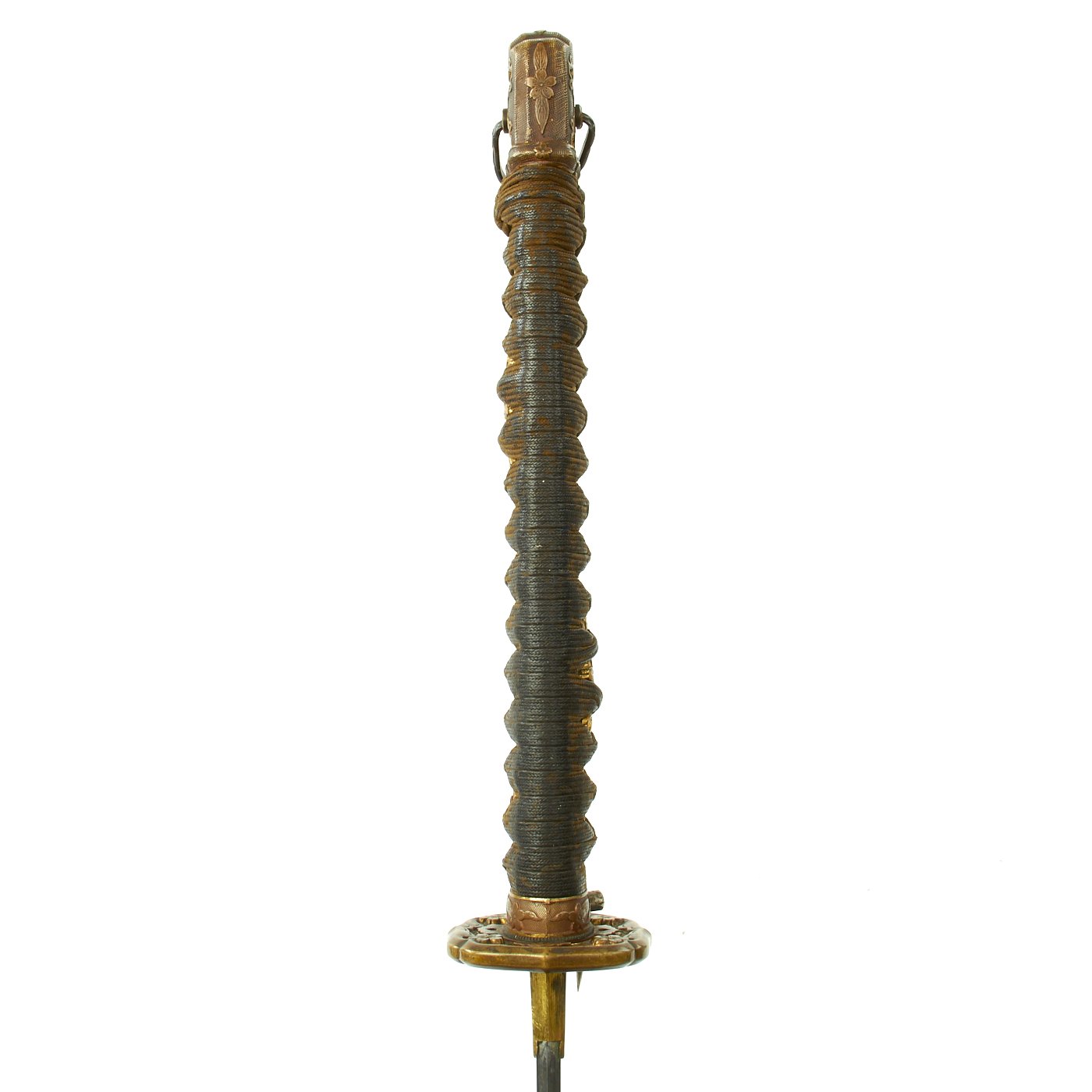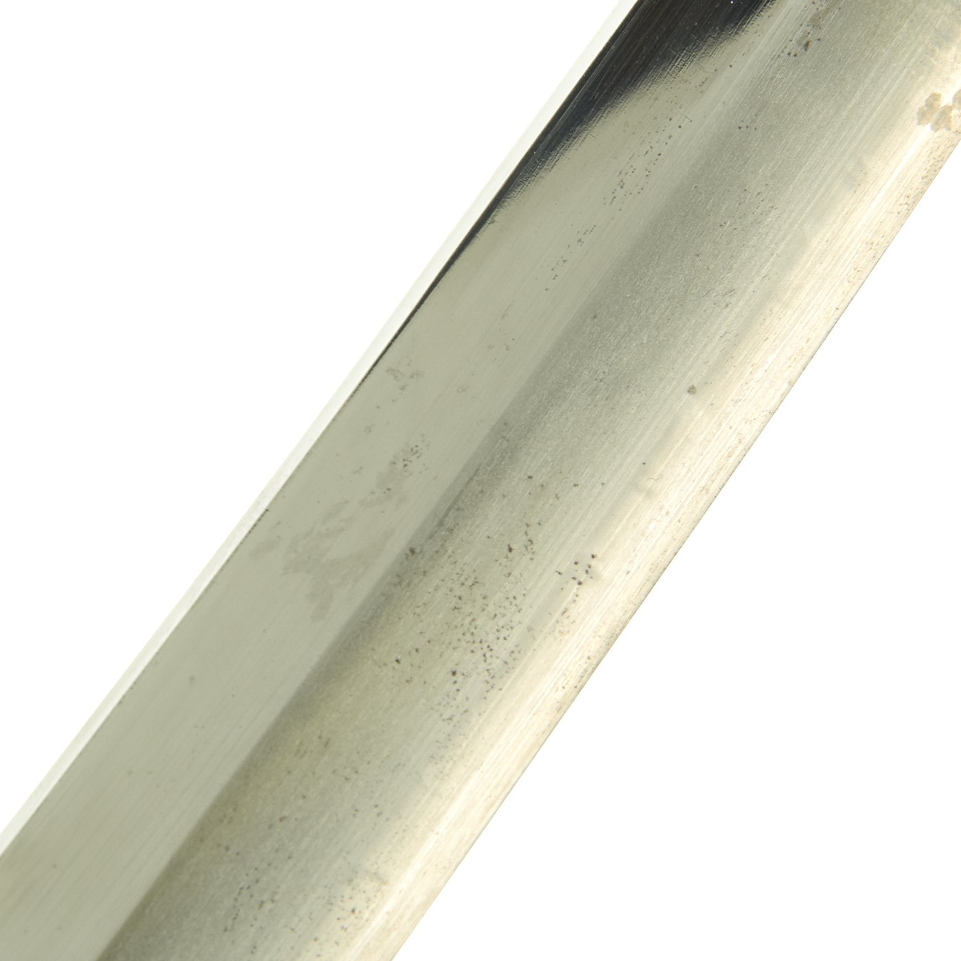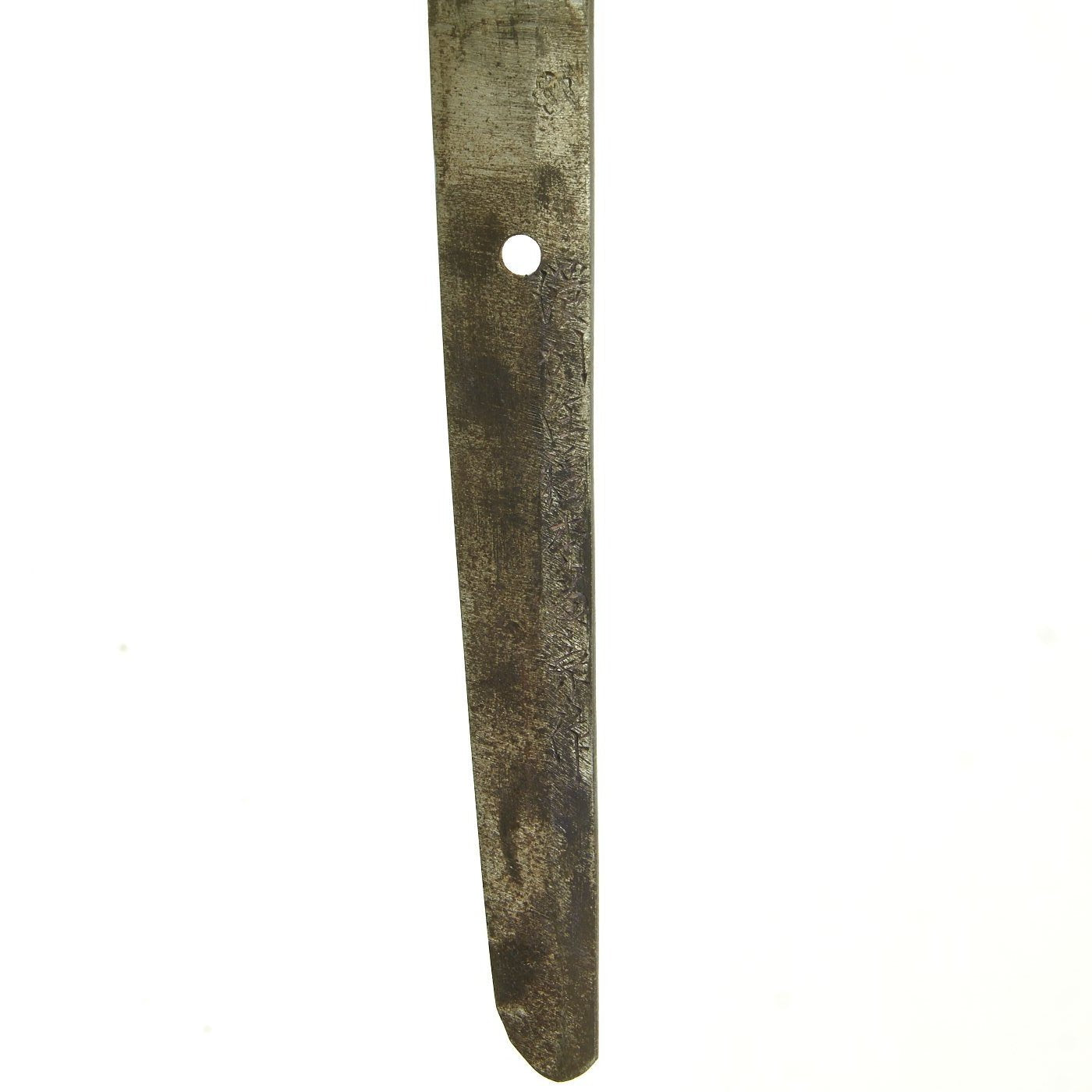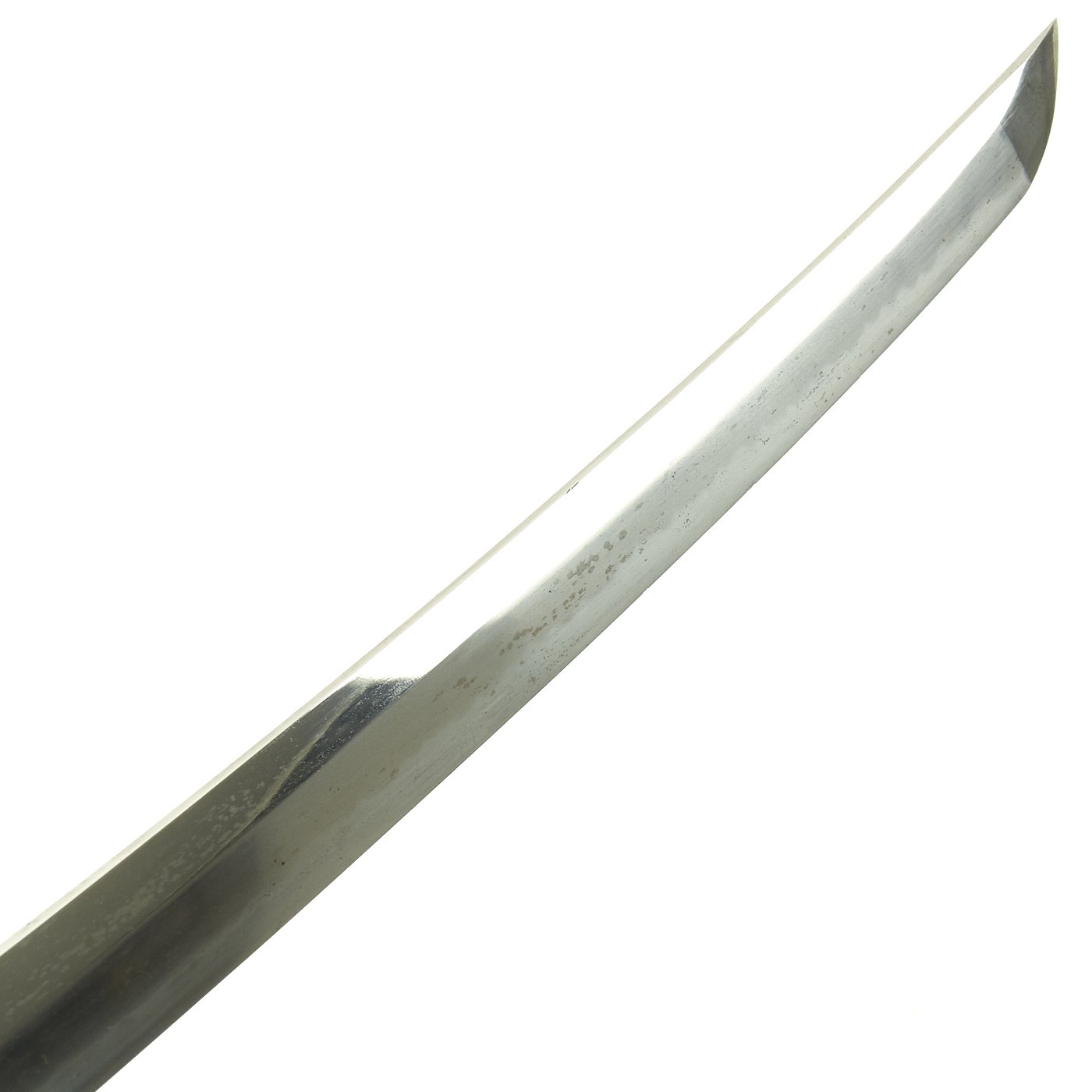 Offered in great condition, the blade is still very sharp and is nick free as far as we can tell. Overall the polish on the blade is good, with some areas of light staining from oxidation in places. Blade length is approximately 26 1/4 inches and overall length 37 1/2 inches. The tang is marked with some paint, but it does not match the number on the fittings from what we can see. The katana has a handmade blade with an asymmetrically rounded (haagari) tang, and a proper geometric kissaki (tip) with a clear yokote (division between body and tip). Temper line (hamon) is visible, and is of the zig zag (gunome) type. Light grain on blade is visible on the blade flat (ji).