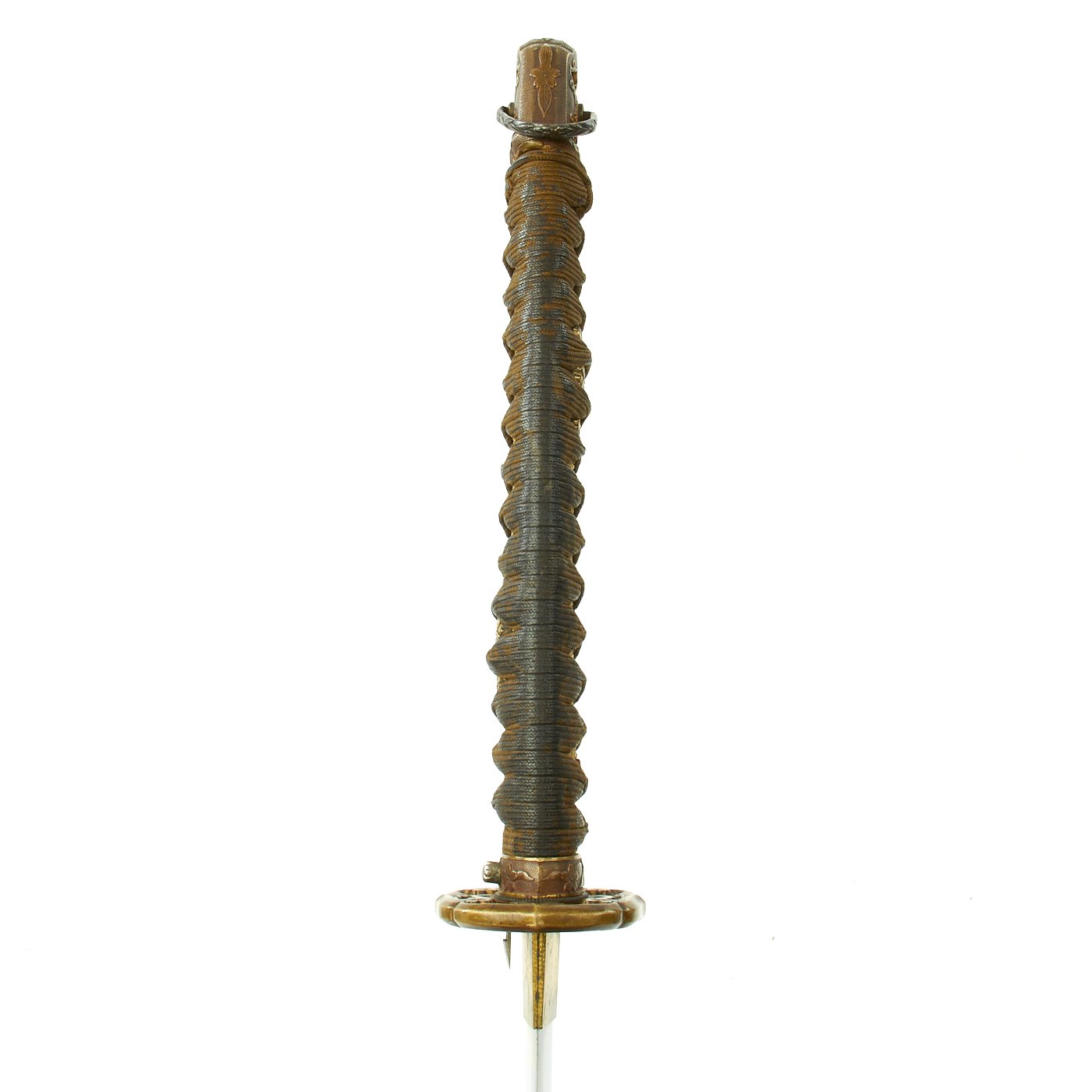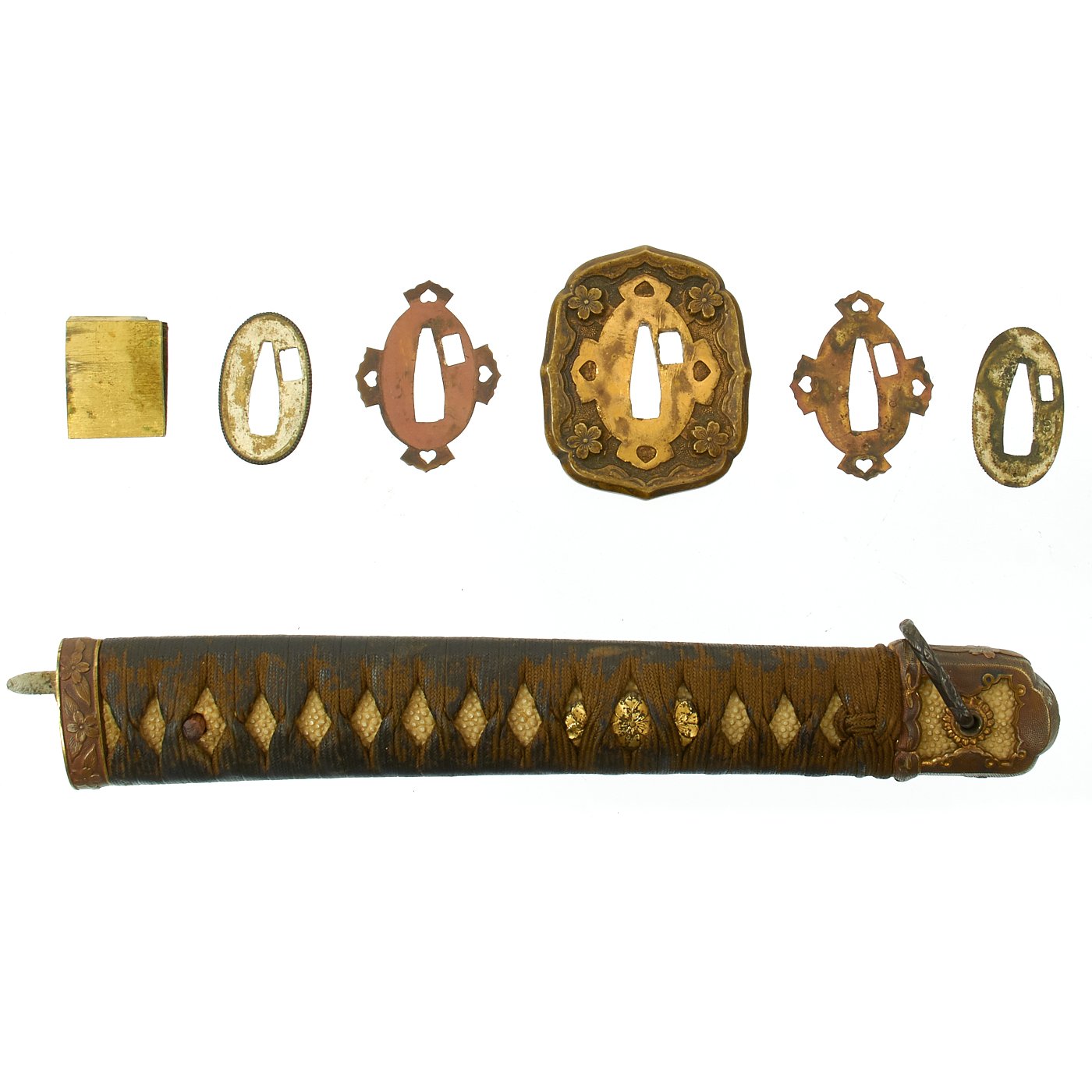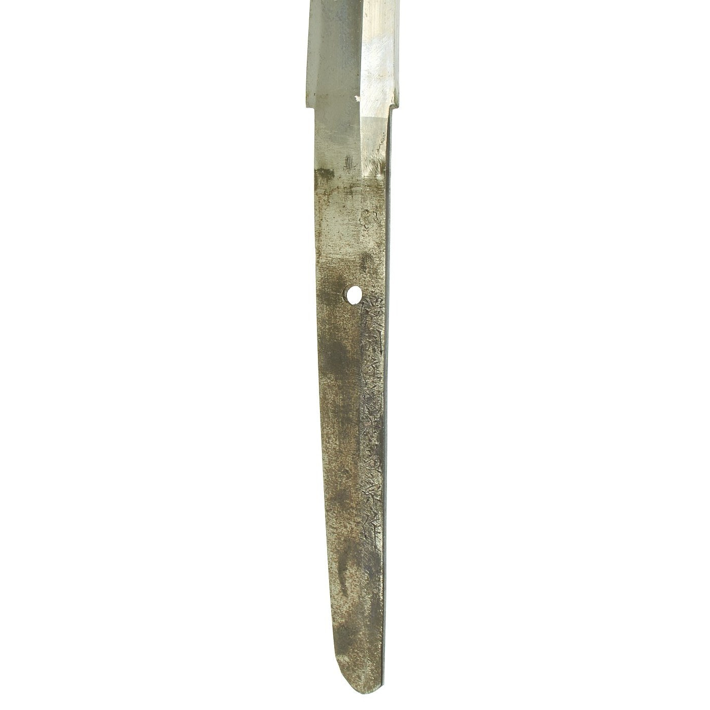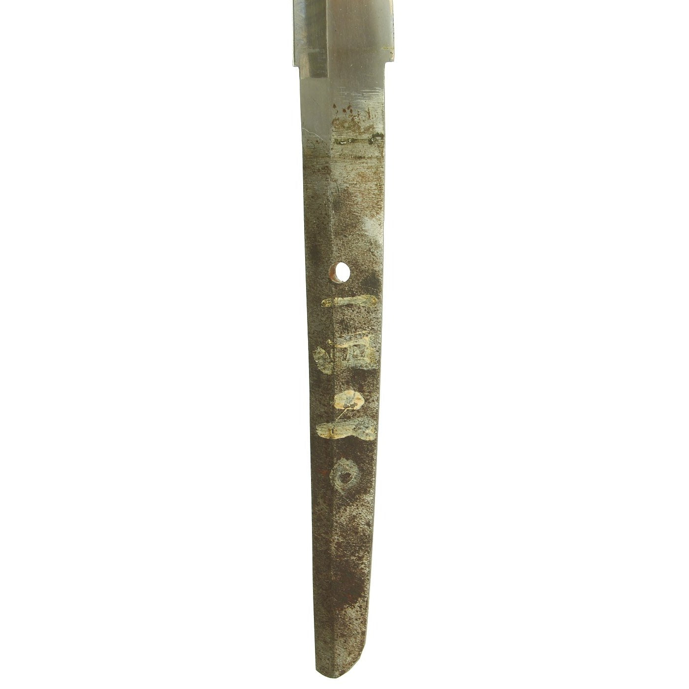 Offered in great condition, the blade is still very sharp and is nick free as far as we can tell. Overall the polish on the blade is good, with some areas of light staining from oxidation in places. Blade length is approximately 26 1/4 inches and overall length 37 1/2 inches. The tang is marked with some paint, but it does not match the number on the fittings from what we can see. The katana has a handmade blade with an asymmetrically rounded (haagari) tang, and a proper geometric kissaki (tip) with a clear yokote (division between body and tip). Temper line (hamon) is visible, and is of the zig zag (gunome) type. Light grain on blade is visible on the blade flat (ji).