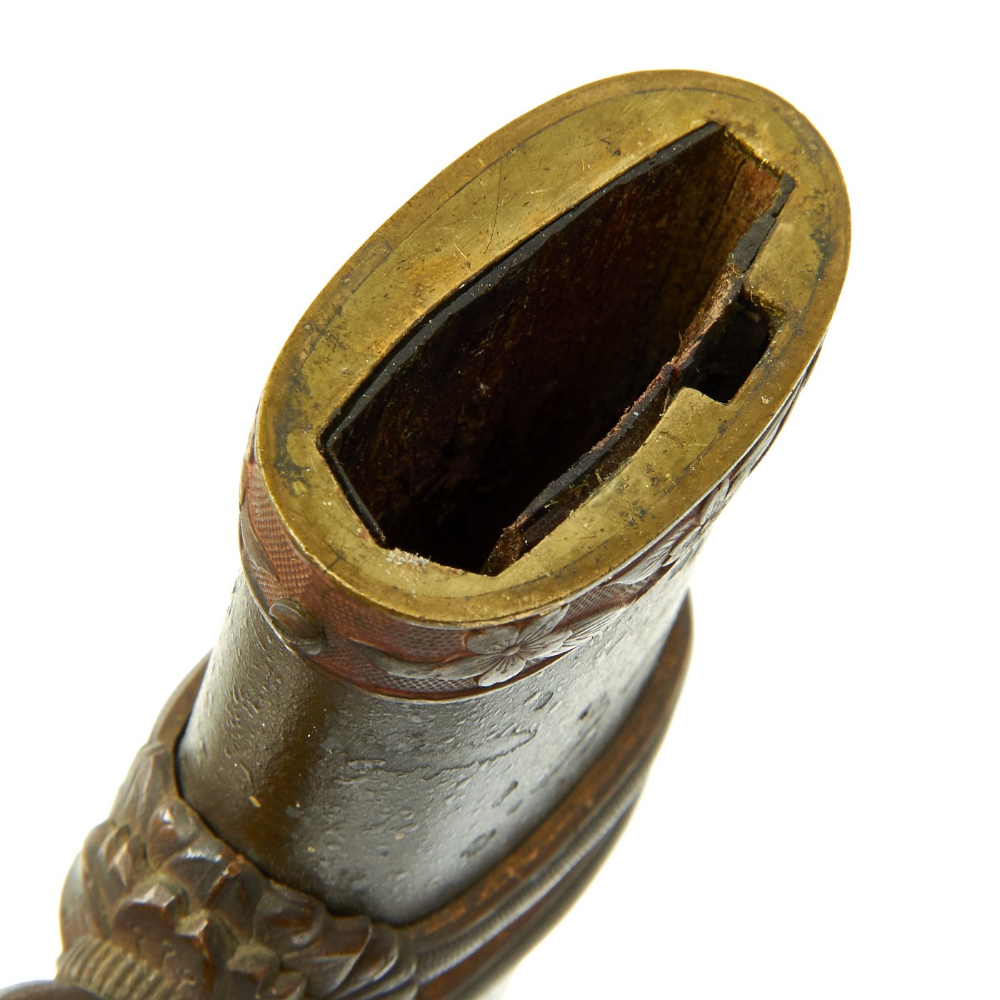 The blade mountings are the classic early WWII era Type 94 Army Shin-Gunto style, brass with gold accents. Round tsuba (cross guard) with brass Imperial Army cherry blossom menuki (grip decoration), and a nice Kabuto-Gane (Pommel Cap). The cross guard and pommel cap have matching cherry blossom motifs, which are also found on the scabbard fittings, and the fuchi (grip collar). There are 4 Seppa (spacers) around the cross guard to keep the fit tight, and all are inleted for the scabbard lock. The blade collar (habaki) looks to be brass alloy, maybe with some gilding.