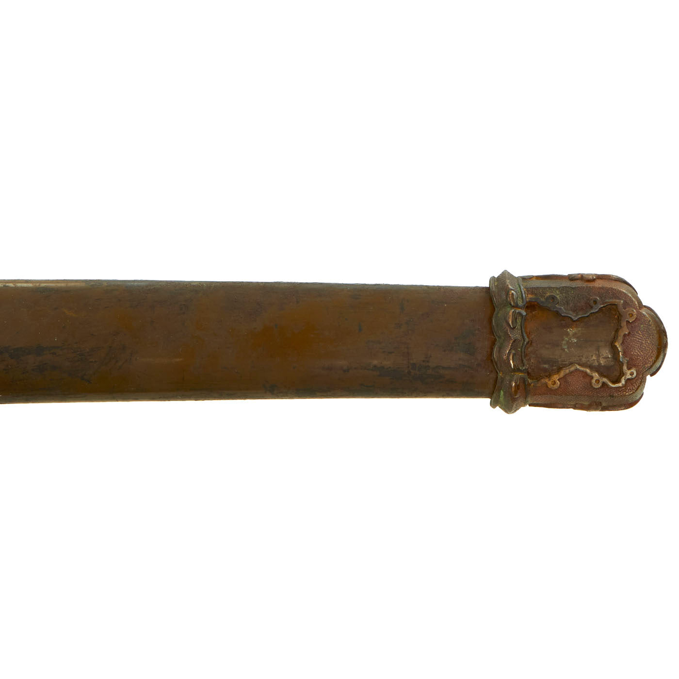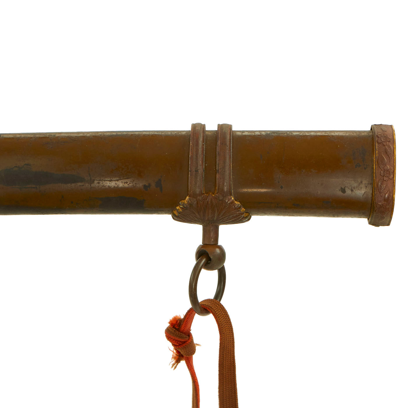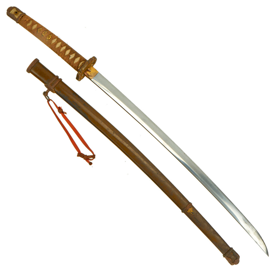 The tang of the blade is signed by the maker, and was made over 200 years ago during the Edo Period. It also has a battle worn red and brown Officer's Tassel, which indicates a "Field Grade" officer, which in the Imperial Japanese army were the 陸軍少佐 (Rikugun-Shōsa or Major), 陸軍中佐 (Rikugun-Chūsa or Lt. Col.), and 陸軍大佐 (Rikugun-Taisa or Colonel). The higher grade fittings and old blade definitely indicate this was for an officer of some importance, and possibly a samurai lineage.
