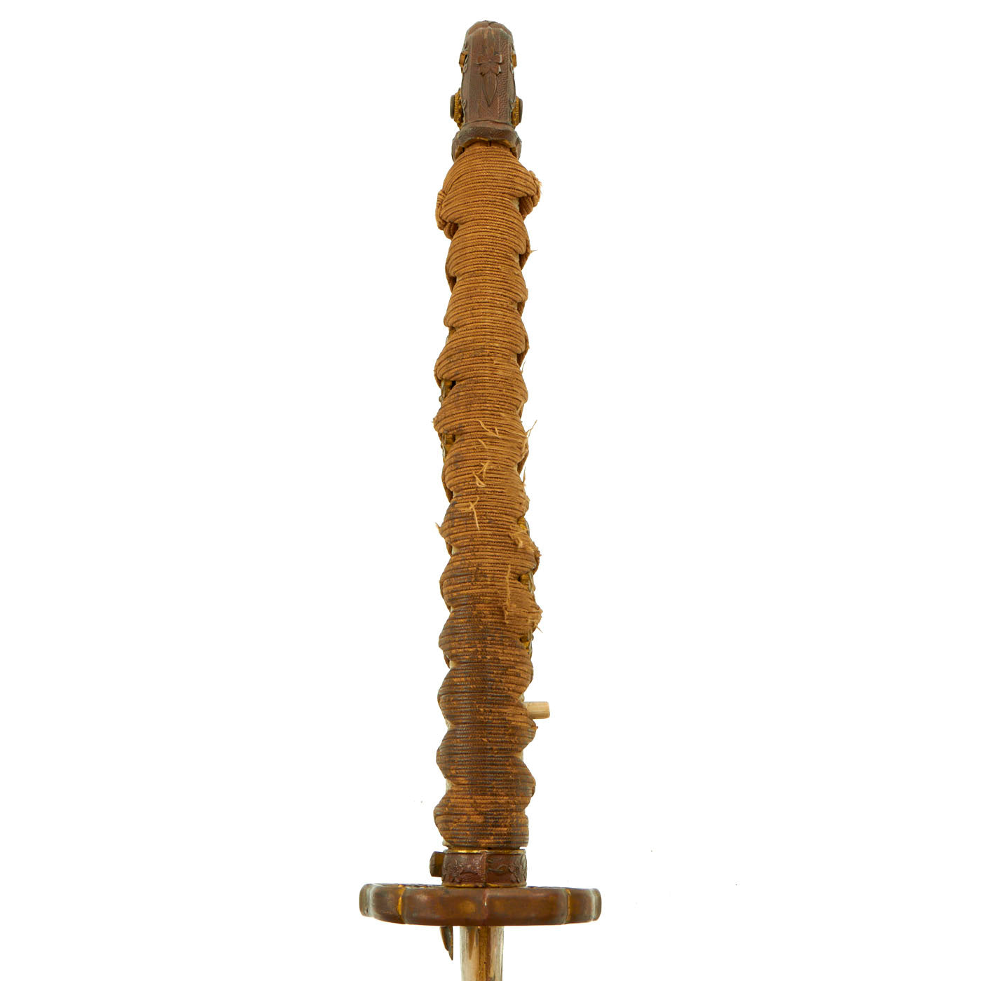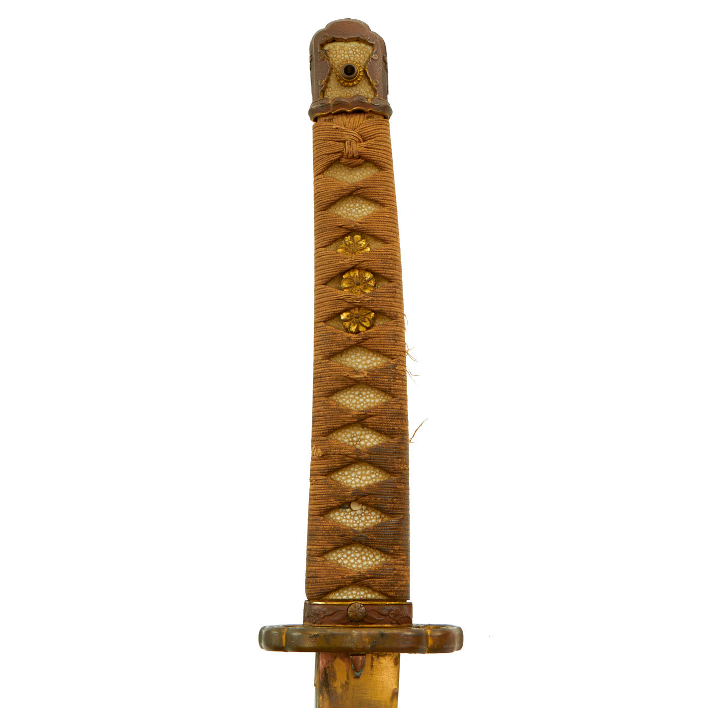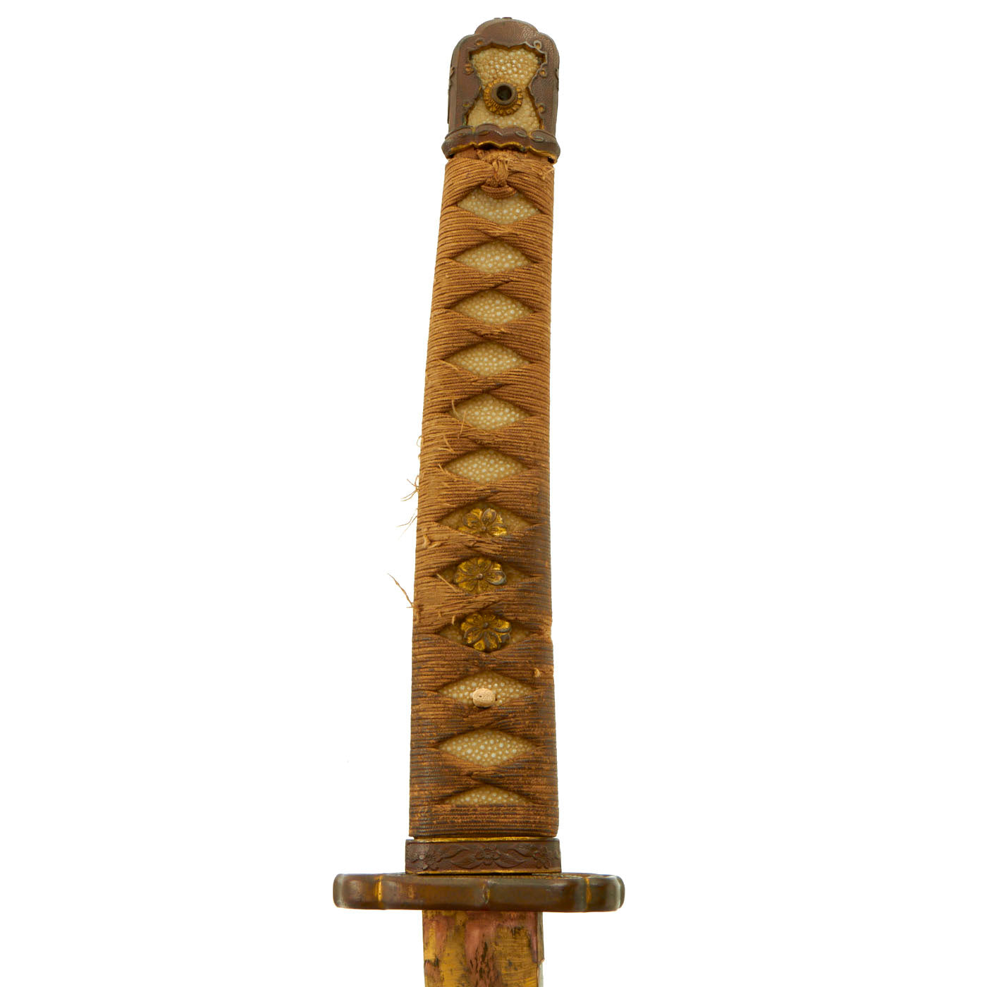 The handle has an excellent stingray skin (Sa-Me) grip, with the correct Ito (cloth binding), which shows light wear. It also looks to be made of higher grade material, and the handle itself is wider than we usually see. When we received this katana, the tsuka was held in place by a pressed in brass mekugi, which research shows was used on some high grade officer katanas. We have removed this, which requires the use of a press, and it is included with the sword. A replacement was fashioned from some bamboo that we had on hand. There is no metal or rope loop through the kabuto-gane end fitting.
