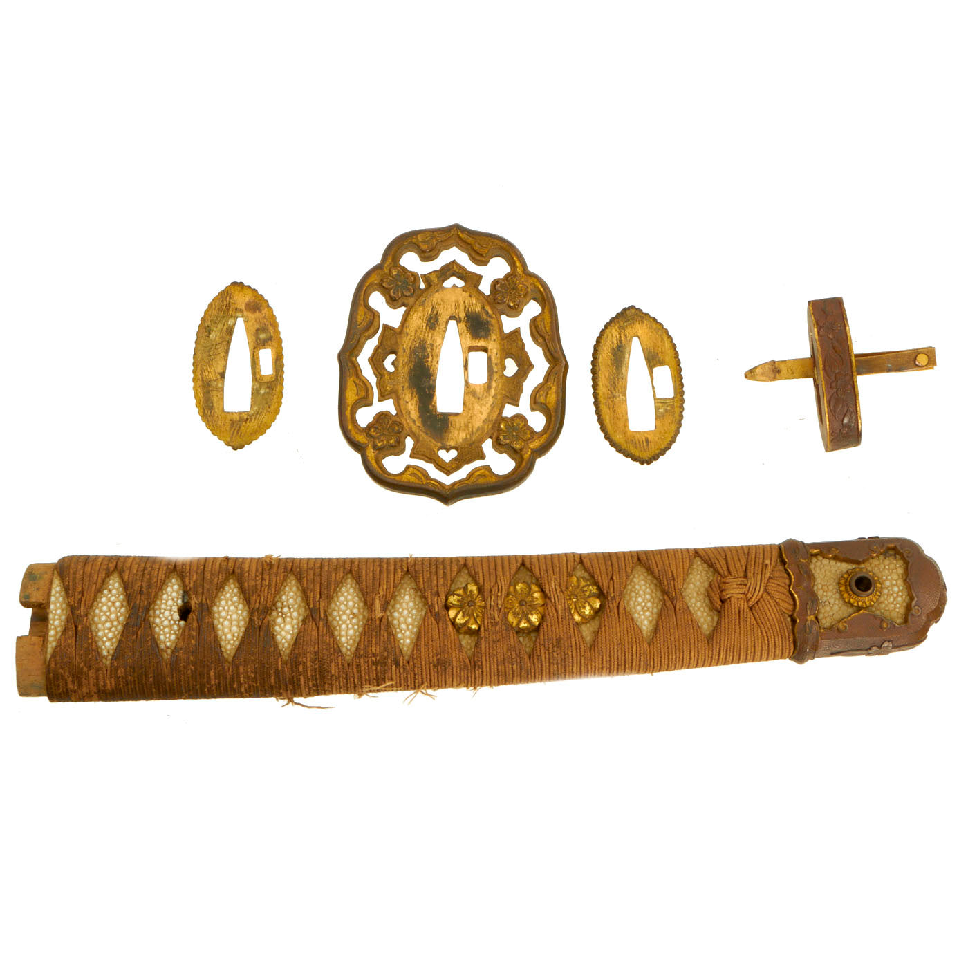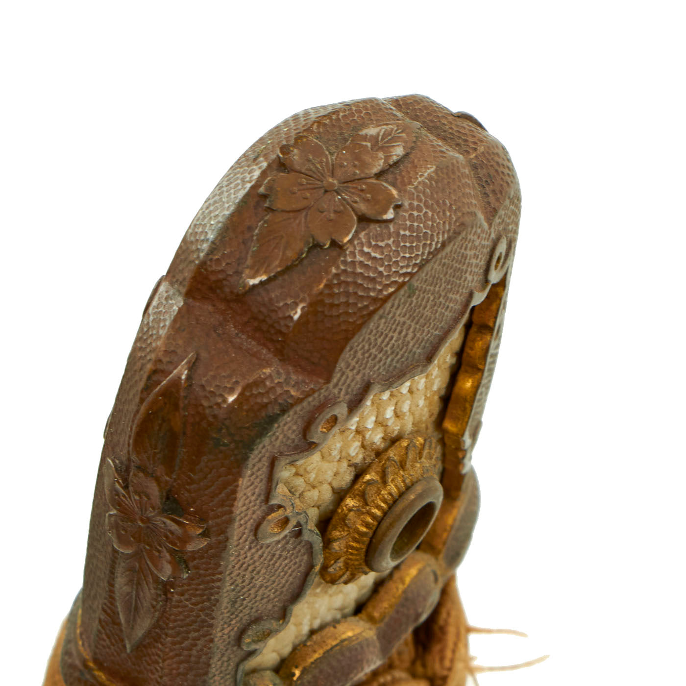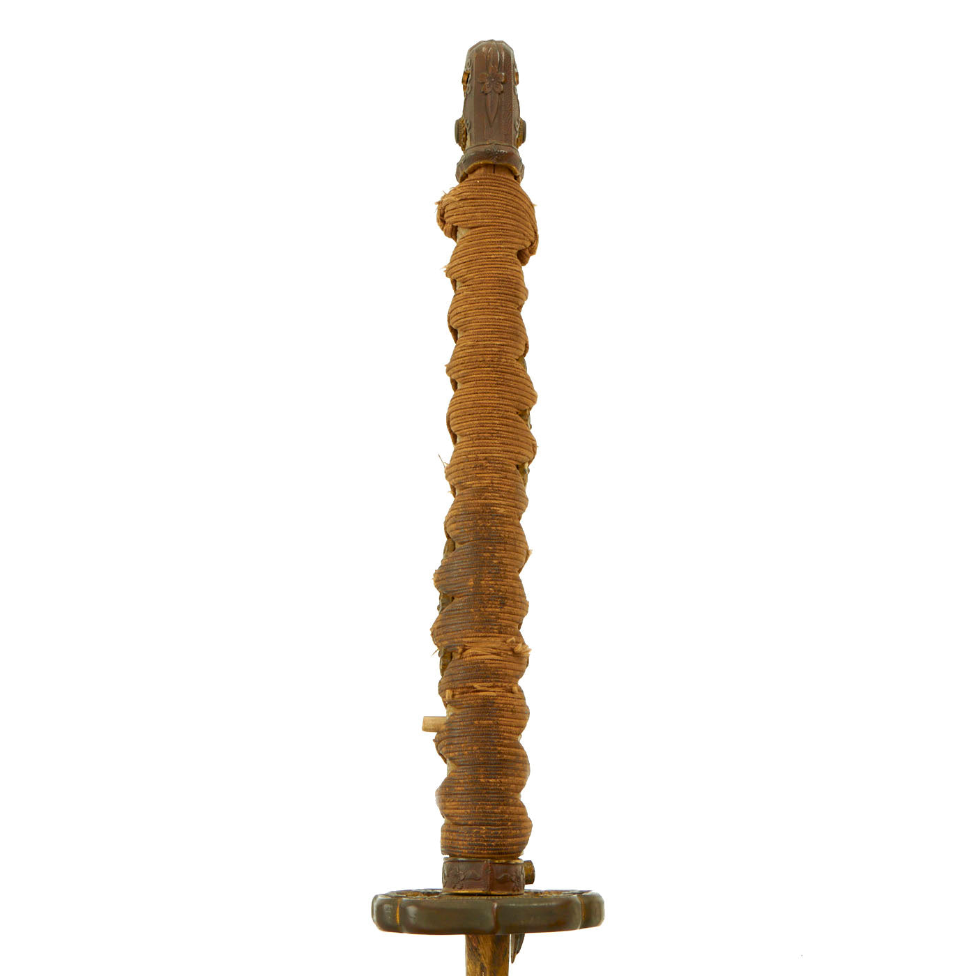 The handle has an excellent stingray skin (Sa-Me) grip, with the correct Ito (cloth binding), which shows light wear. It also looks to be made of higher grade material, and the handle itself is wider than we usually see. When we received this katana, the tsuka was held in place by a pressed in brass mekugi, which research shows was used on some high grade officer katanas. We have removed this, which requires the use of a press, and it is included with the sword. A replacement was fashioned from some bamboo that we had on hand. There is no metal or rope loop through the kabuto-gane end fitting.