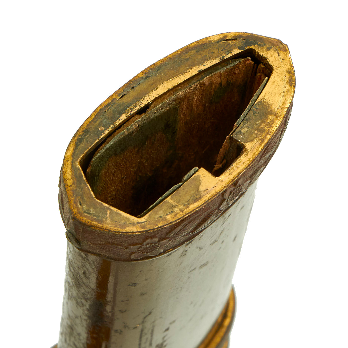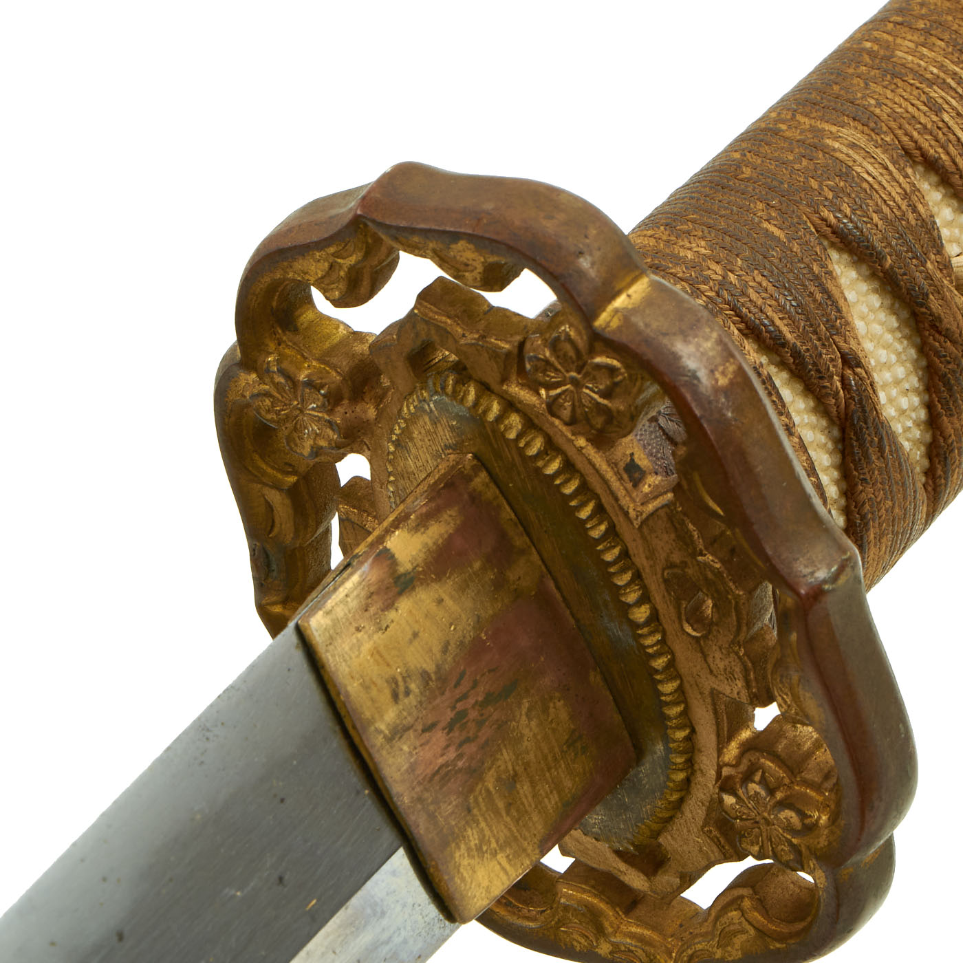 The blade mountings are the classic early / pre WWII era High grade Type 94 Army Shin-Gunto style, brass with gilt accents. The rounded perforated "quince" (MOKKO GATA) shaped tsuba (cross guard) indicates it was made for a higher rank officer. The tsuka (handle) has brass Imperial Army cherry blossom menuki (grip decorations), and a nice Kabuto-Gane (Pommel Cap), though it is loose. The cross guard and pommel cap have matching cherry blossom motifs, which are also found on the scabbard fittings, and the fuchi (grip collar). There is also a lot of the original browned finish with gilt highlights present, something we rarely see. There are 2 thick brass Seppa (spacers) around the cross guard to keep the fit tight. The tsuba and seppa are all inlet for the scabbard lock, which is still present and functional. The blade collar (habaki) is gilt copper, and is the usual type seen on Edo period blades.
