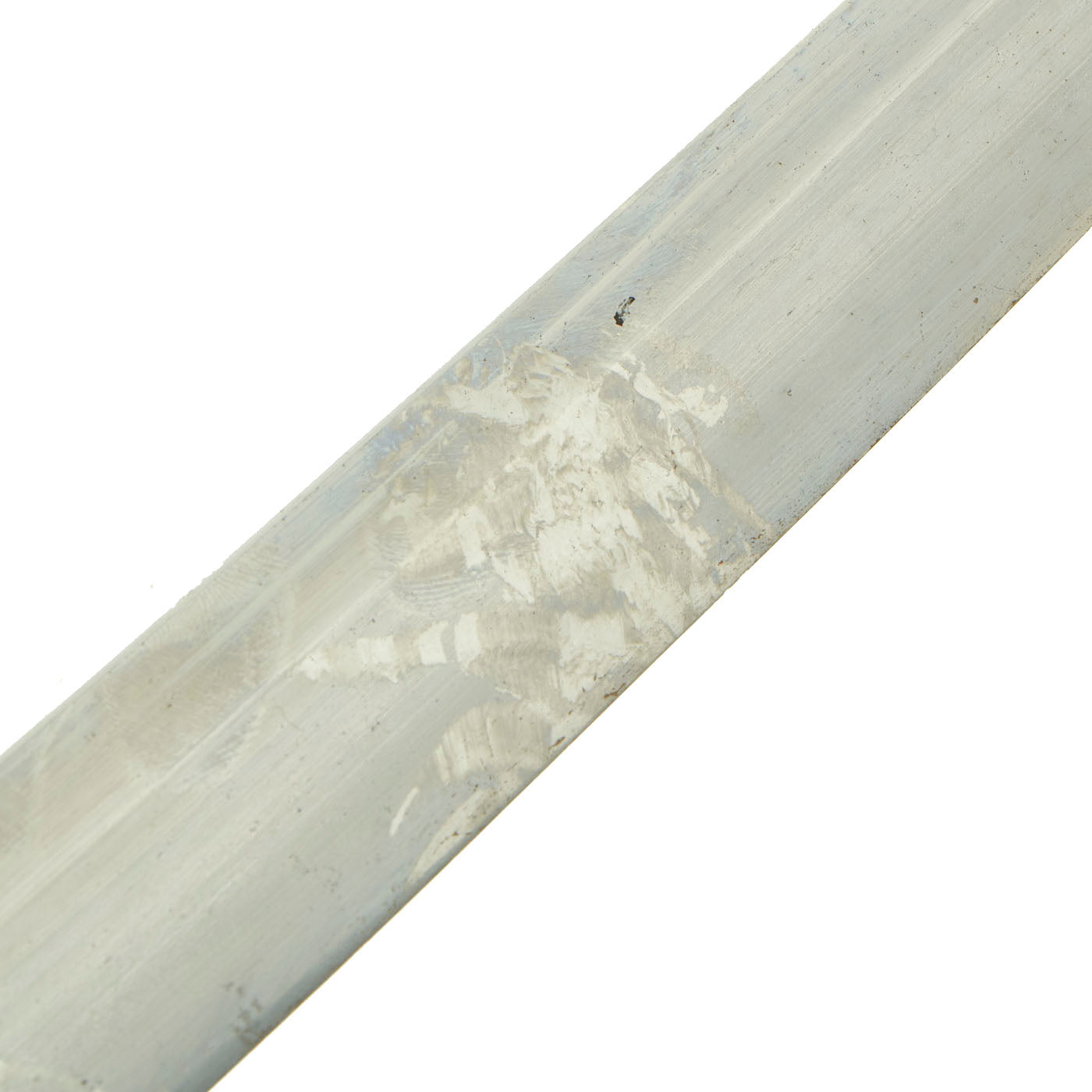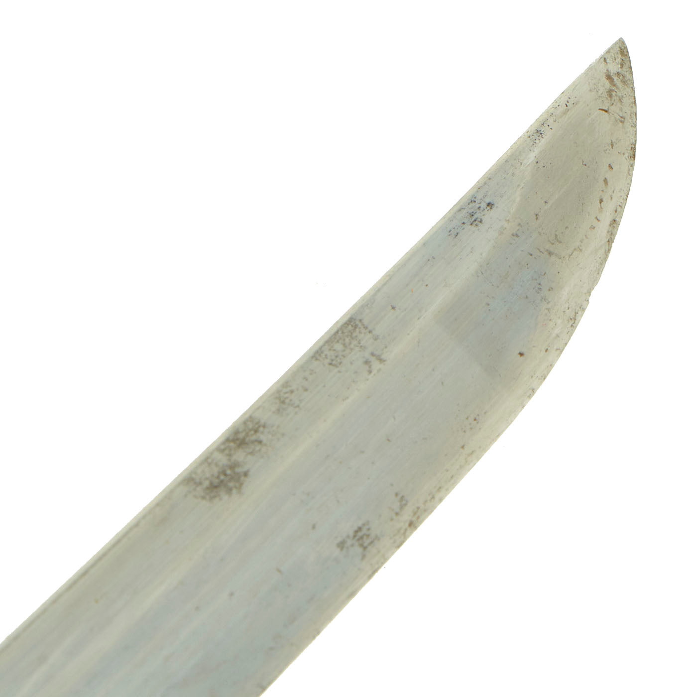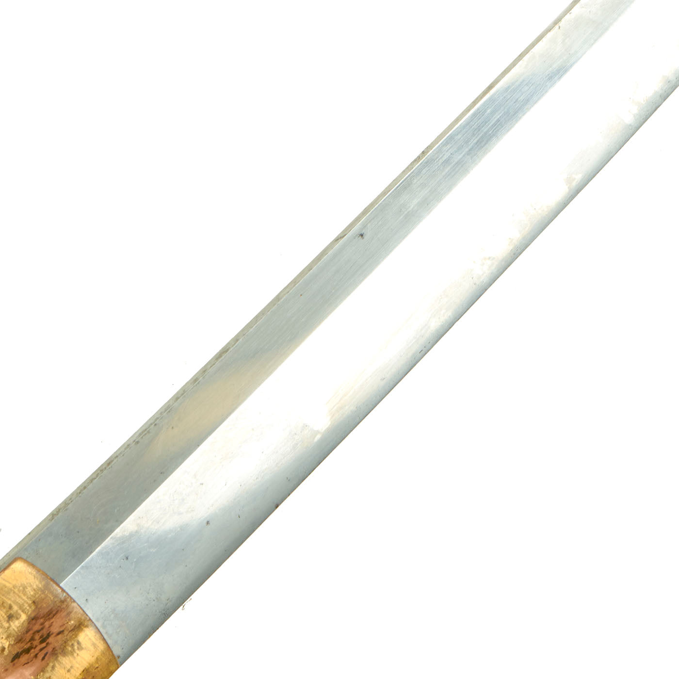 - Blade wounds (kizu) or lamination artifacts are present on the blade. Both ware (lamination lines) and fukure (carbon pits) are visible.