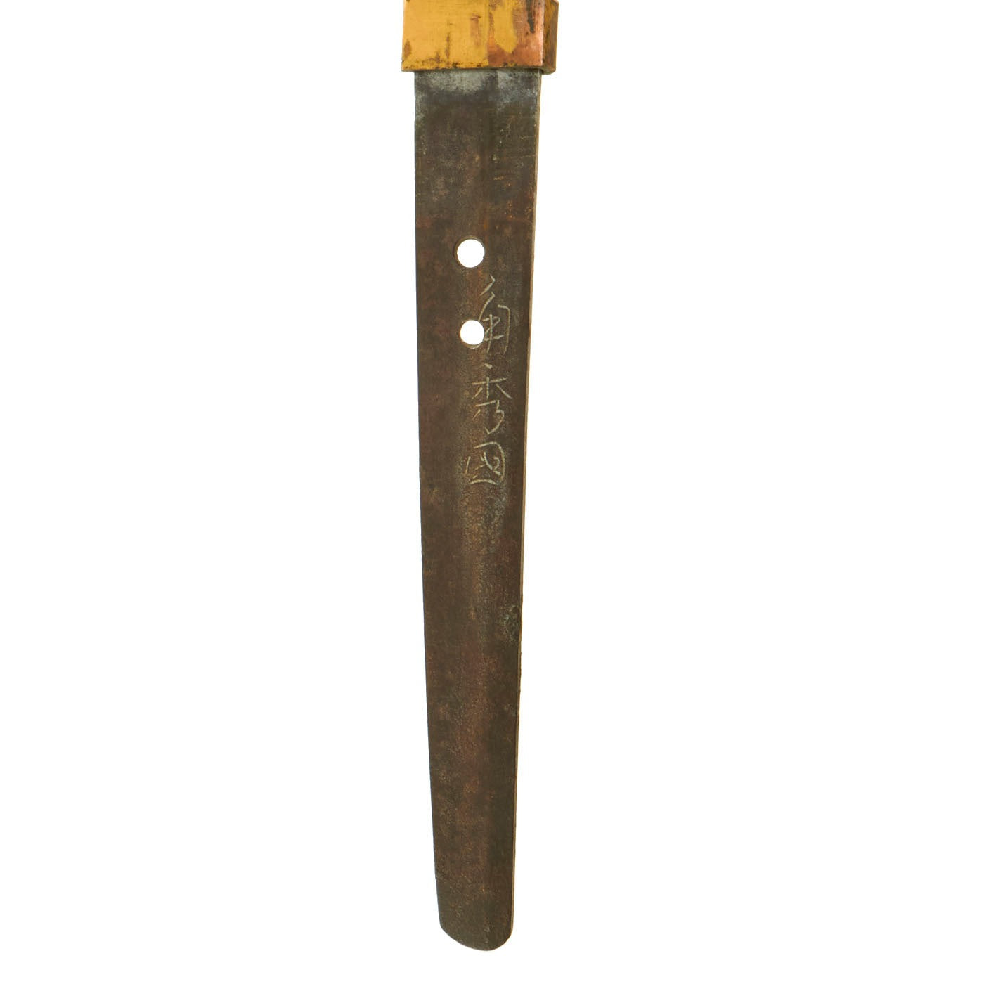 The blade on this example was hand forged, and the tang of the blade is signed (Mei) with the characters 角 秀 國 , read as KAKU HIDEKUNI. This smith was active during the KANSEI (寛政) era, which lasted January 1789 through February 1801, and was based in IWASHIRO (岩代) province. They were a member of the large Suishinshi Masahide School of Japanese swordmaking, and are ranked 15 by Hawley, and ¥3M by Toko Taikan. They are not a well-known smith, but definitely held in some regard.