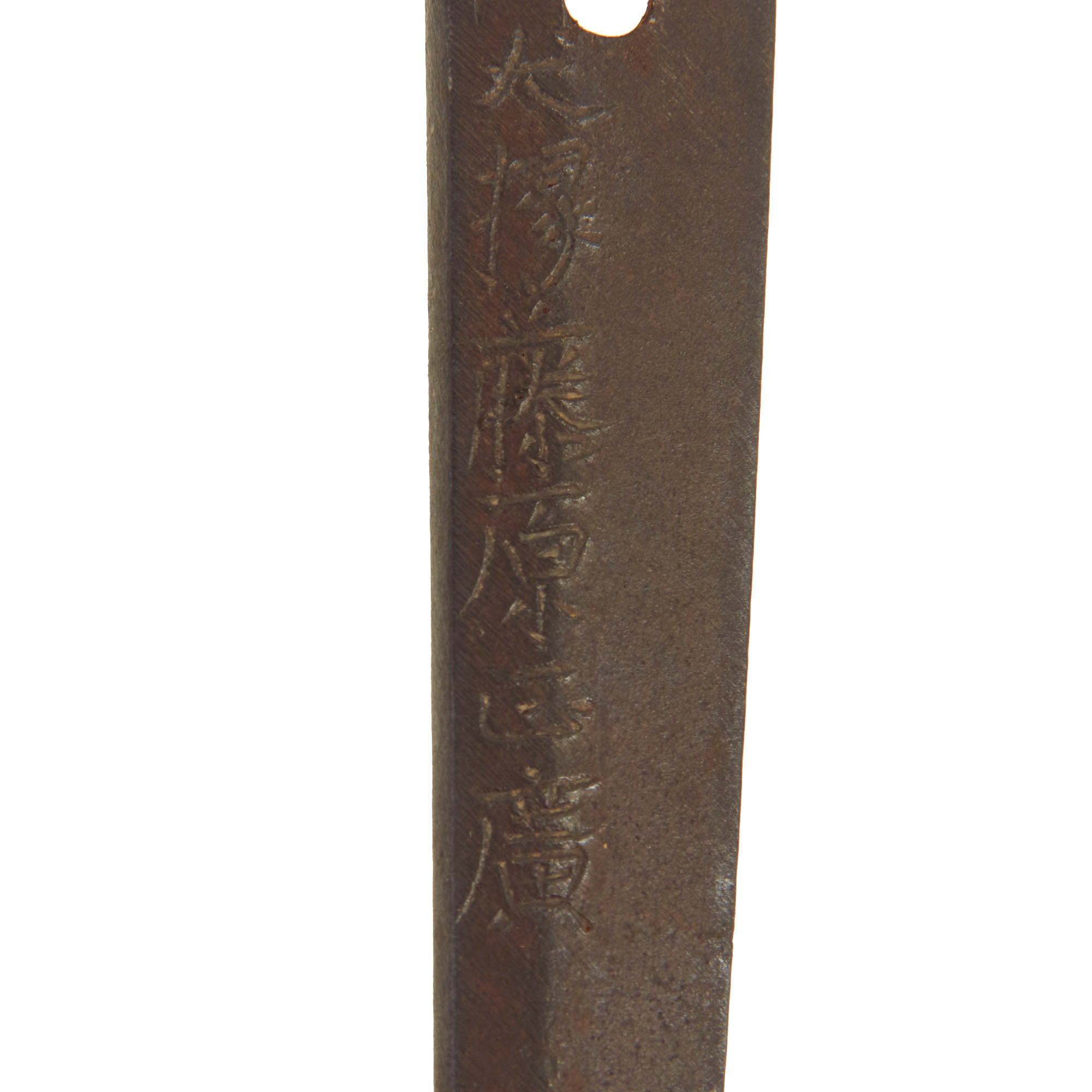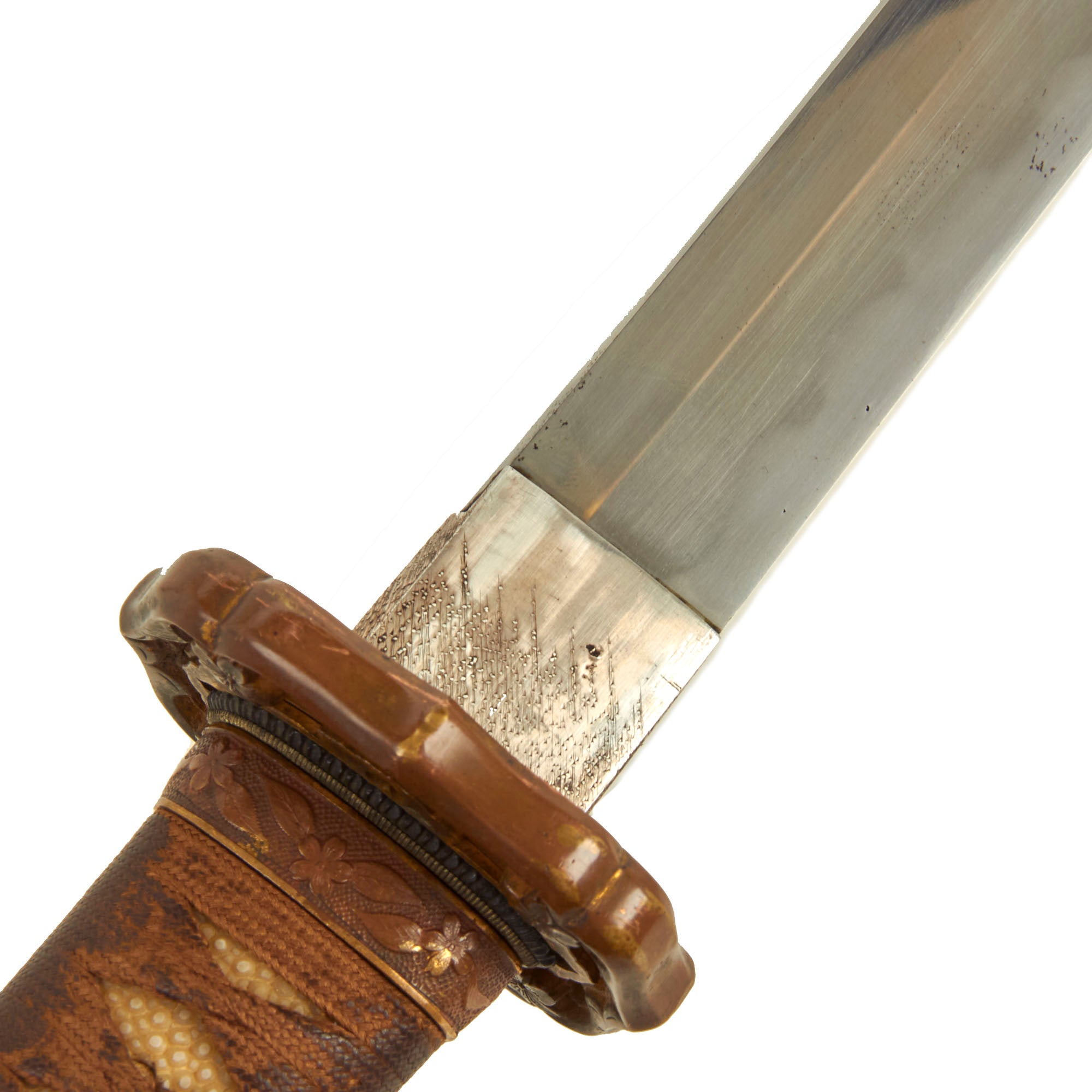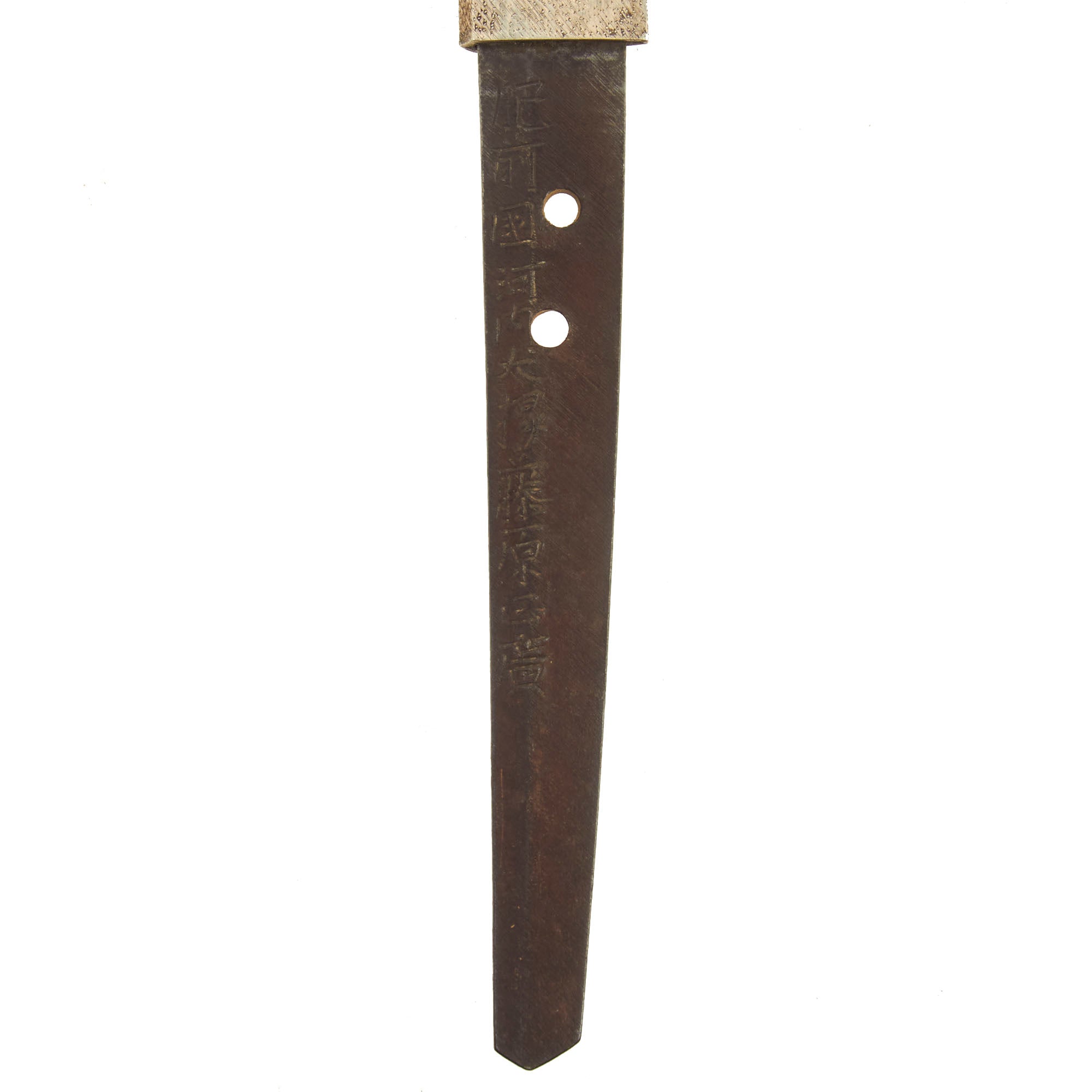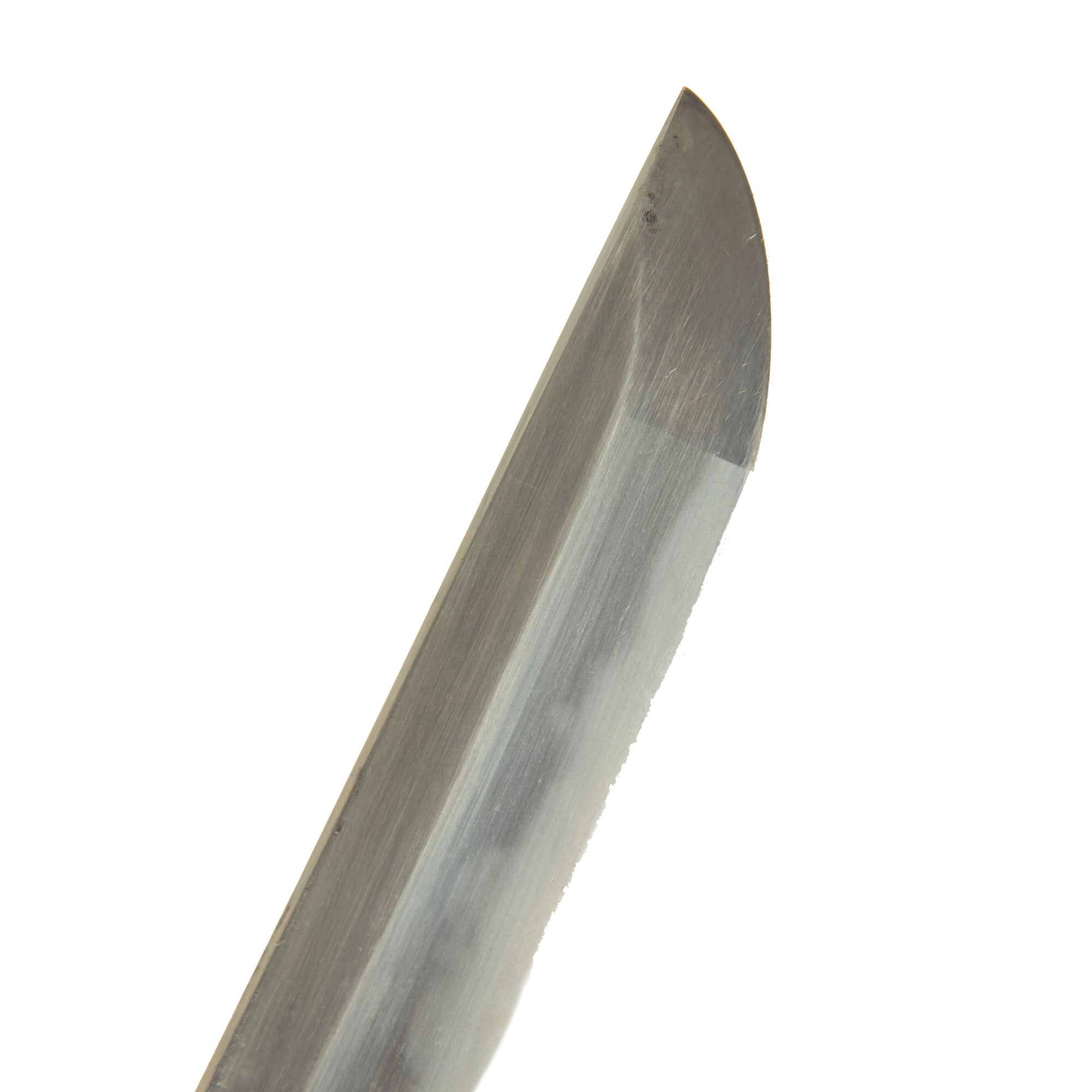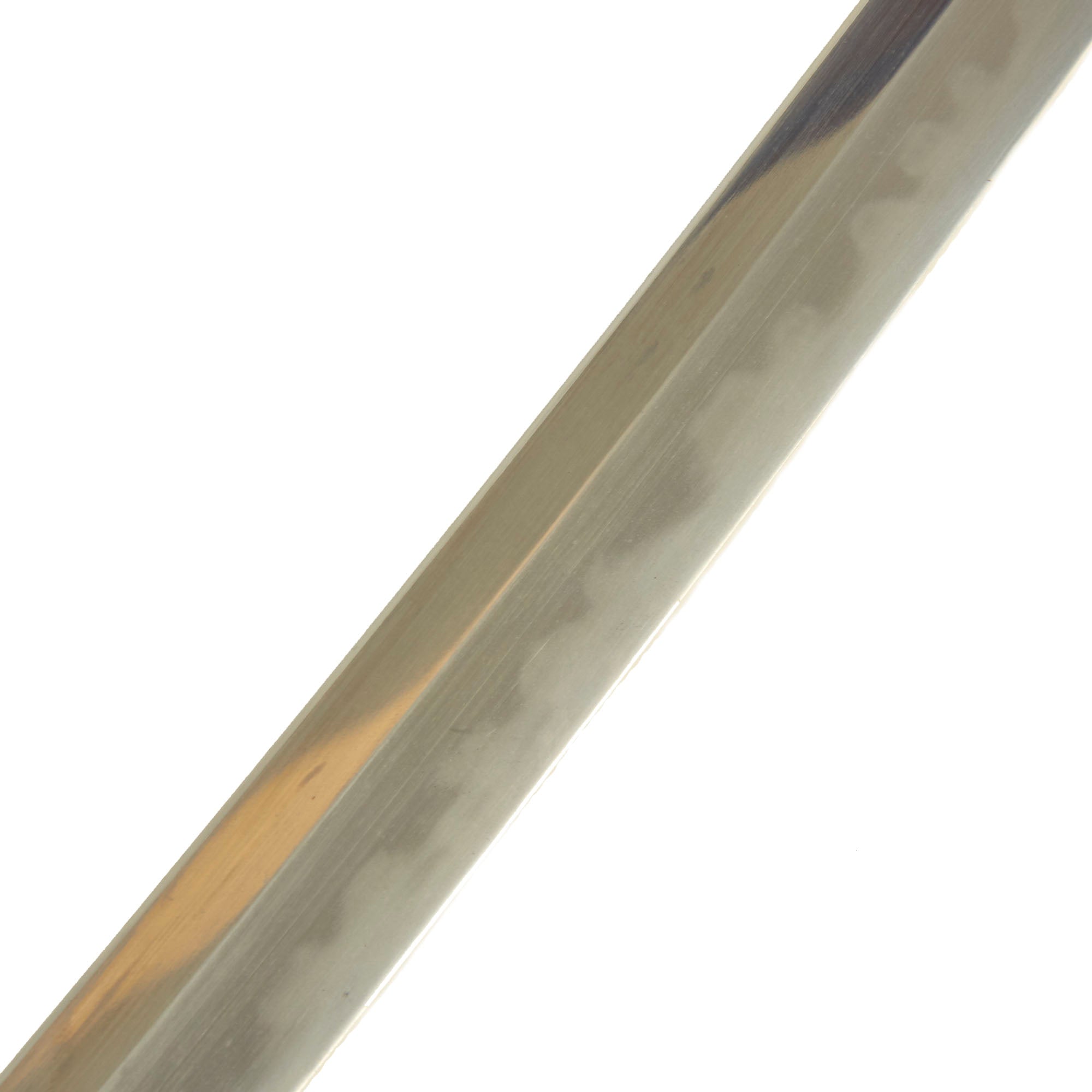 Offered in excellent condition, the blade is still quite sharp and looks fantastic. The edge is dent free, and there are just a few light scuffs on the surface. Overall the polish is excellent, with just a few areas of degradation due to oxidation or wear. There are a few areas of light oxidation at the very spine of the blade. With the great polish, the aspects of the temper line are fully visible, iridescent in the light. Unfortunately it is nearly impossible to catch the true beauty of this blade with photographs. The sword is a bit on the long side, with a blade length of approximately 26 3/4 inches and overall length of 38 inches. The katana has a handmade blade with a Futsu 普通 (regular) Nakago (tang) with a Iriyamagata (asymmetrical pointed) nakago-jiri (tang tip).