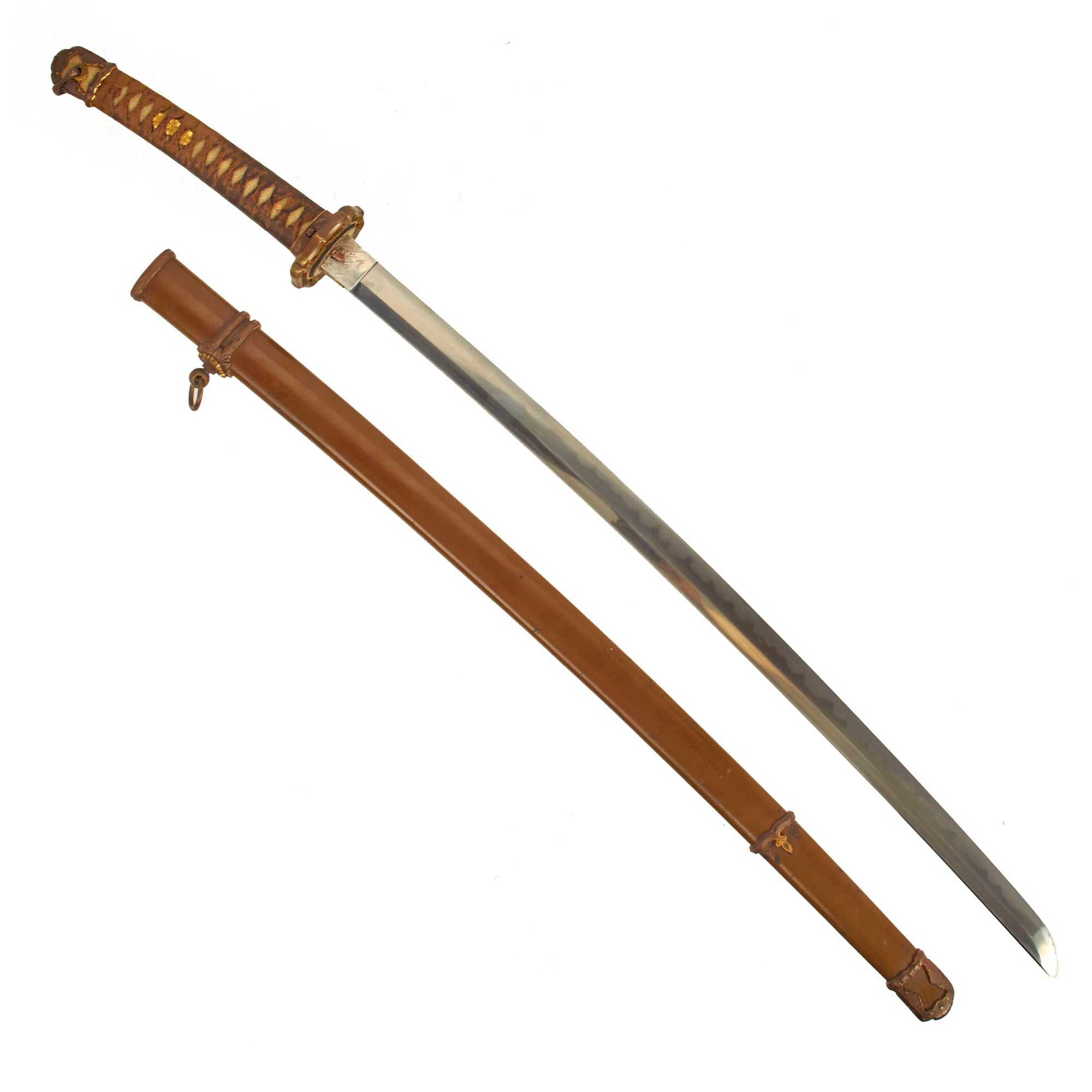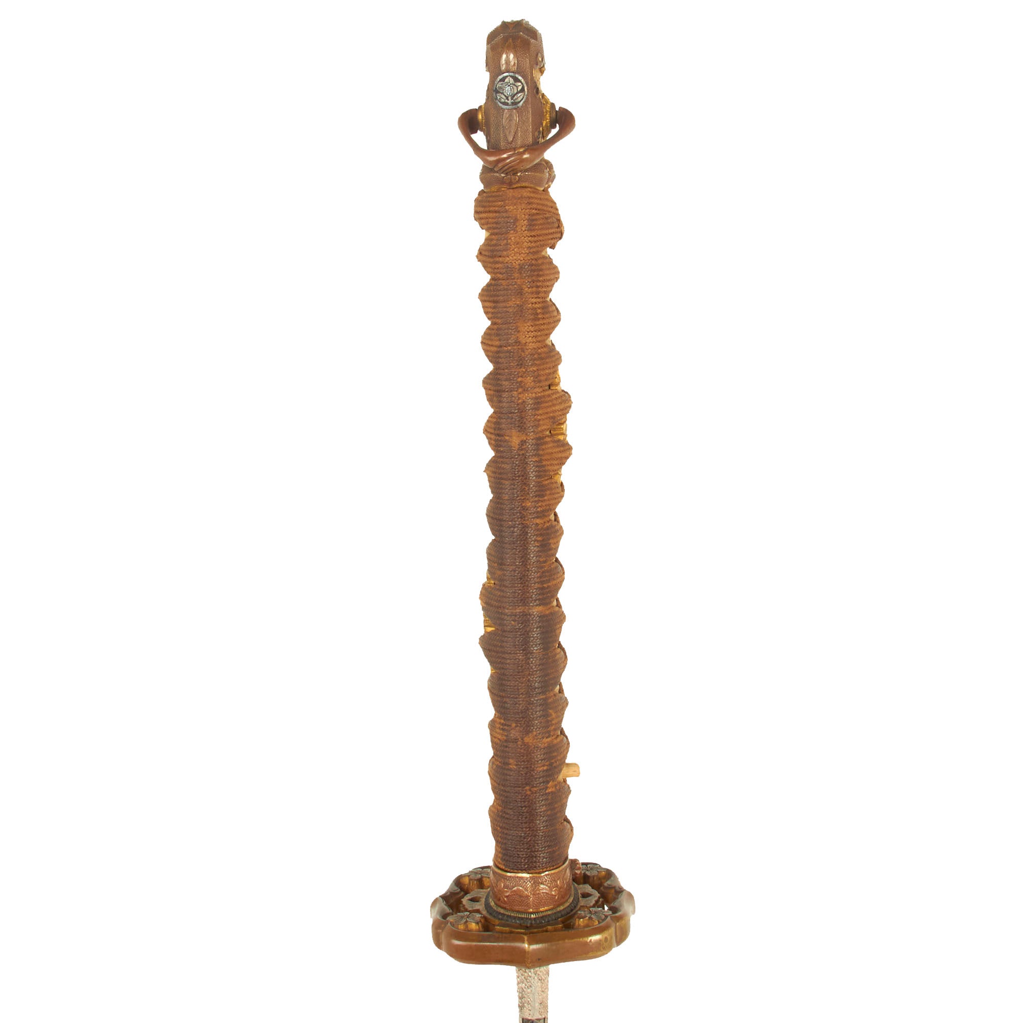 It was a common practice for swords to be passed down for generations, particularly ones that were of high quality. These would be re-polished and re-fit numerous times, as steel was precious and swords were expensive. This continued up into WWII, which is how this blade found it's way into WWII "Shin-Gunto" fittings, with a locking scabbard. There is a Japanese MON family crest on the hilt of the katana, which most likely indicates which family the owner was associated with. We unfortunately have not been able to identify the exact shape, as there are thousands of different crests.
