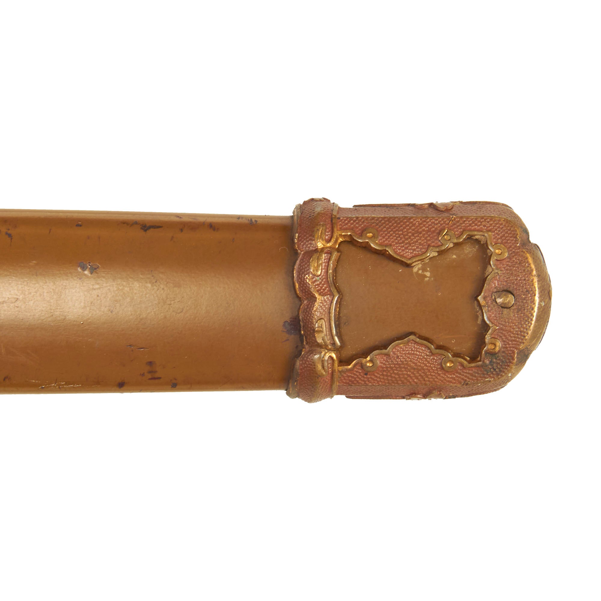 The Scabbard (saya) is steel over wood, and in very good condition, with almost all of the original smooth brown paint intact. There is definitely sign of use however, with some light oxidation where the paint has worn. We can also see a red primer coat under the brown paint, which is standard on the Type 94 scabbards. As is correct for a type 94 scabbard, hanger ring can unscrew from the fitting, and there is a rosette that is a separate piece, which are often lost. There is however some damage to the fitting, so it can no longer be removed, and is somewhat loose in the bolster.