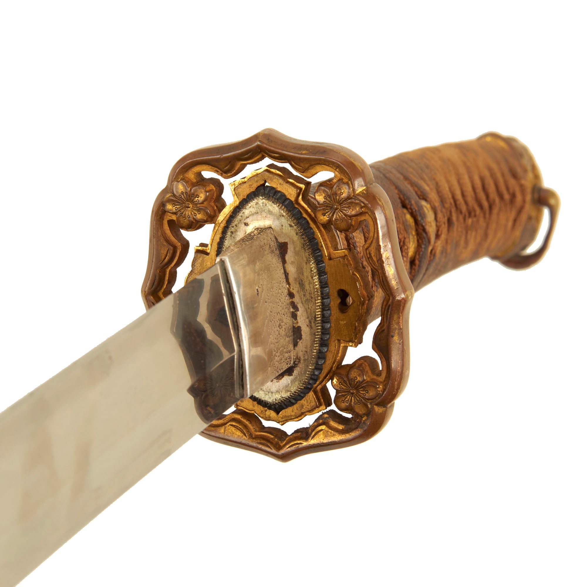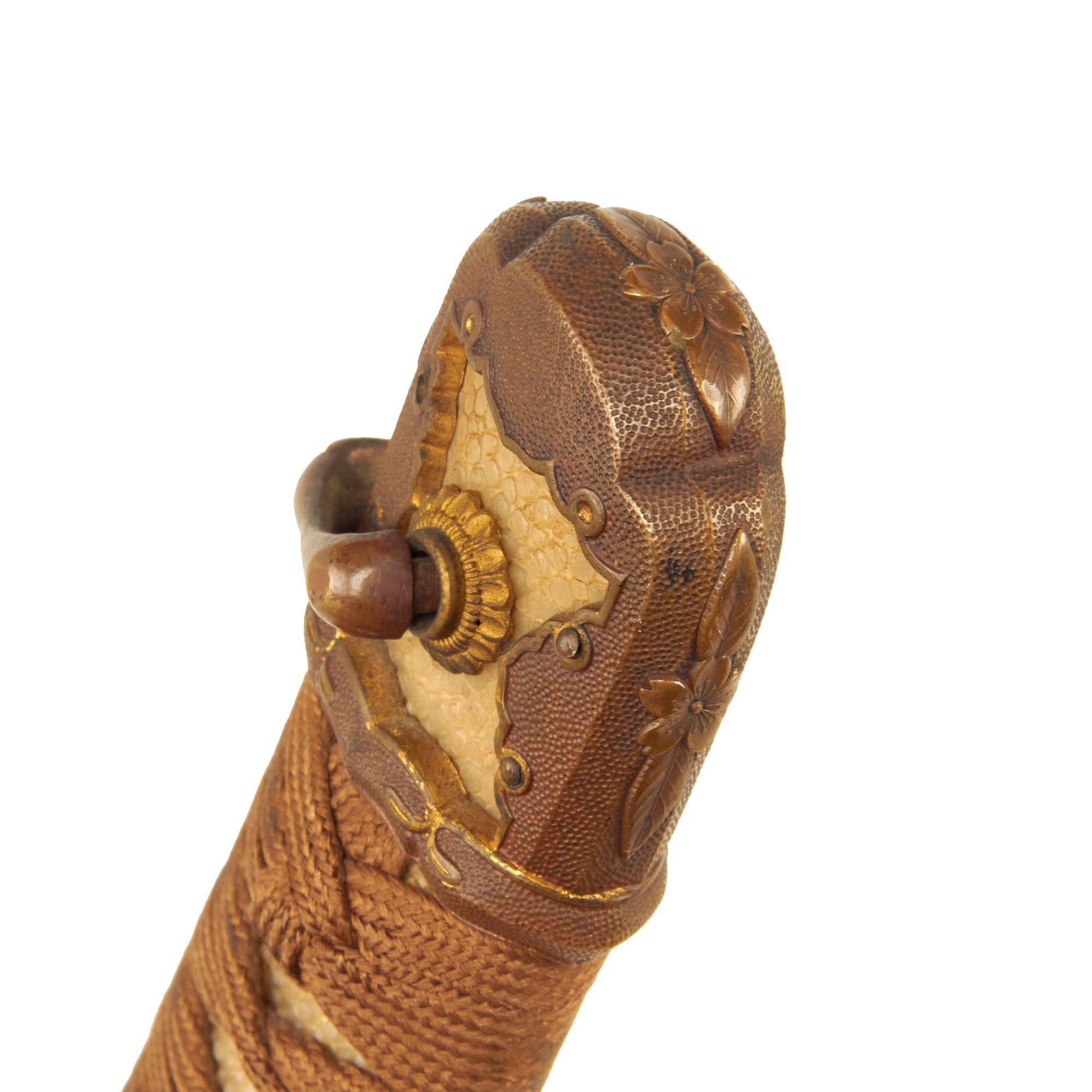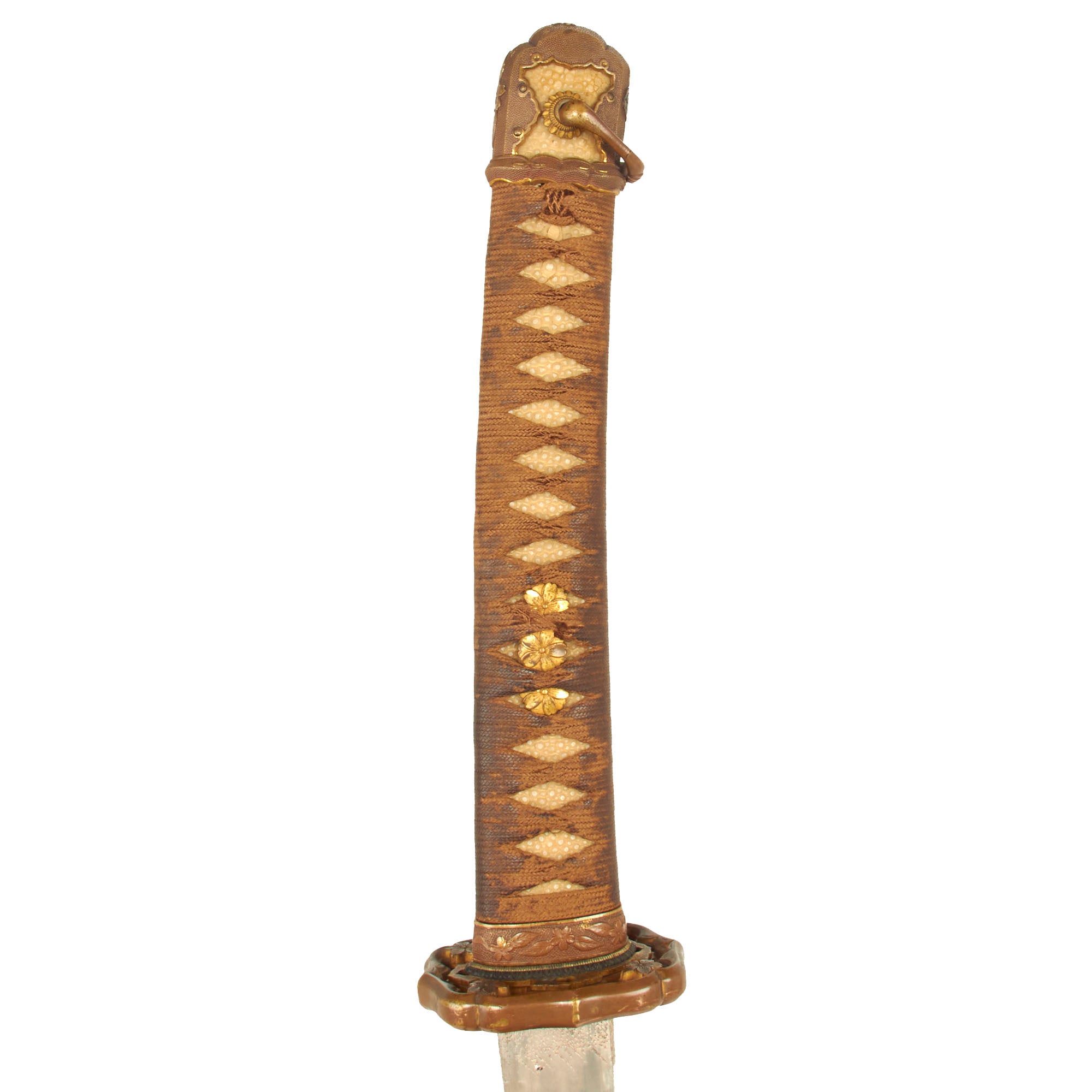 The blade mountings are the classic early / pre WWII era High grade Type 94 Army Shin-Gunto style, browned brass with gilt accents, much of which is still retained. The rounded and perforated "quince" (MOKKO GATA) shaped tsuba (cross guard) indicates it was made for a higher rank officer. The tsuka (handle) has brass Imperial Army cherry blossom menuki (grip decorations), and a nice Kabuto-Gane (Pommel Cap), complete with the hanger loop and the MON mentioned earlier. The cross guard and pommel cap have matching cherry blossom motifs, which are also found on the scabbard fittings, and the fuchi (grip collar), as is correct for the pattern.