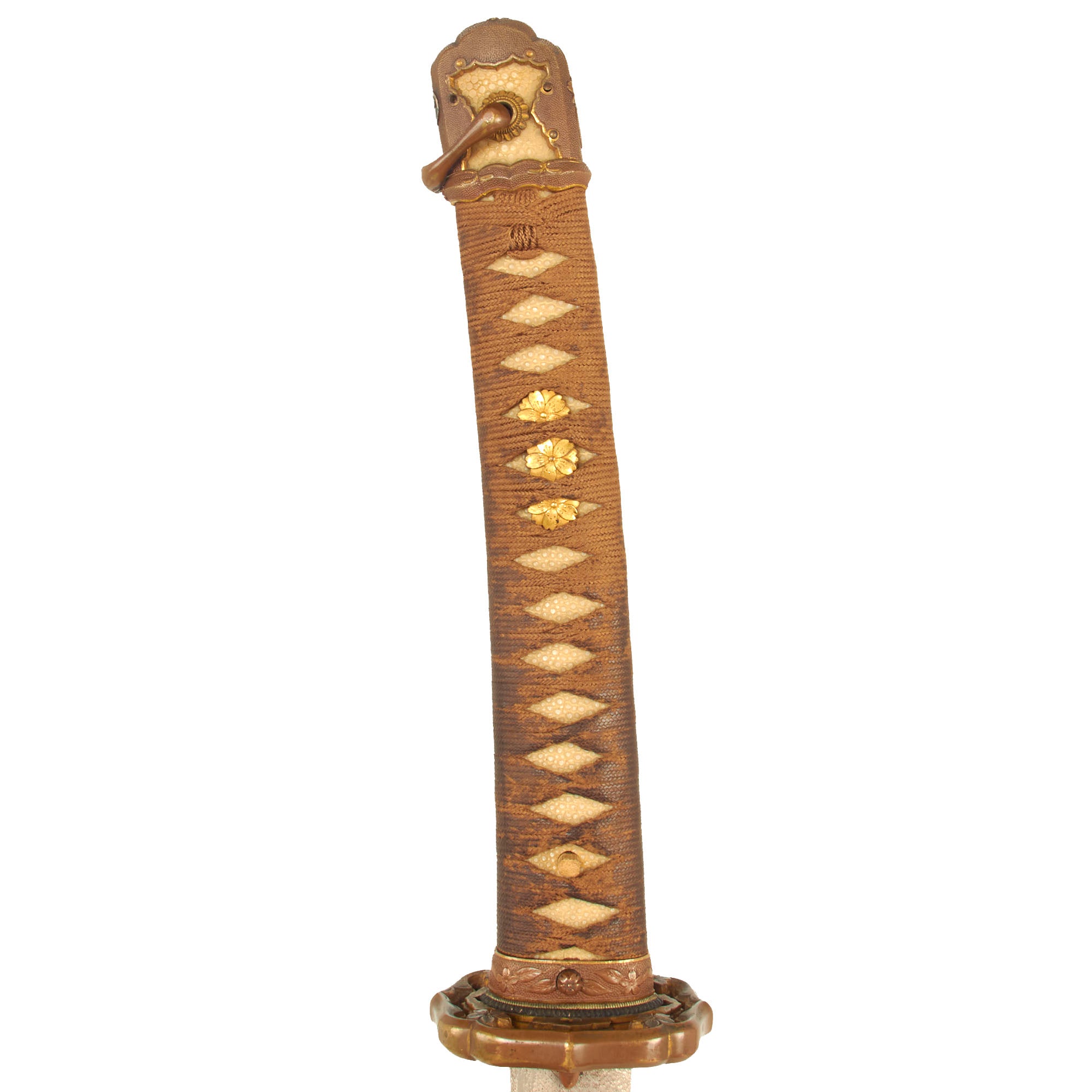 The handle has an excellent stingray skin (Sa-Me) grip, with the correct Ito (cloth binding), which does show wear and staining consistent with light use. There is no major tearing to the golden brown wrapping, and it has a lovely lightly worn look. The mekugi (peg) is a recent replacement.