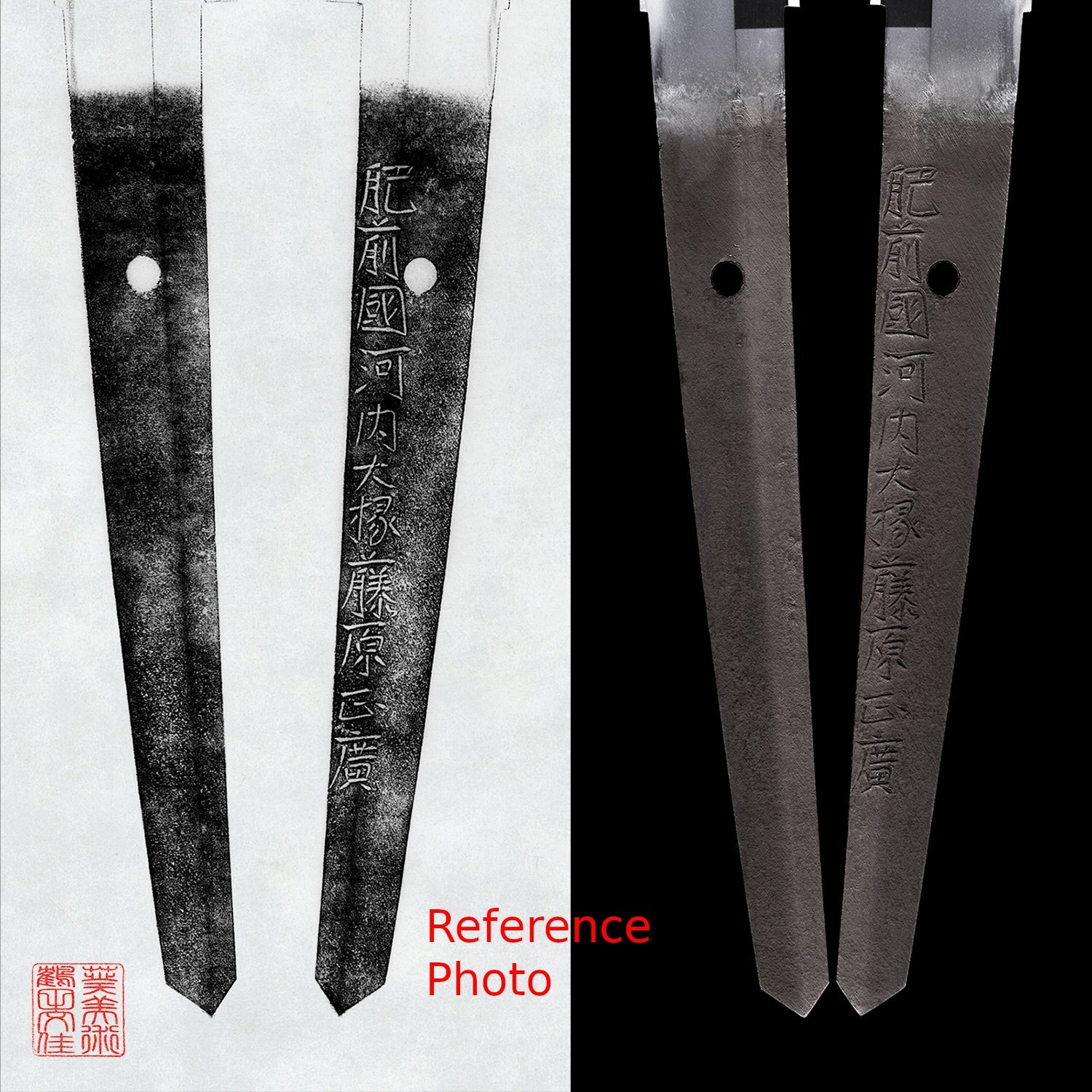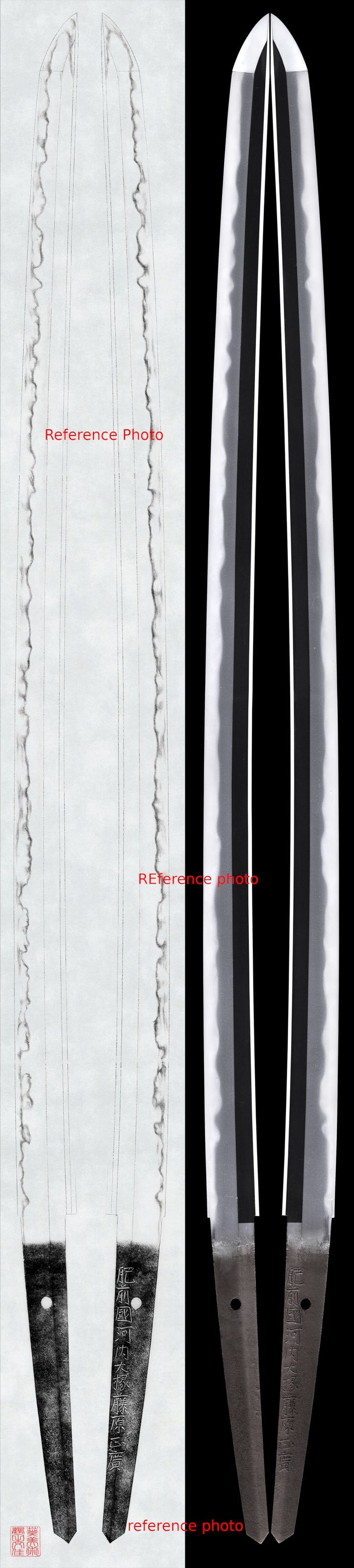 The tang of the blade is signed by the maker (mei) with 肥 前 國 河 内 大 掾 藤 原 正 廣 - HIZEN KUNI KAWACHI DAIJO FUJIWARA MASAHIRO, which translates to "Masahiro Made this in Hizen Province", along with multiple honorifics and titles in the signature. We have researched this signature, and comparison to other known examples indicates that it was forged by 初代 正廣 (SHODAI MASAHIRO), or the first generation MASAHIRO in Hizen province. This same signature was also used by 四代 正廣 (YONDAI MASAHIRO), the 4th generation, but the style was not the same. The shape of the tang tip, the shape of the characters, and also the fact that it is on the side of the blade that points towards the body all indicate 1st Generation Masahiro.