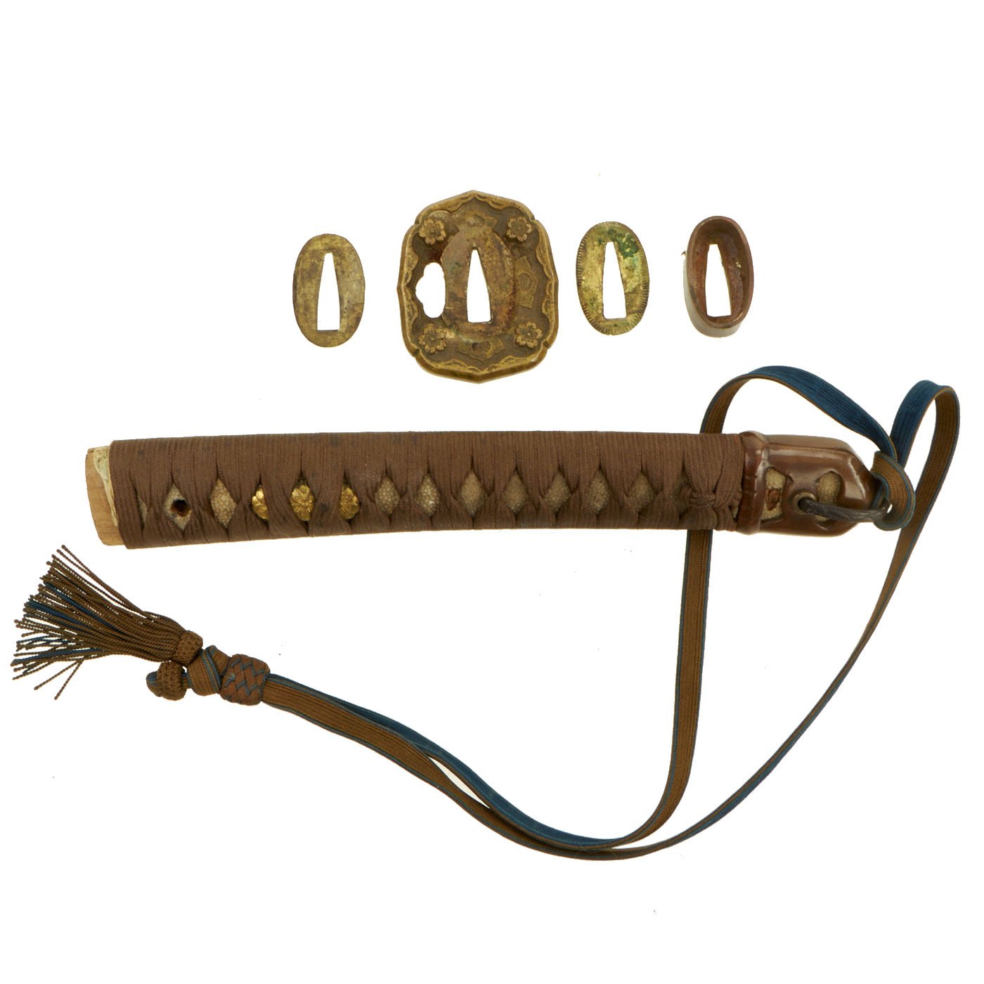 The blade mountings are the "simplified" later WWII era Type 98 Army Shin-Gunto style, brass without the gilt accents, and a simplified design on some parts. Rounded "quince" shaped tsuba (cross guard) with brass Imperial Army cherry blossom menuki (grip decoration), and a nice late style smooth Kabuto-Gane (Pommel Cap). The cross guard has Cherry Blossom motifs, however the Fuchi (grip collar) and pommel cap are smooth in this later configuration. There are 2 Seppa (spacers) around the cross guard, however they are bit loose, as there used to be a leather washer with a strap that would go through the hole in the cross guard and snap onto the scabbard cover. The blade collar (habaki) looks to be the standard brass alloy.