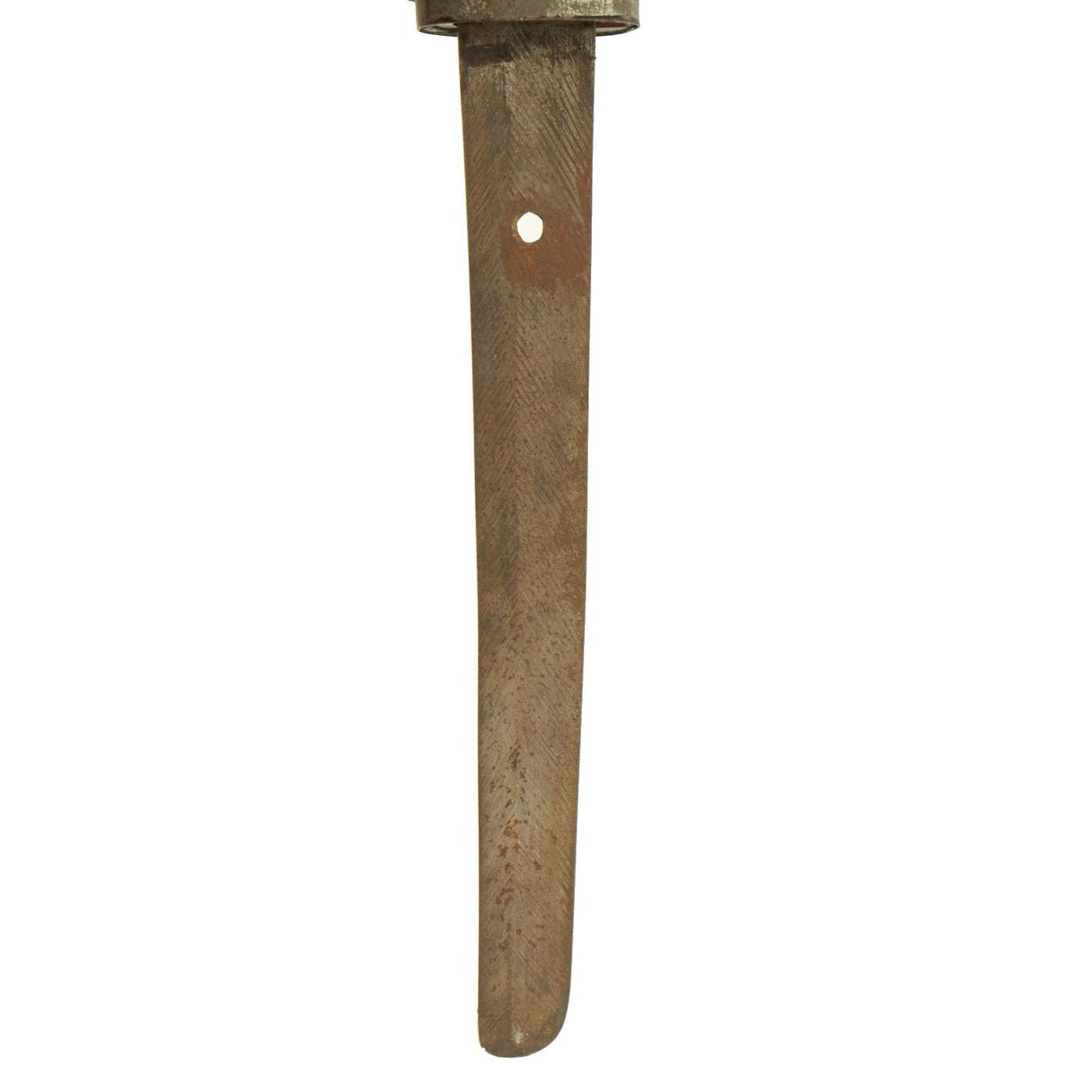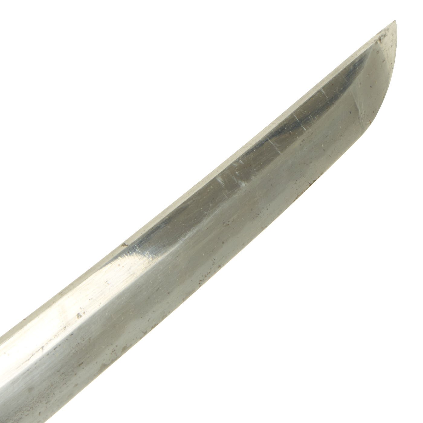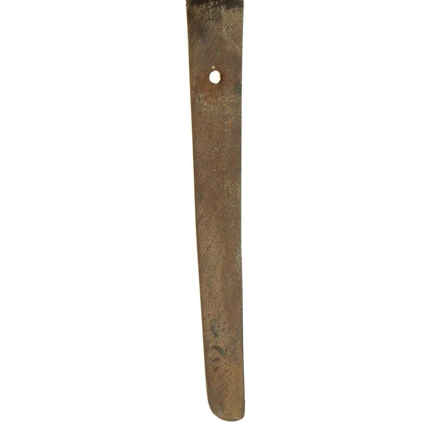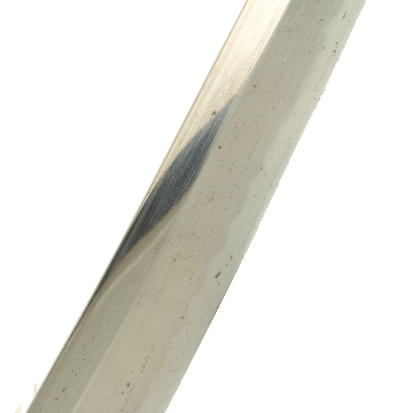 Offered in very good condition, the blade is still sharp and looks great. There are no nicks on the edge or dents that we can see, just some light scuffing in areas. Overall the polish on the blade is good, with some areas of light staining oxidation, probably due to not being oiled. Blade length is approximately 25 1/4 inches and overall length 36 1/4 inches. The katana has a handmade blade with a Futsu 普通 (regular) Nakago (tang) with Haagari (asymmetrical rounded) nakago-jiri (tang tip).