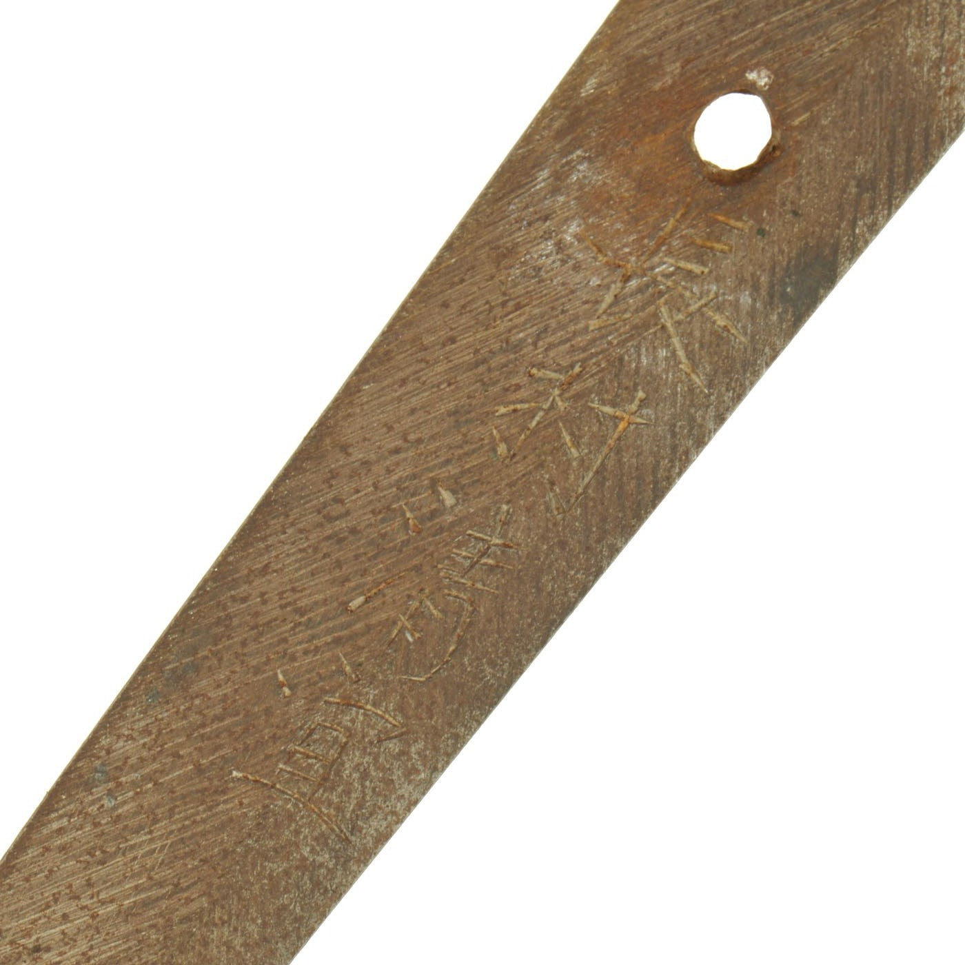 The blade on this example was hand forged, and the tang of the blade is signed (Mei) with the characters 長 村 清 宣, read as NAGAMURA KIYONOBU. Research indicates that this smith's real name was 長村 松市 (Nagamura Matsuichi), so in this case "Nagamura" was their family name, and "Kiyonobu" their "swordsmith name." We have seen many other smiths sign their swords in this fashion. Their name appears in the Seki Tanrensho Booklet printed in 1939. Kiyonobu was active during the Showa Period and worked at Seki arsenal in Gifu, Mino Province (美濃国), and look to have made both arsenal forged and traditional blades. We have confirmed the signature (Oshigata) with other examples of his work.