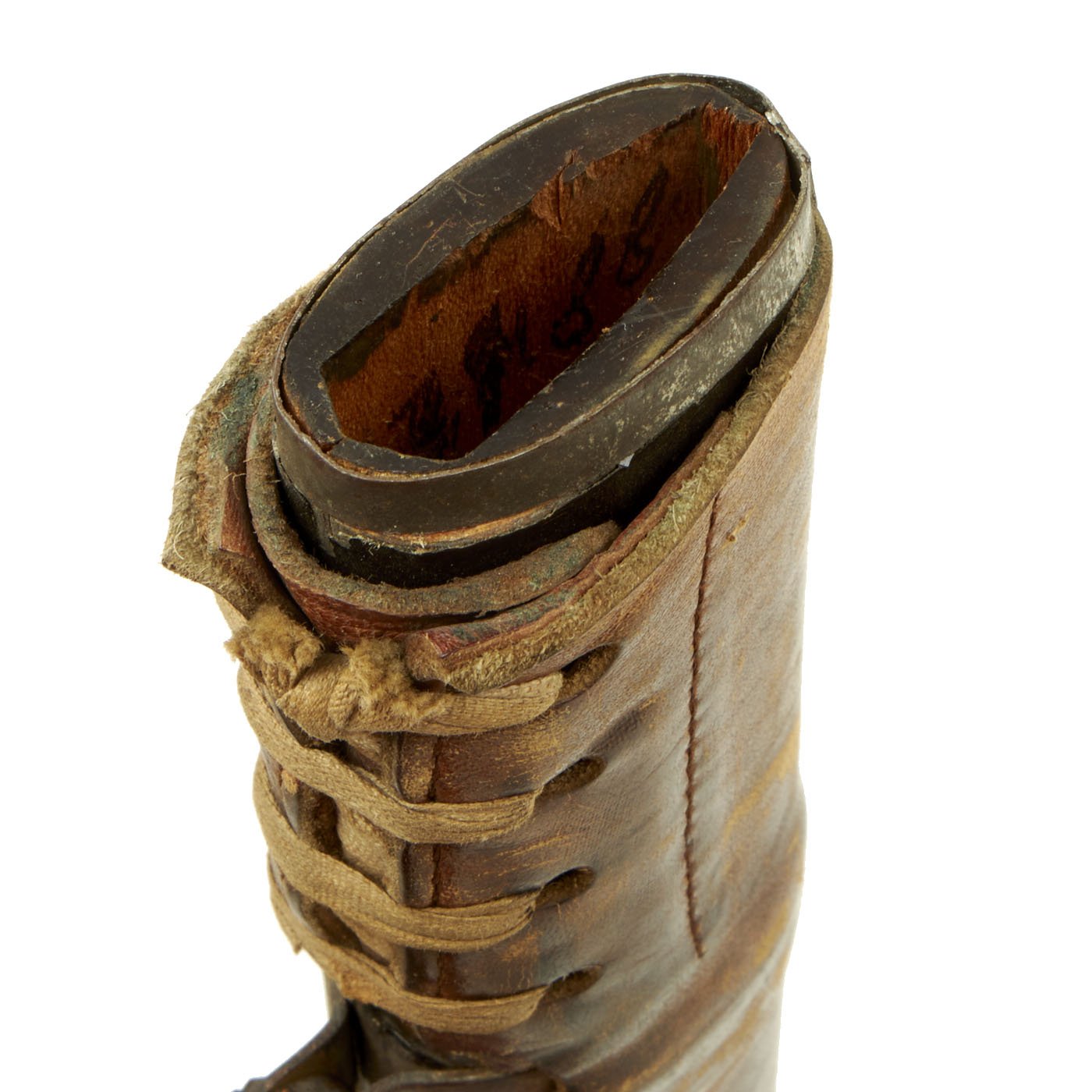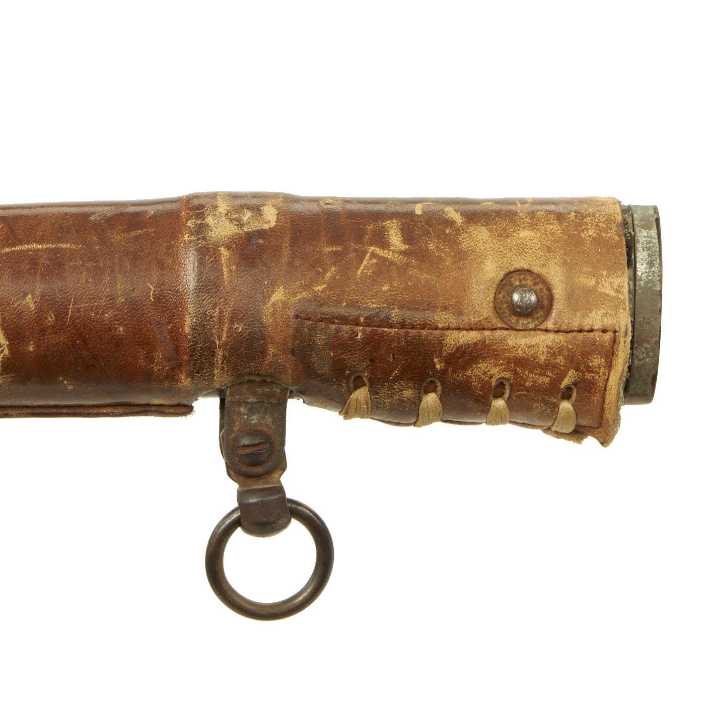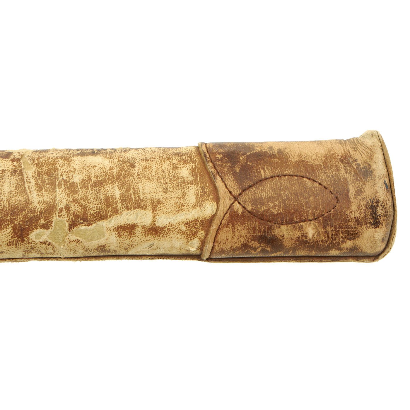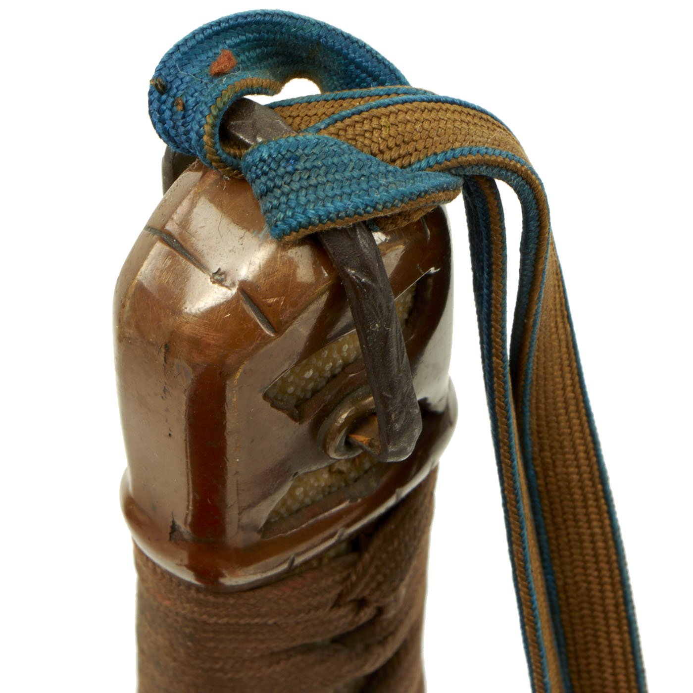 The handle (tsuka) has an nice Sa-Me (Stingray) grip, which is fully intact. It has a complete brown Ito (cloth binding), which shows light staining and wear. There is a single wooden securing peg (mekugi) still present, which looks to be a period replacement, and is not a tight fit. The Scabbard (saya) is a standard black lacquered wood type, covered with a leather field cover. It has a single metal hanger ring with a swivel. The leather cover is in good shape, showing wear and some tears from service and decades of age and storage. the lacing at the top and the seam stitching is still intact, and is has a great aged look.