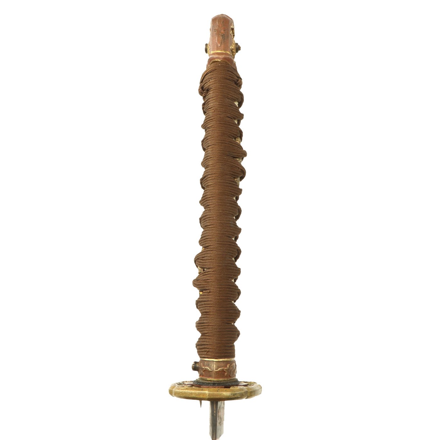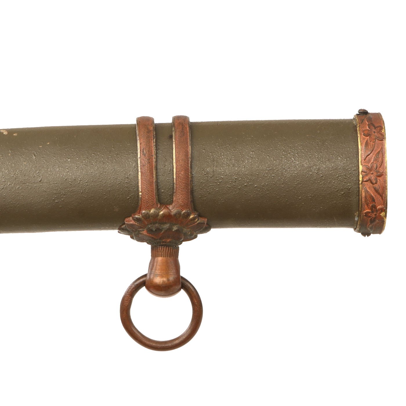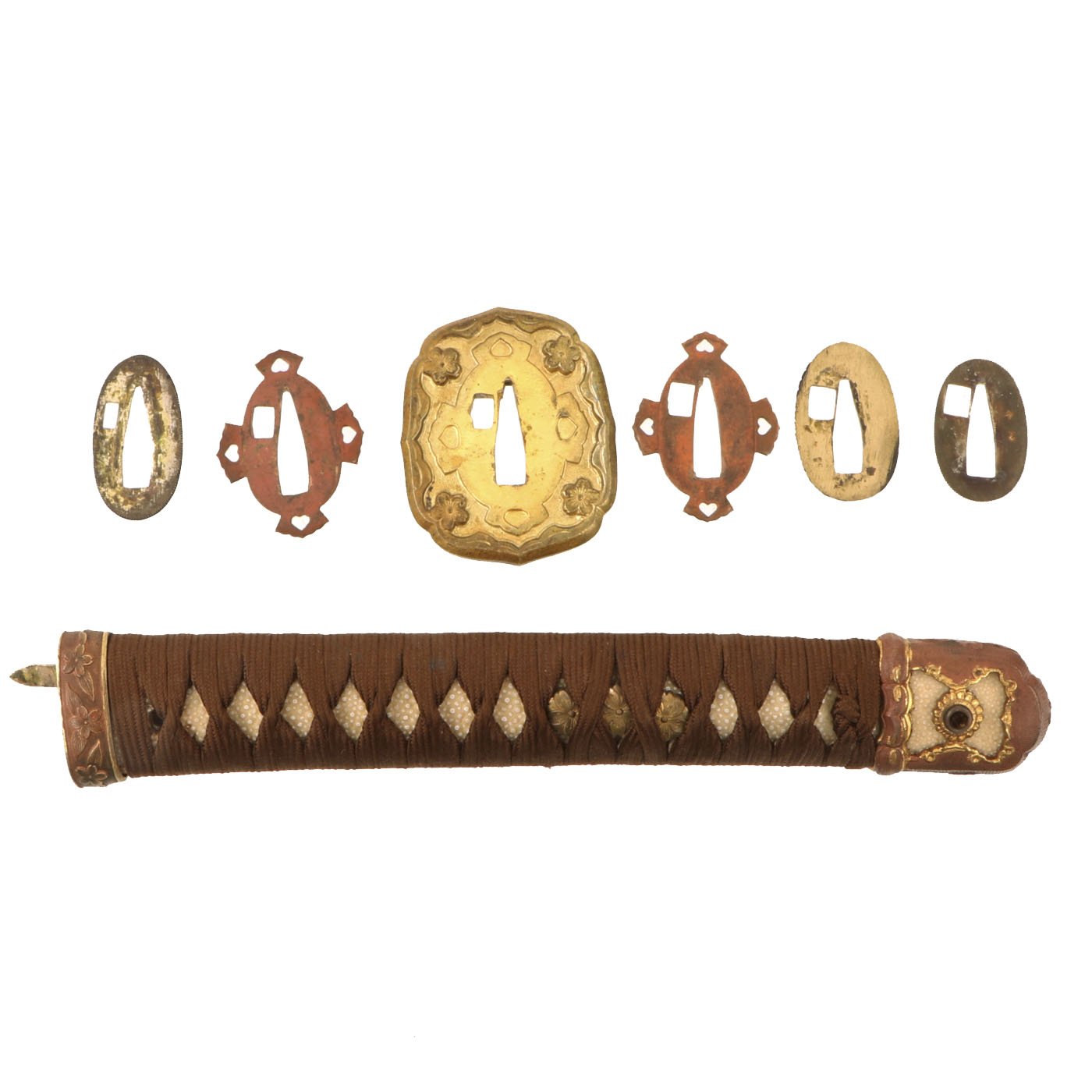 The tsuba, 2 of the seppa, the fuchi, and the scabbard lock are all marked with western numbers 1864. Other components are not marked, but markings on the Tsuka and Saya often would wear off. We have no doubt that this is an original set, made for this specific blade. The Habaki is a bit dented in on the end, which explains why the crossguard is slightly loose.