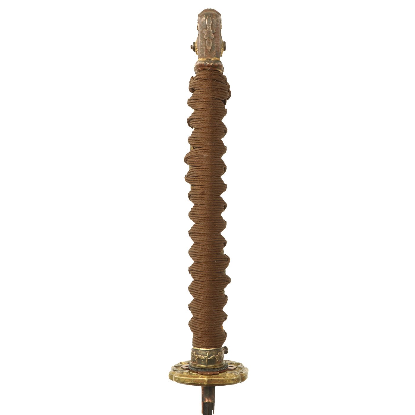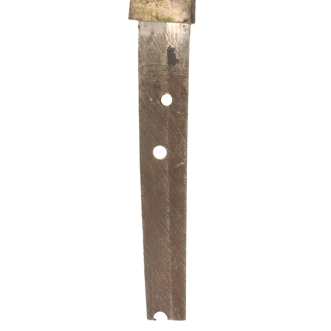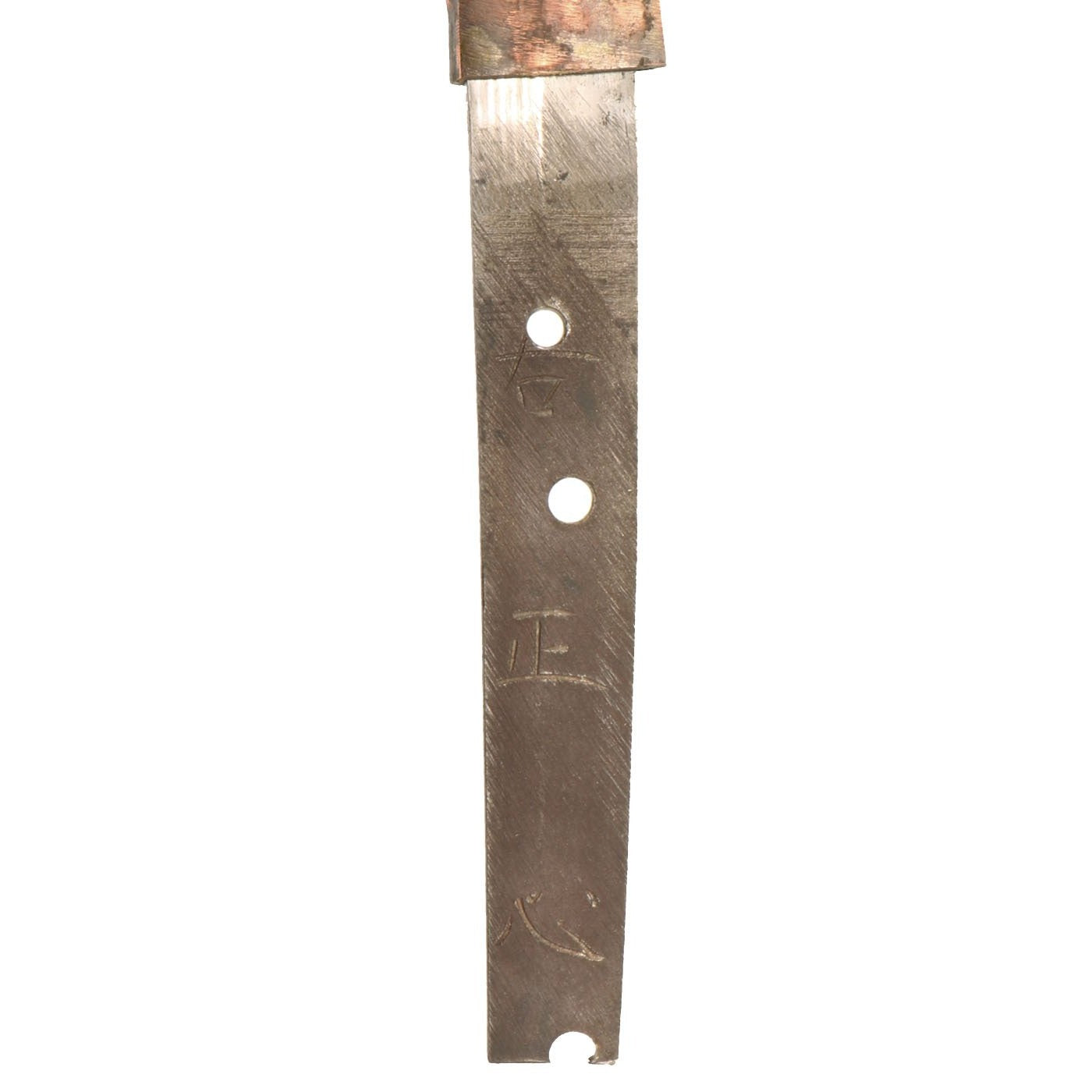 From what we can tell, this is not the first mounting for this sword, which is why there are multiple holes and the cut tang tip. However it looks like the tag was originally quite long, and was cut down to fit the new fittings, a common practice. We have also seen un-cut blades by USHOSHIN that still had this type of tang end.