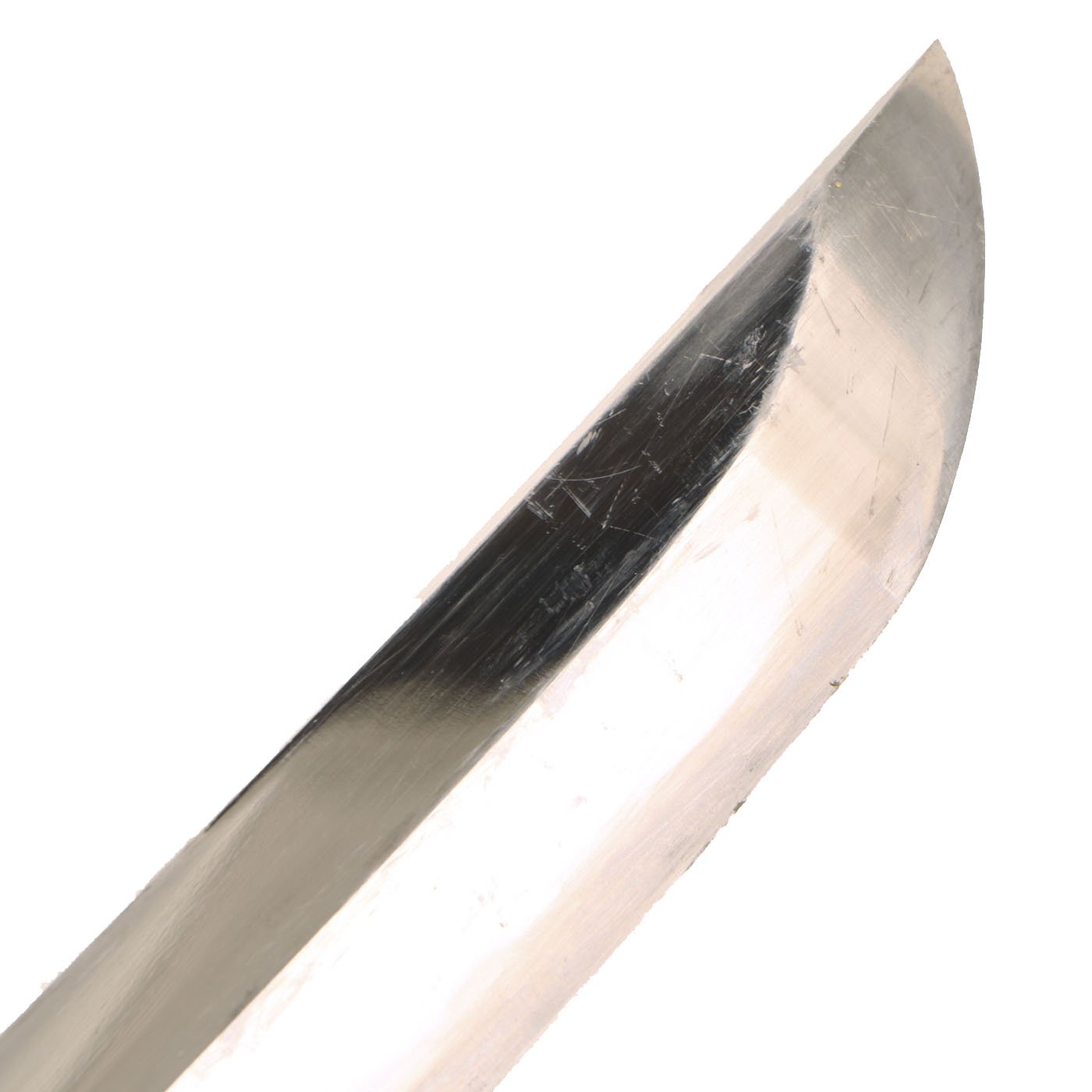 Offered in very good condition, the blade is still sharp and looks great. There are just a few tiny nicks or dents on the edge. Overall the polish on the blade is excellent, with just a few areas of oxidation and small scuff marks. Blade length is approximately 24 3/4 inches and overall length 35 1/2 inches. The katana has a handmade blade with a Futsu 普通 (regular) Nakago (tang) with KIRI (cut) nakago-jiri (tang tip). It has a proper kissaki (tip) with a clear yokote (division between body and tip).