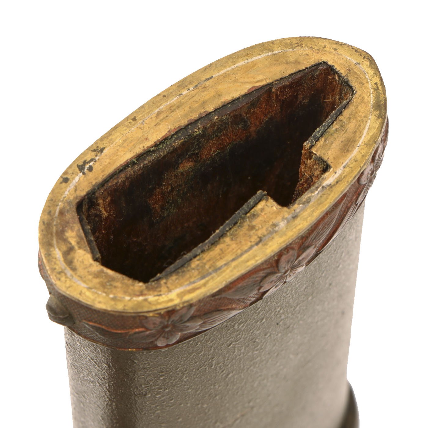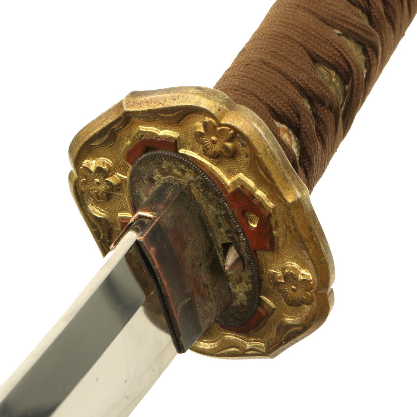 The blade mountings are the classic later WWII era Type 98 Army Shin-Gunto style, brass with gilt accents. Rounded "quince" shaped tsuba (cross guard) with brass Imperial Army cherry blossom menuki (grip decoration), and a nice Kabuto-Gane (Pommel Cap). The cross guard and pommel cap have matching cherry blossom motifs, which are also found on the scabbard fittings, and the fuchi (grip collar). There are 5 Seppa (spacers) around the cross guard to keep the fit tight, and all are inleted for the scabbard lock, which is fully functional. The blade collar (habaki) is the copper type we usually see on older hand made blades.