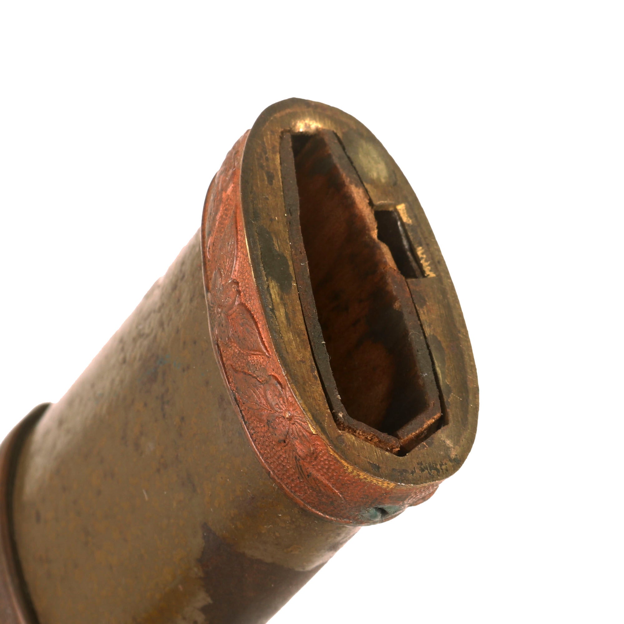 The blade mountings are the classic WWII era Type 98 Army Shin-Gunto style, brass with gilt accents, which have mostly worn away. It has the typical rounded brass "quince" (mokko gata) shaped tsuba (cross guard) with brass Imperial Army cherry blossom menuki (grip decoration), and a nice Kabuto-Gane (Pommel Cap). The cross guard and pommel cap have matching cherry blossom motifs, which are also found on the scabbard fittings, and the fuchi (grip collar). There are four metal seppa (spacers) around the tsuba to keep the fit tight. All are inlet for the scabbard lock, which is is complete but the scabbard throat is too worn for it to catch on. The blade collar (habaki) looks to be the standard plated brass alloy.