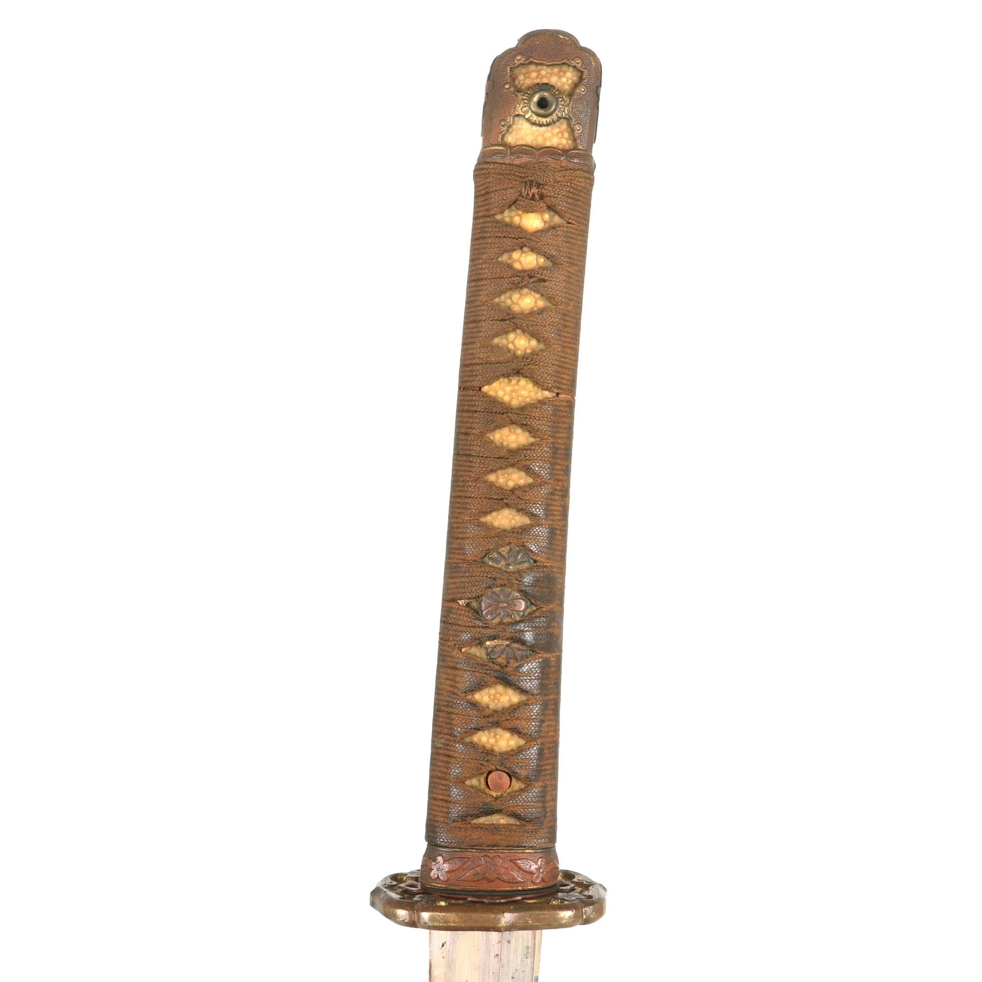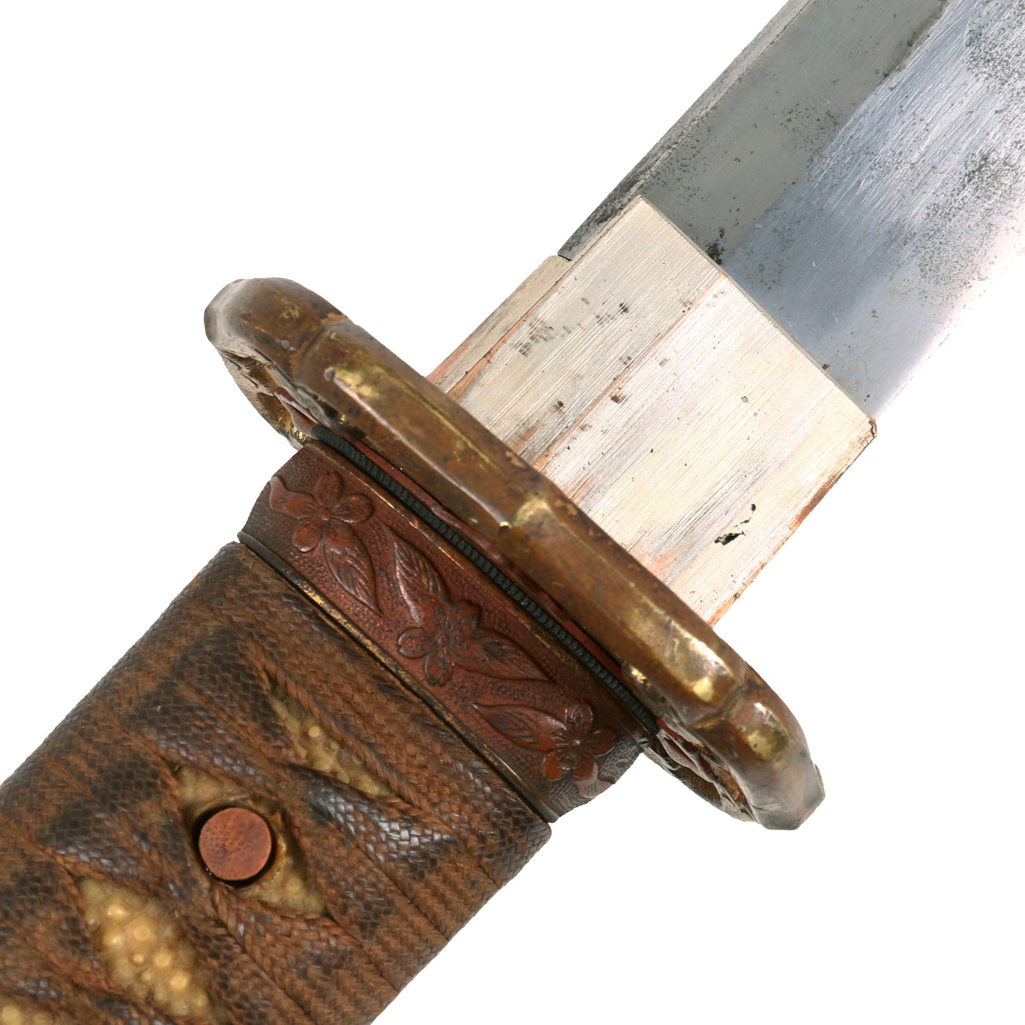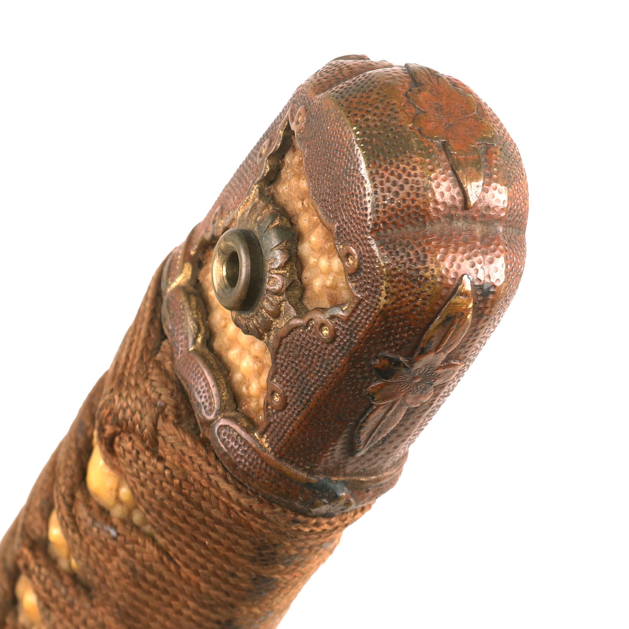 The handle (tsuka) has an very nice Sa-Me (Stingray Skin) grip, which is fully intact, and probably made from celluloid or a similar plastic. It has a complete golden brown Ito (cloth binding), which shows wear and staining from use in the field. There is a single wooden securing peg (mekugi) still present, which is definitely a display replacement. There is no loop on the end of the handle, which were sometimes left off late in the war, or were just a piece of cord that would tear off.