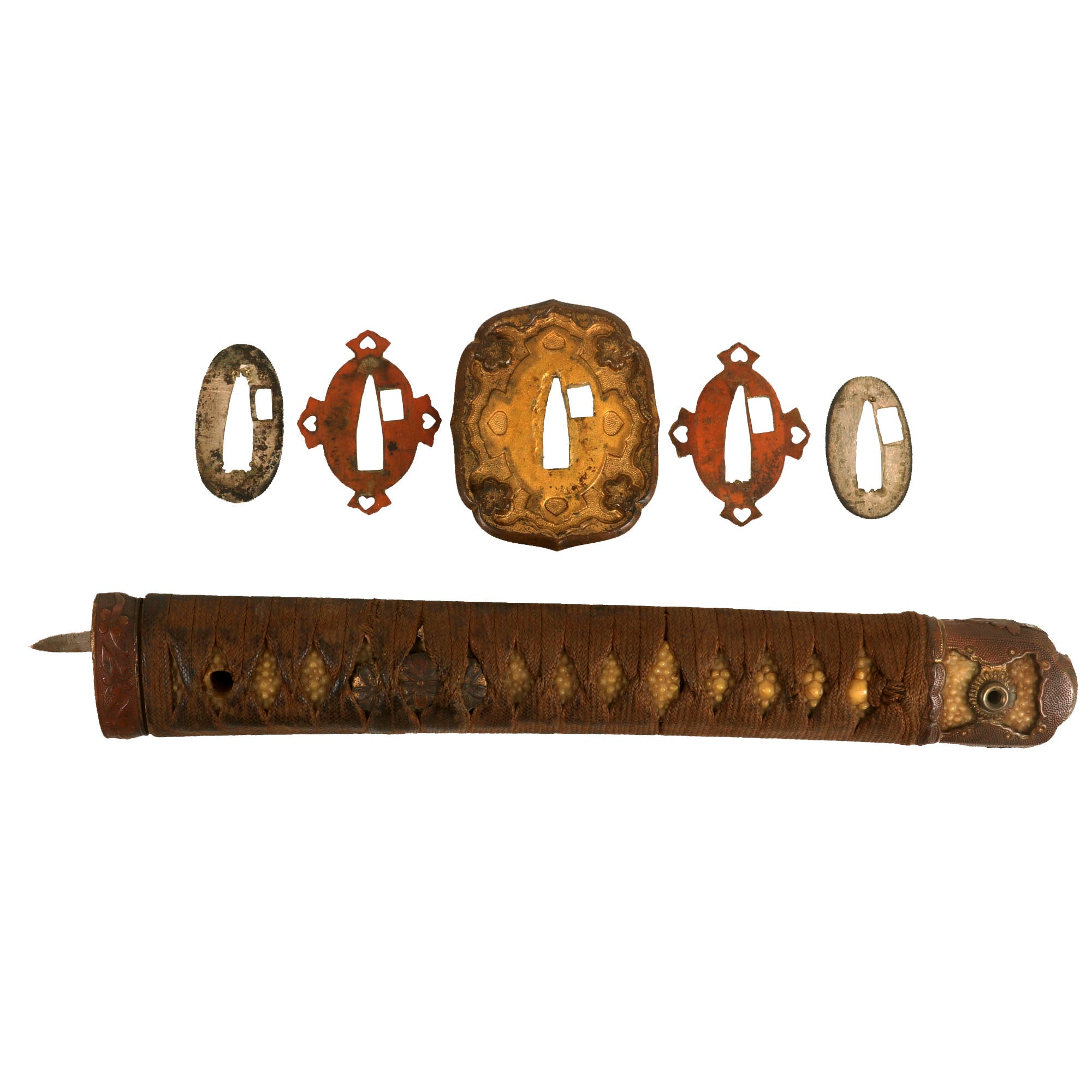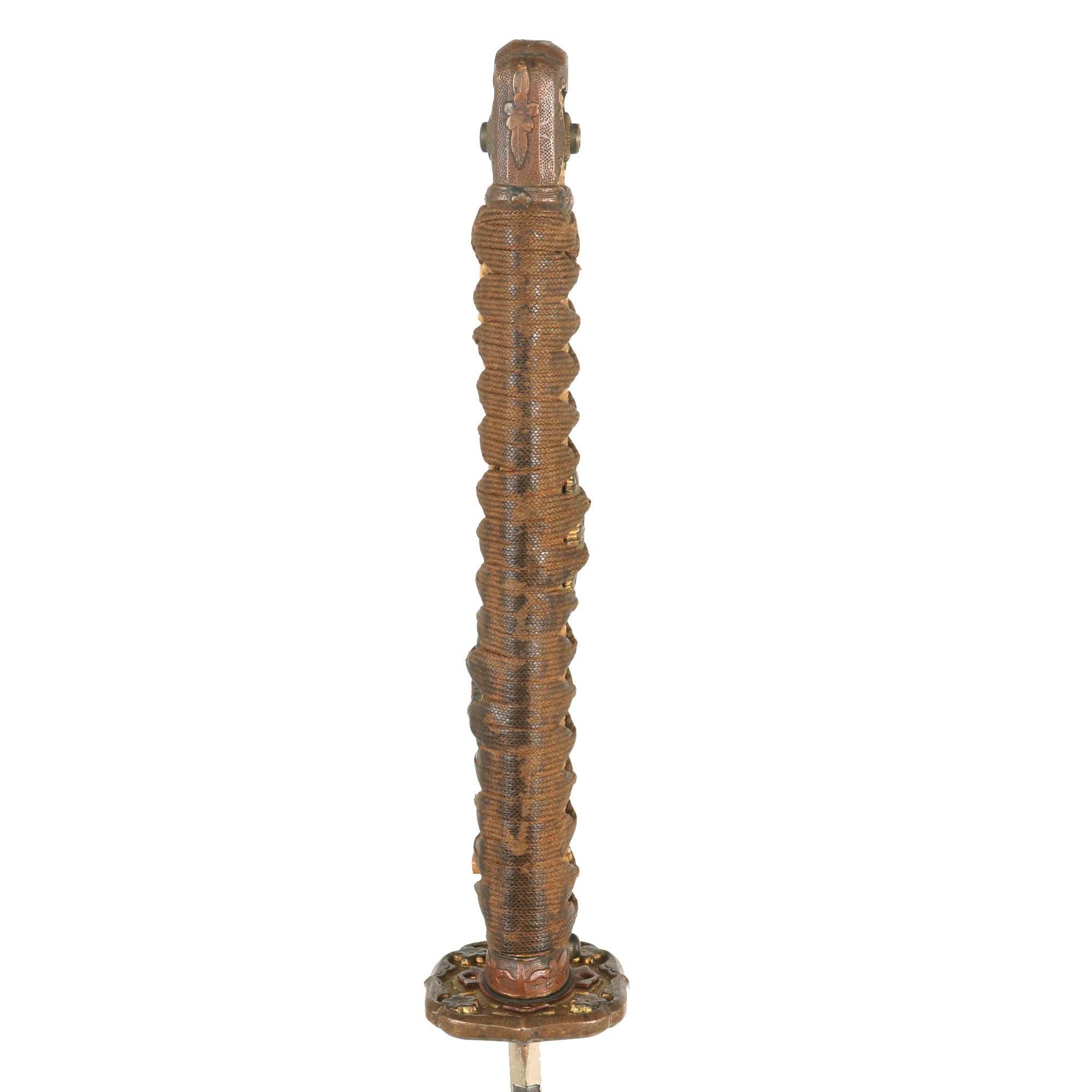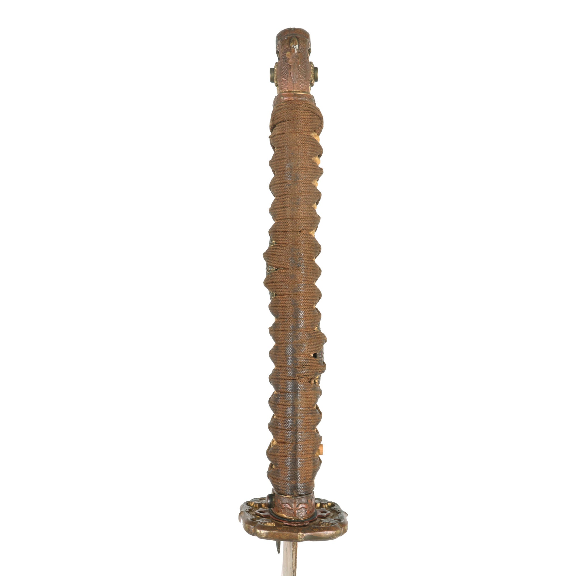The handle (tsuka) has an very nice Sa-Me (Stingray Skin) grip, which is fully intact, and probably made from celluloid or a similar plastic. It has a complete golden brown Ito (cloth binding), which shows wear and staining from use in the field. There is a single wooden securing peg (mekugi) still present, which is definitely a display replacement. There is no loop on the end of the handle, which were sometimes left off late in the war, or were just a piece of cord that would tear off.