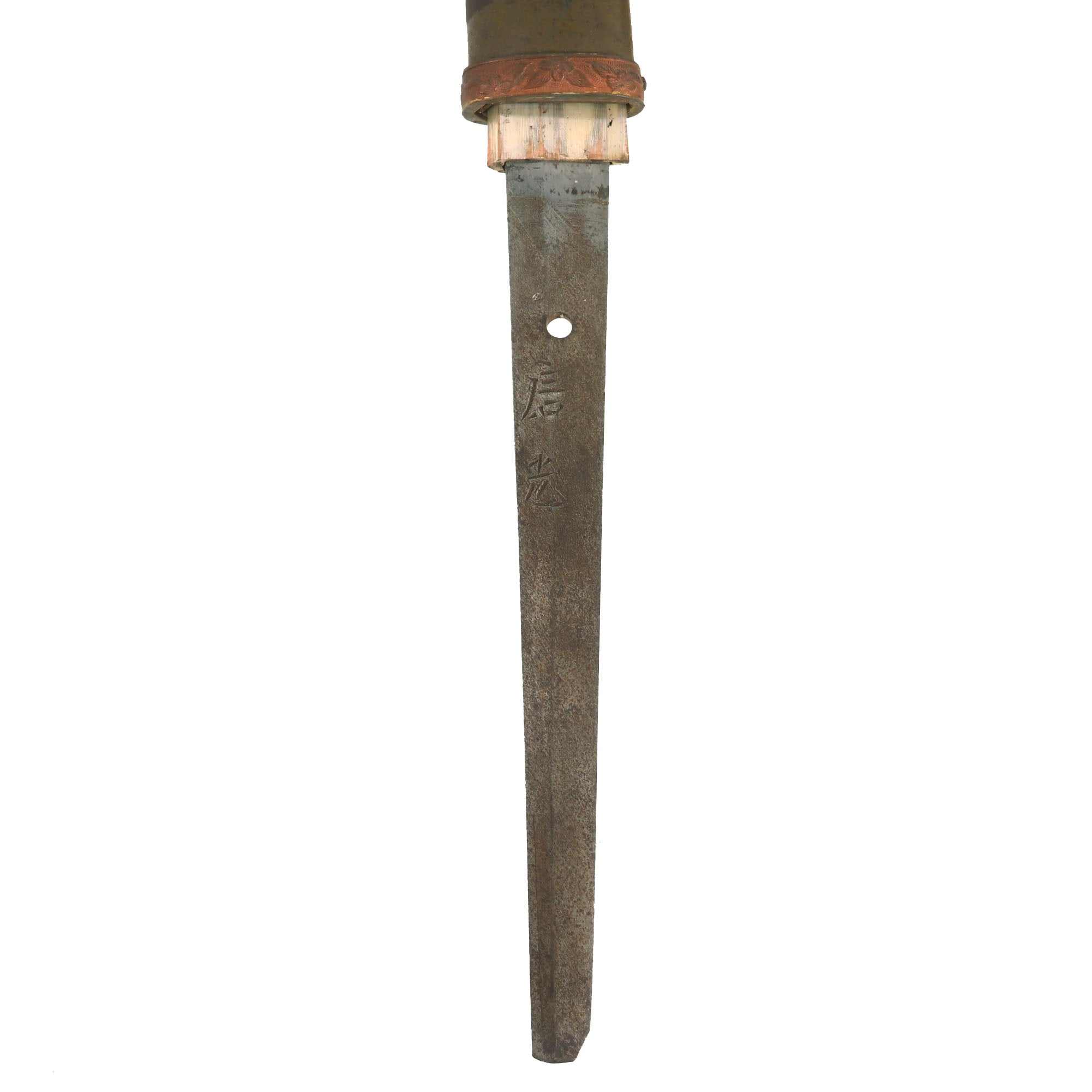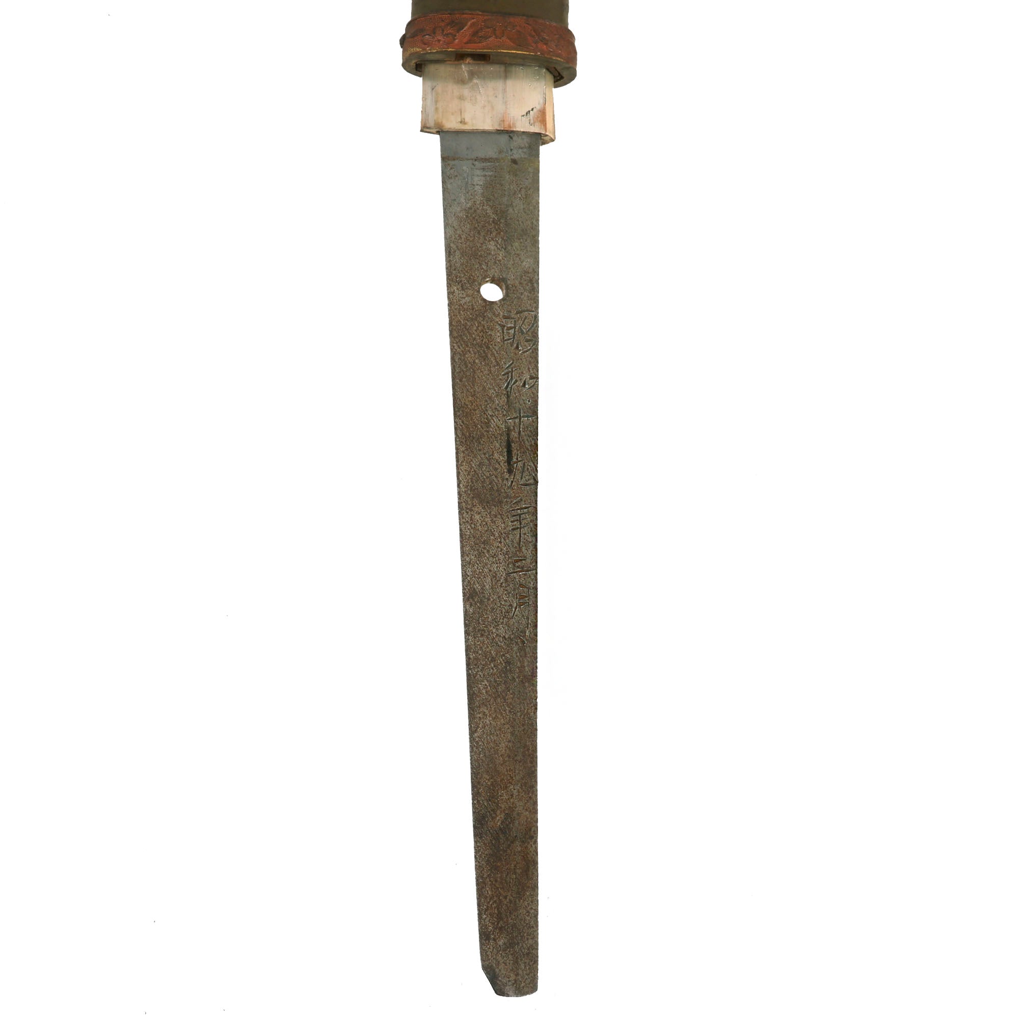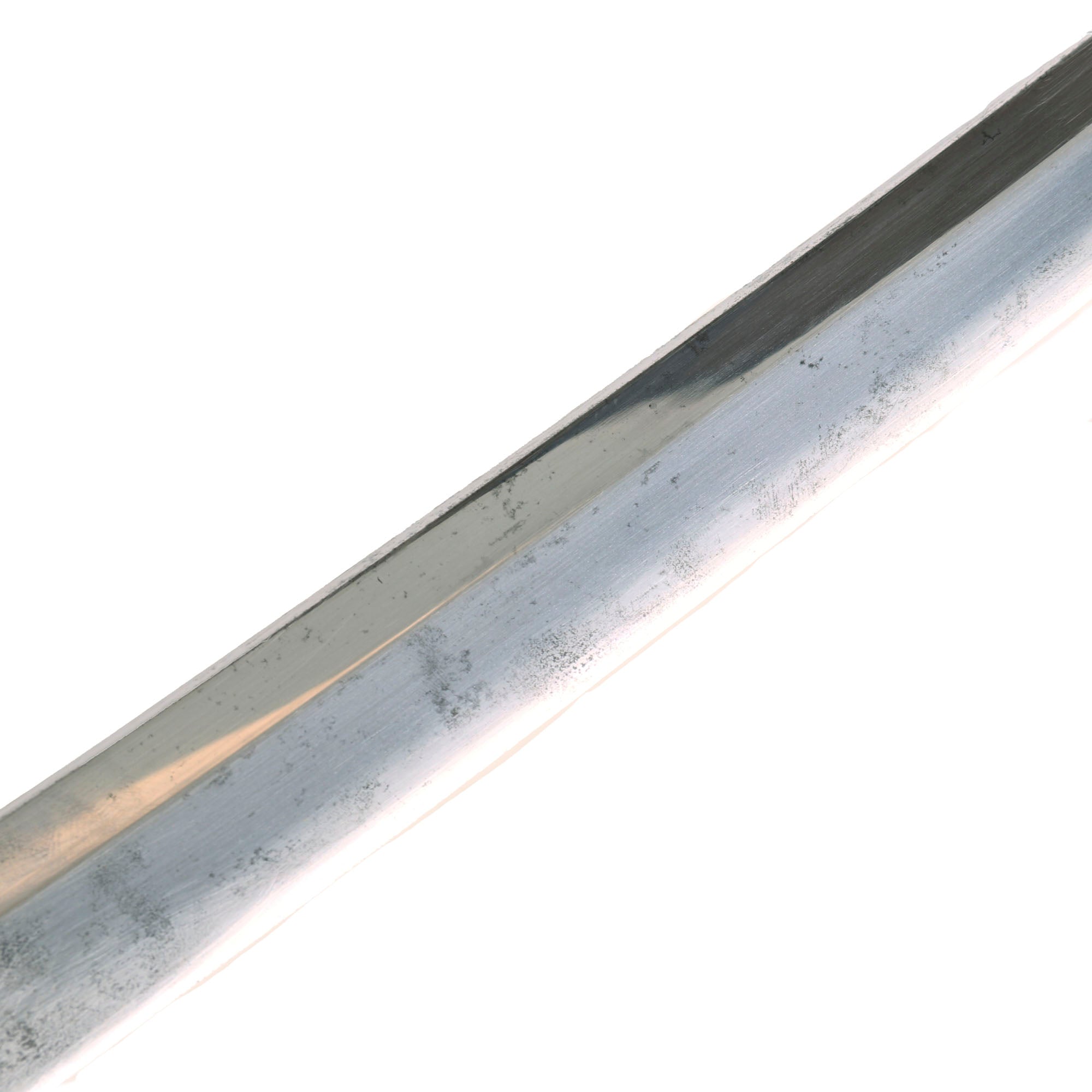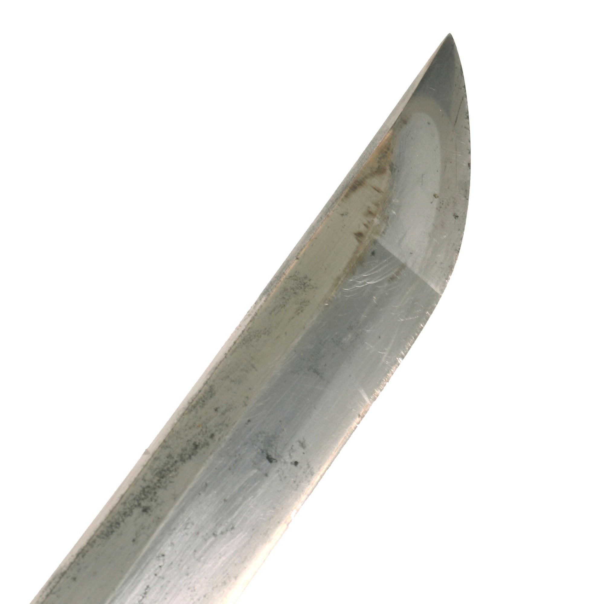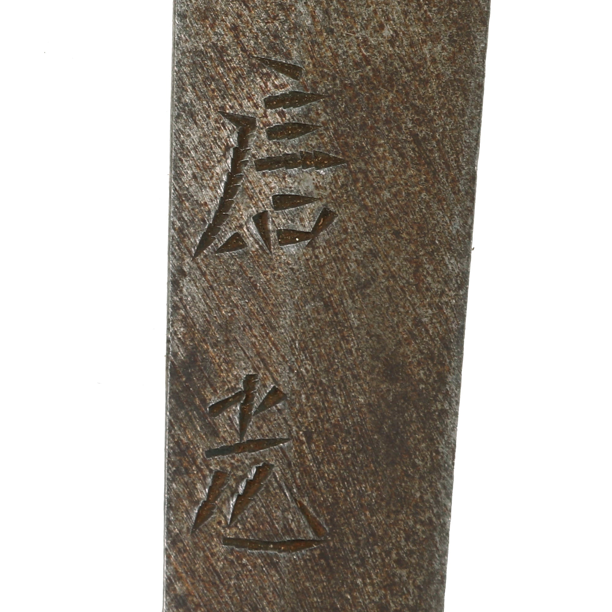 Offered in very good condition, the blade is still quite sharp and looks great. It shows some scuffing and staining scattered overall, as well as some swirl marks in areas from cleaning the blade. Aspects of the blade are relatively easy to see in the light. This definitely looks like a blade that saw some real service during the war. Overall the polish on the blade is relatively good, was a standard polish, with a burnished mune (spine) and shinogi-ji (blade flat above the ridge) while the JI has a bit of a matte character, as is correct. Blade length is approximately 26 inches and overall length 37 ⅛ inches. The katana has an arsenal forged blade with a Futsu 普通 (regular) Nakago (tang) with an Iriyamagata (asymmetrical pointed) nakago-jiri (tang tip).