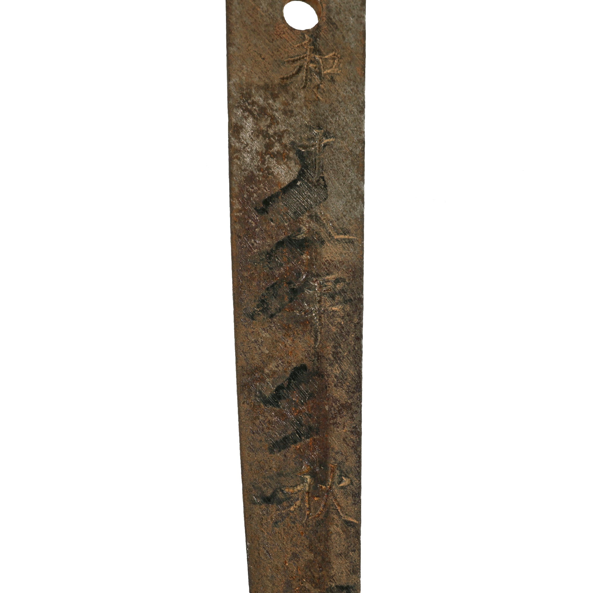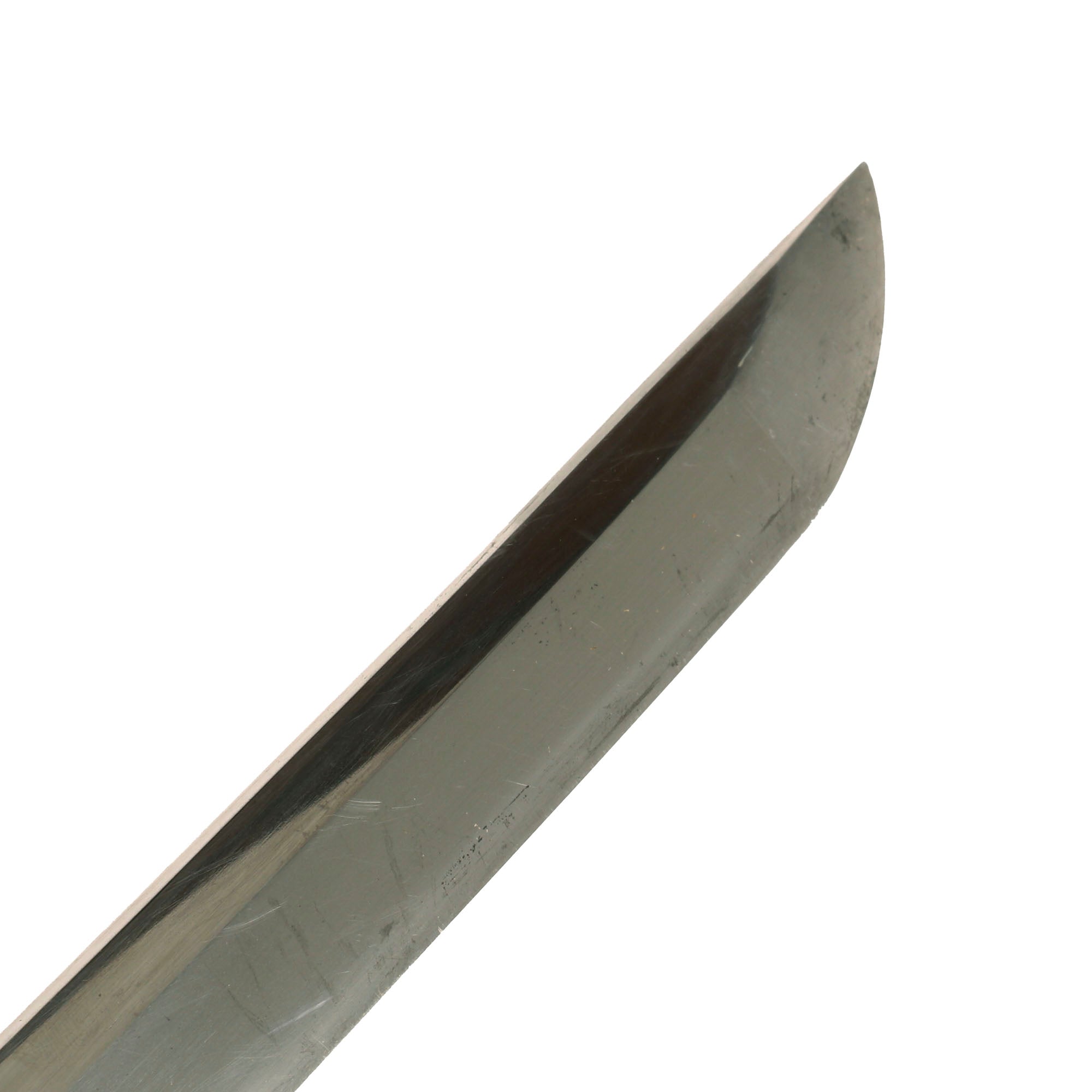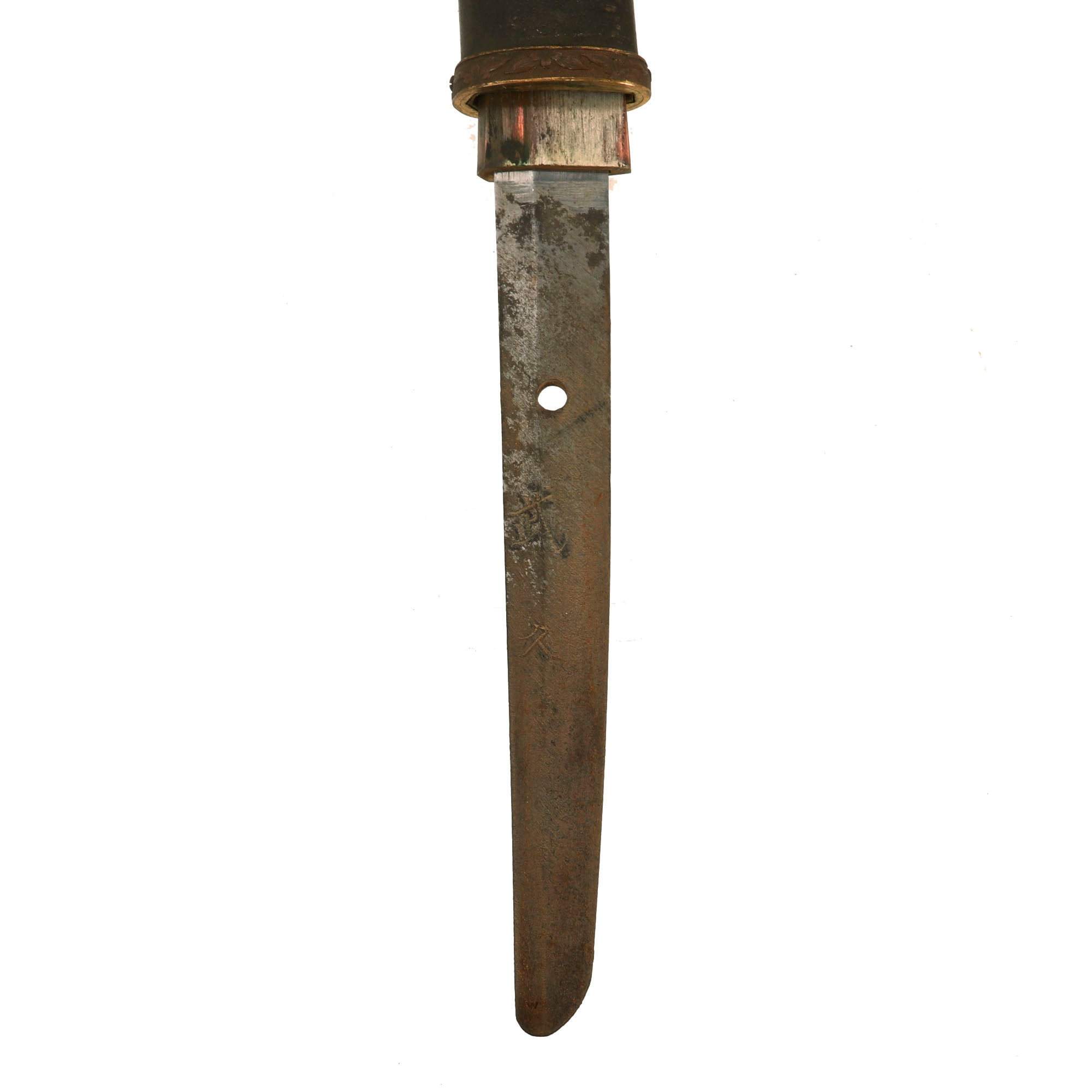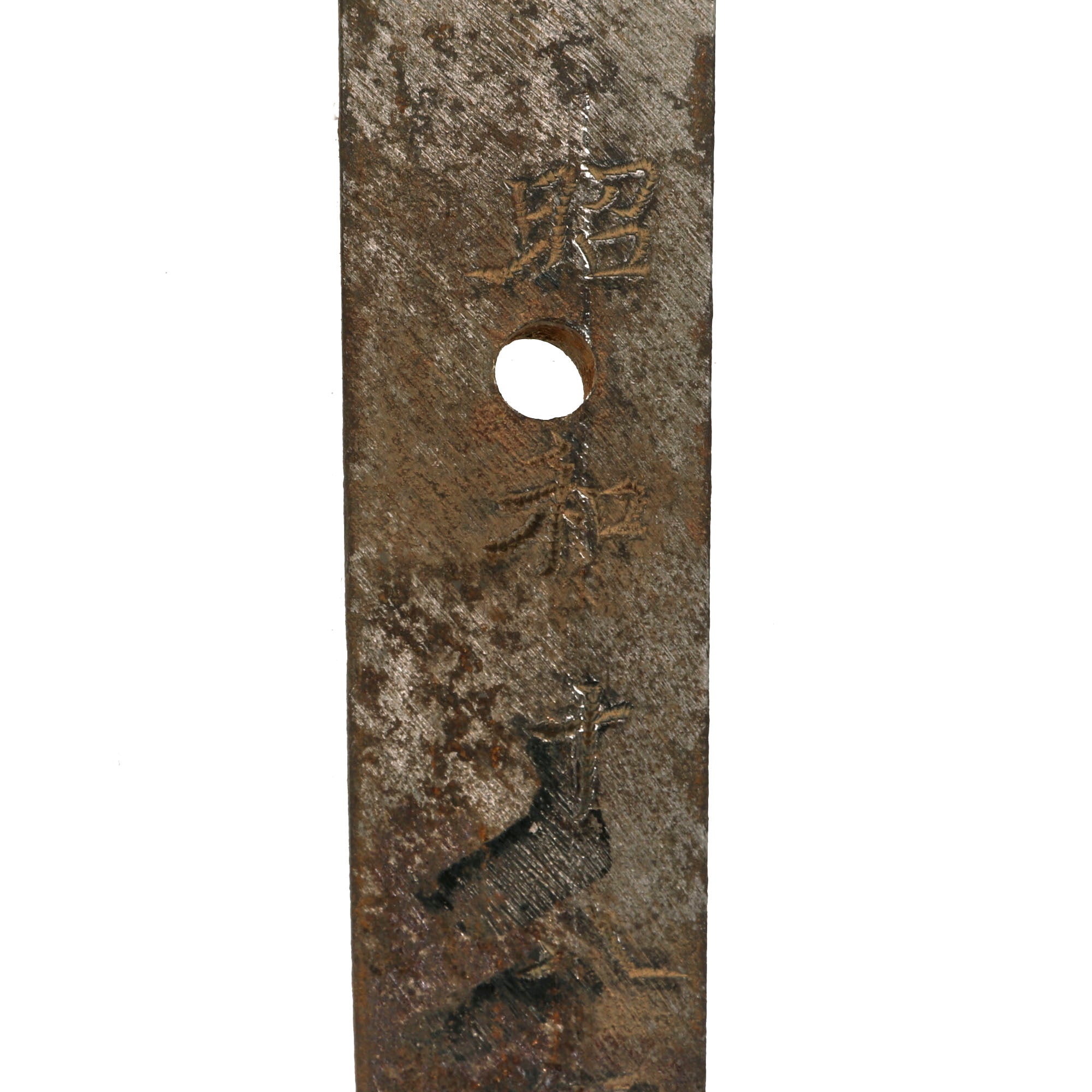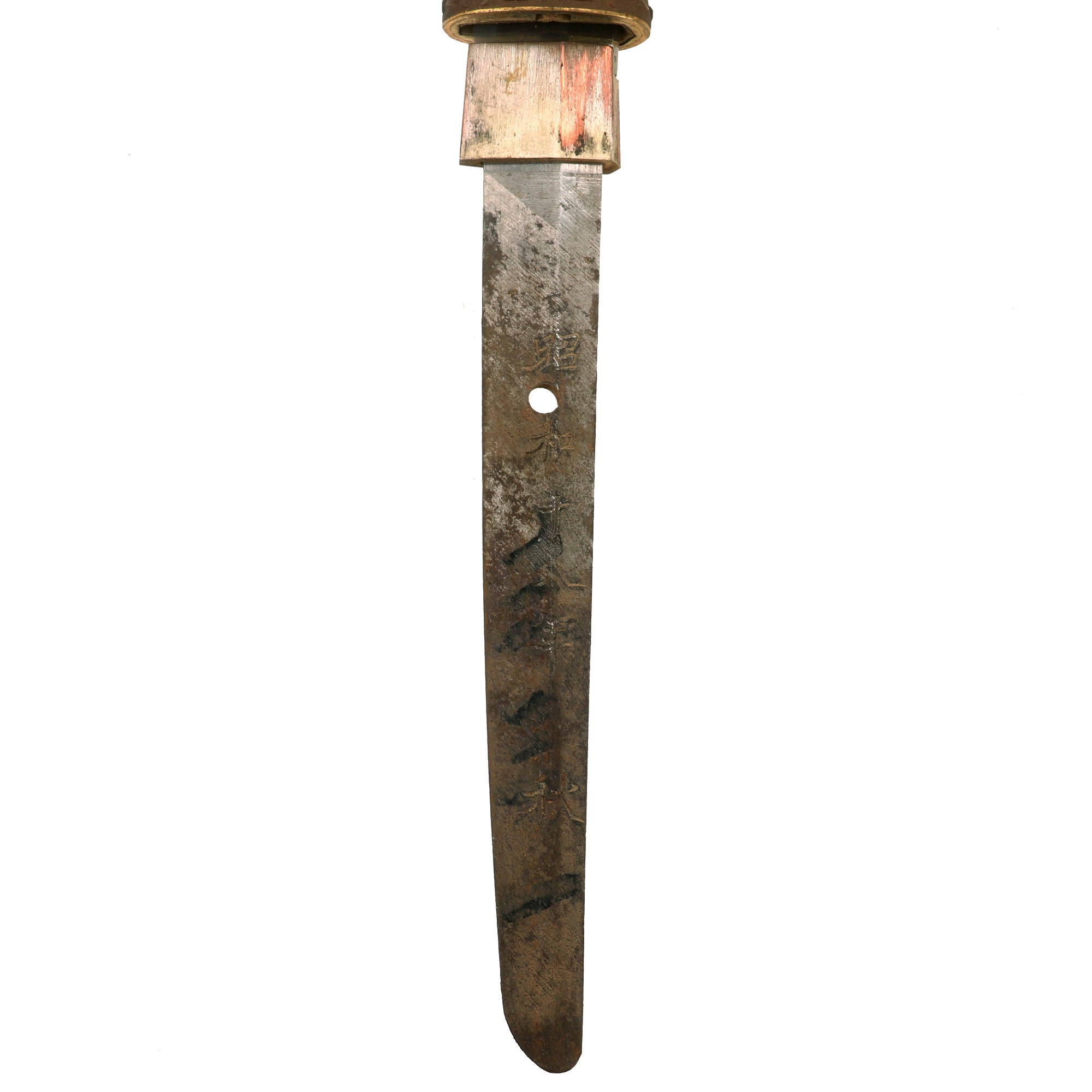 Offered in very good condition, the blade is still quite sharp and looks great. There is a bit of bending and minor nicking on the edge, which is a bit rough on the half of the blade nearest the tip. Overall the polish on the blade is very good, showing some light wear, as well as some oxidation staining on both sides, which we have made no attempt to polish out. It has been given a standard polish, with a burnished mune (spine) and shinogi-ji (blade flat above the ridge) while the JI has a bit of a matte character, as is correct. Blade length is approximately 26 ¼ inches and overall length 37 inches. The katana has an arsenal forged blade with a Futsu 普通 (regular) Nakago (tang) with Haagari (asymmetrical rounded) nakago-jiri (tang tip).