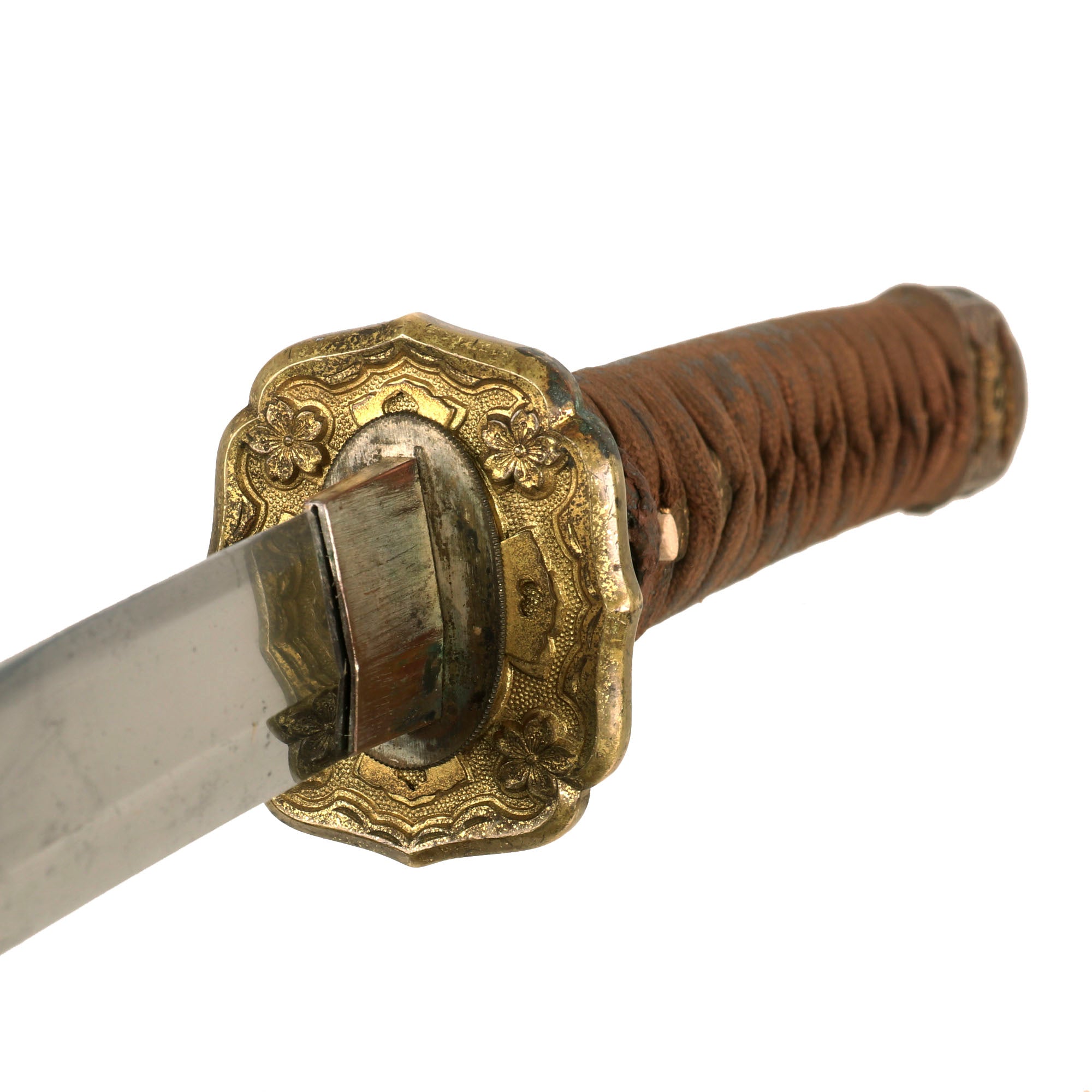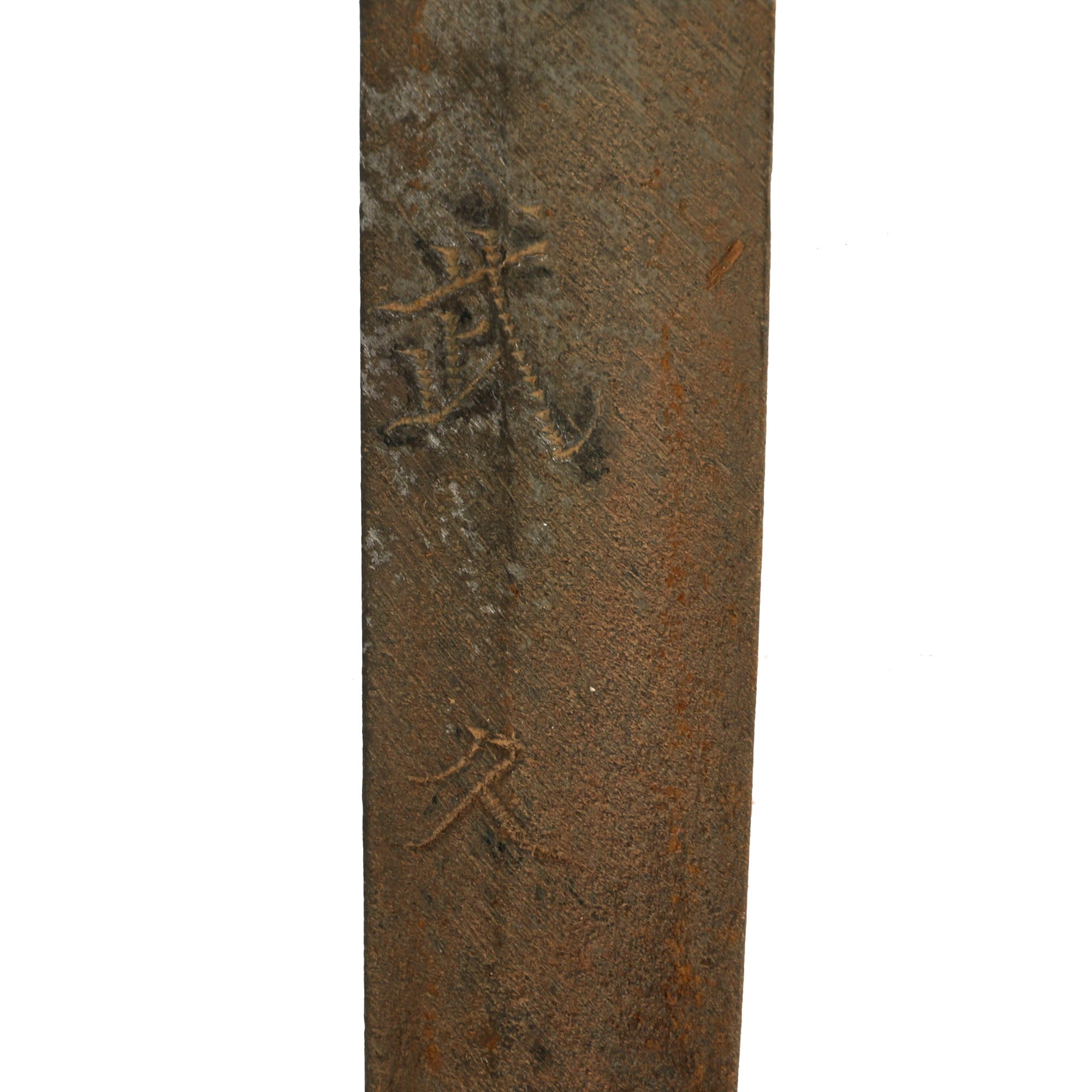 The blade on this example looks to have been arsenal forged, and the tang of the blade is signed (Mei) with the characters 武 久, which is read as TAKEHISA. There is unfortunately not much known on this smith, other than they were active during the Showa period. We have confirmed the signature (oshigata) with other examples of their work. The bottom of the tang on this side is marked with the somewhat mysterious W stamping, which is believed to be a sub-inspection mark, possibly for blades forged using "Mantetsu" steel.