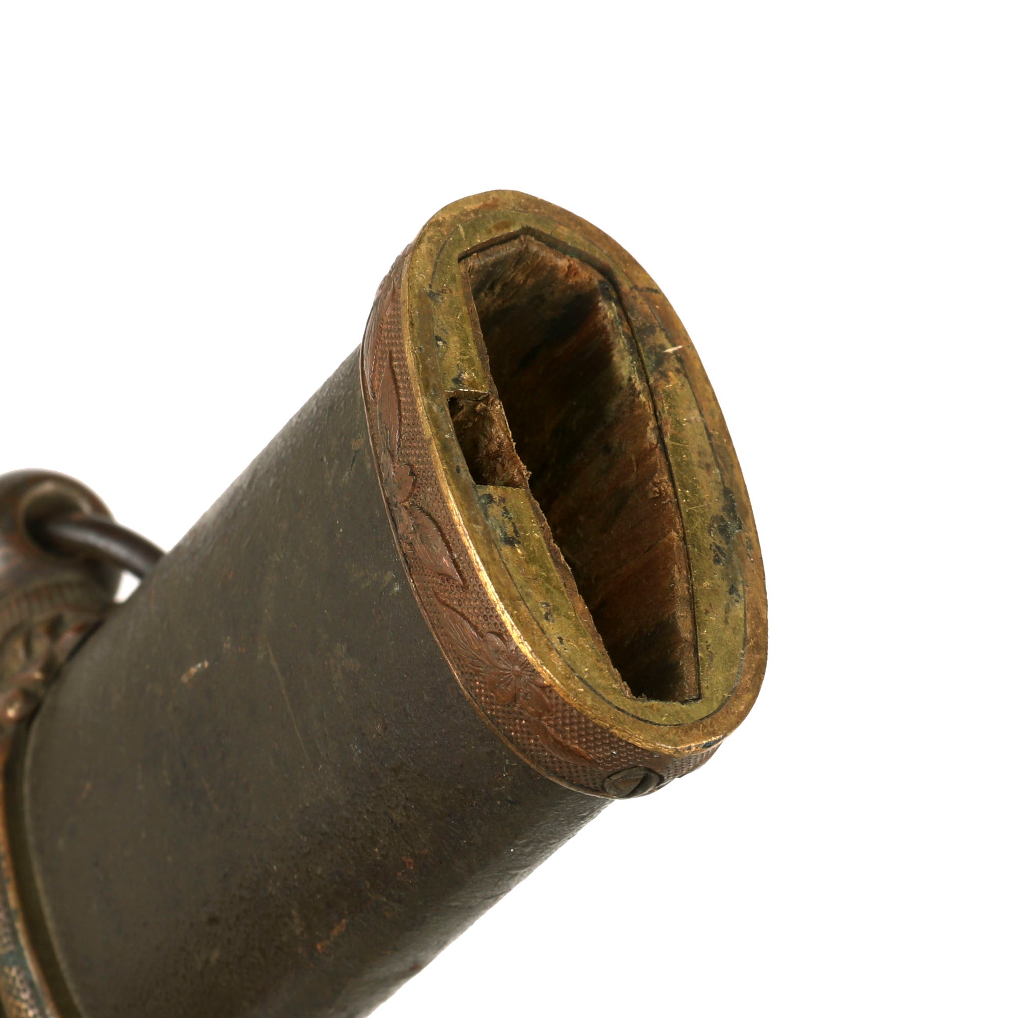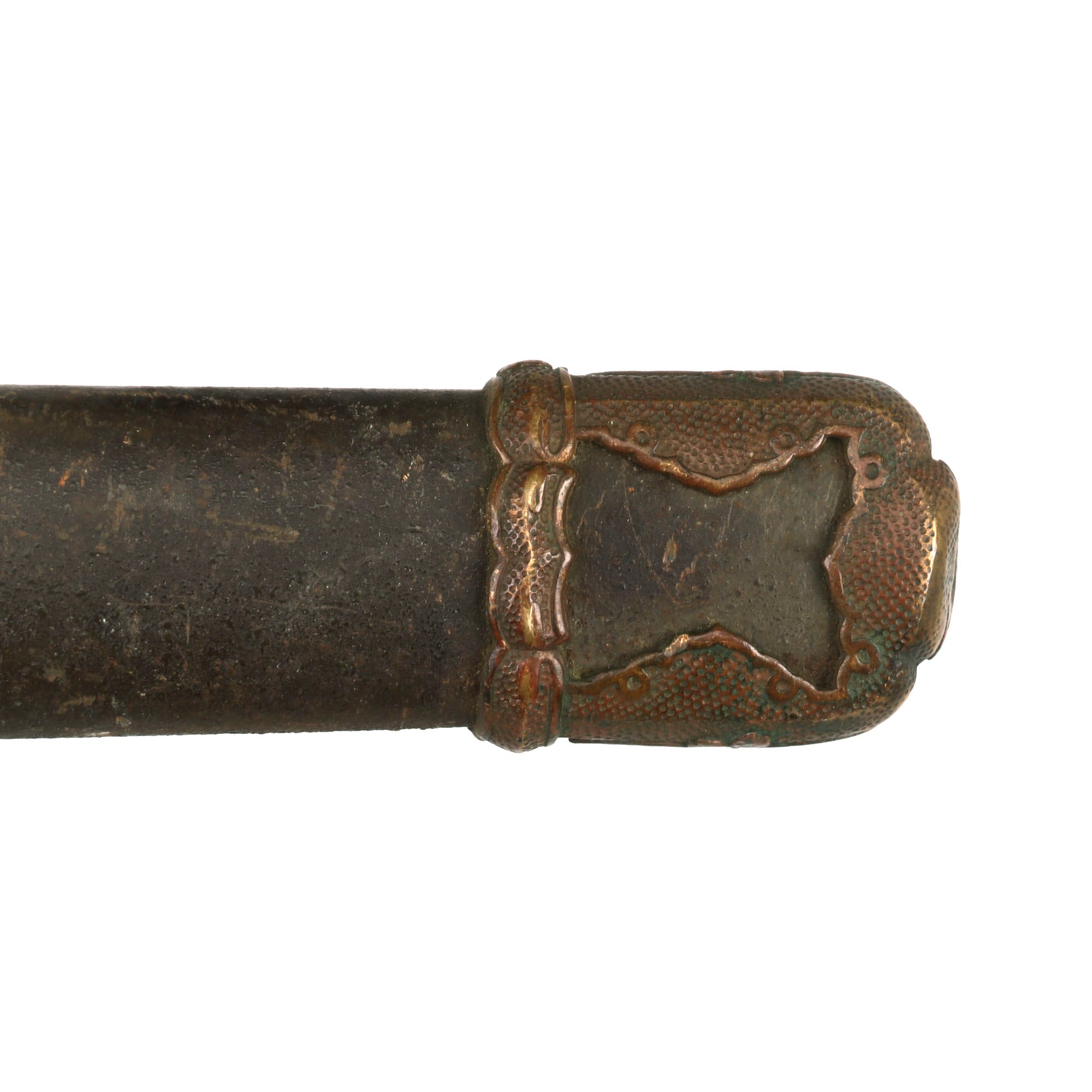 The Scabbard (saya) is steel over wood, and in very good condition, without any dents, bends, or major structural issues. It shows light overall wear to the external textured brown paint, which has resulted in some light oxidation in areas. It has the correct single hanger loop of the Type 98 style, though that fitting has lost most of the original finish due to handling wear. The top fitting is inlet for the scabbard lock on the hilt. which is still fully functional.