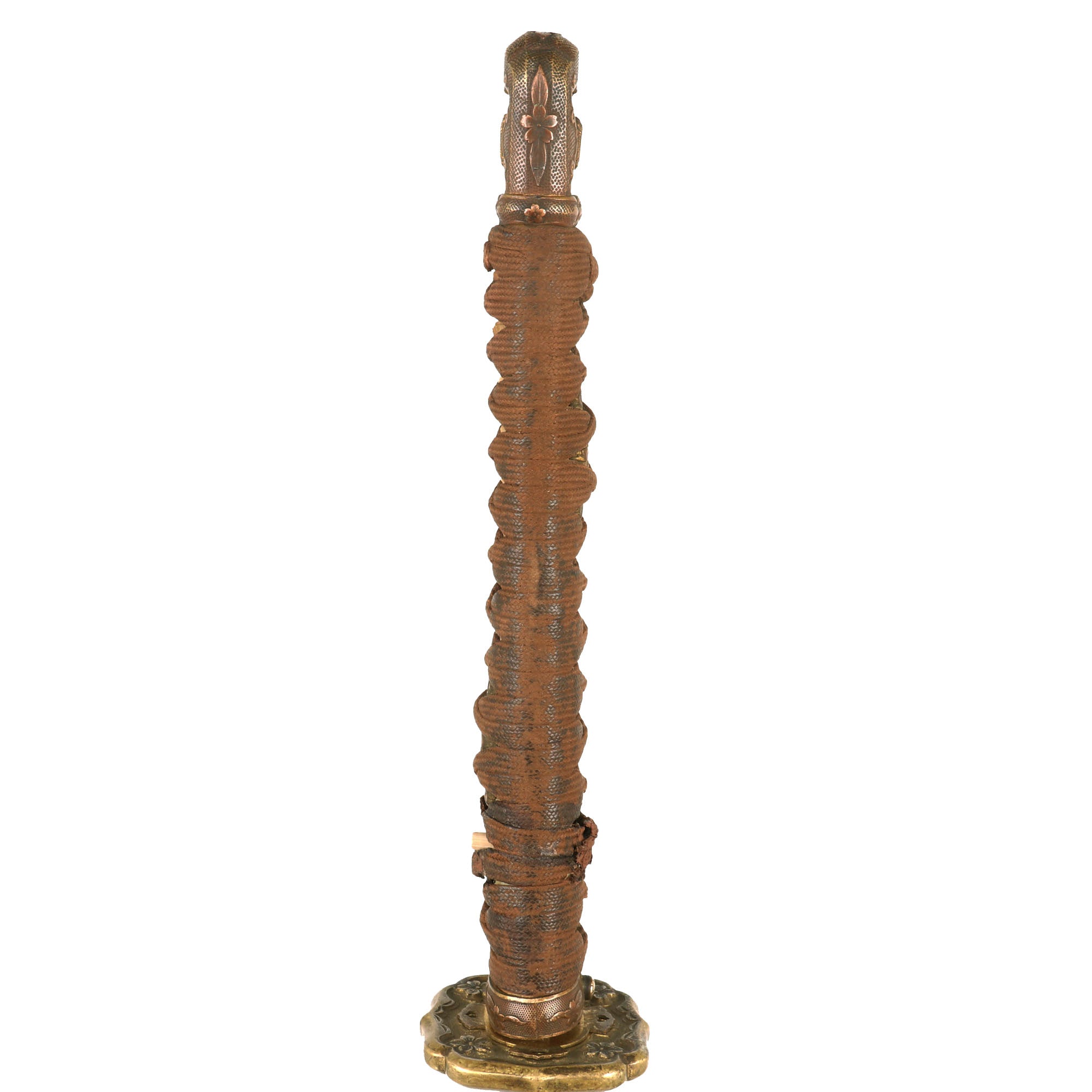 The handle (tsuka) has an great Sa-Me (Stingray Skin) grip, which is fully intact. It has a mostly complete golden brown Ito (cloth binding), which shows wear and staining from use in the field. It also has born around the mekugi-ana peg hole in the past, and was repaired using some type of red glue long ago. There is a single wooden securing peg (mekugi) still present, which is definitely a display replacement. There is no loop on the end of the handle, which looks to have been fabric, and tore off long ago.