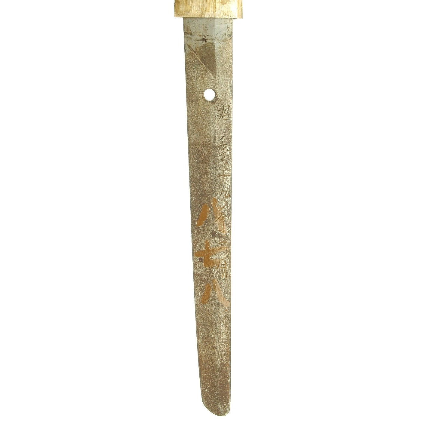 The blade on this example was hand forged at arsenal, most likely at Seki, and the tang of the blade is signed (Mei) with the characters 金 道 (KINMICHI). Research indicates that this smith's real name was 日比野 一二 (Hibino Ichiji), and he was born on May 6 1917. He later died August 20 1945, very soon after the end of the war.