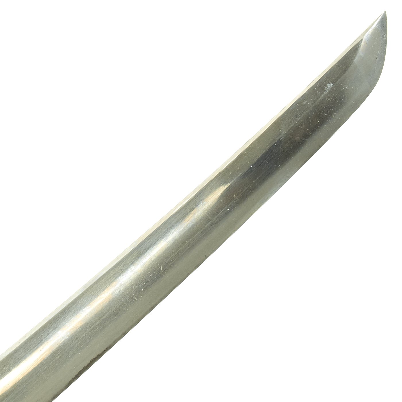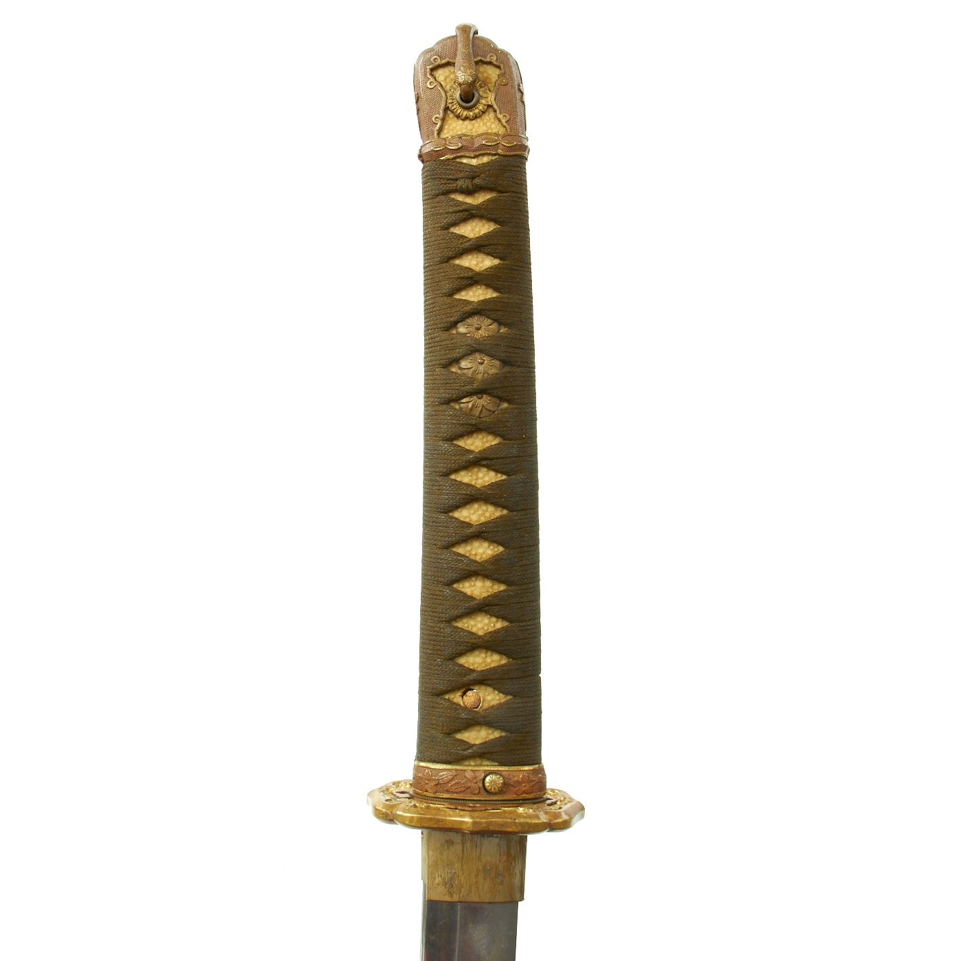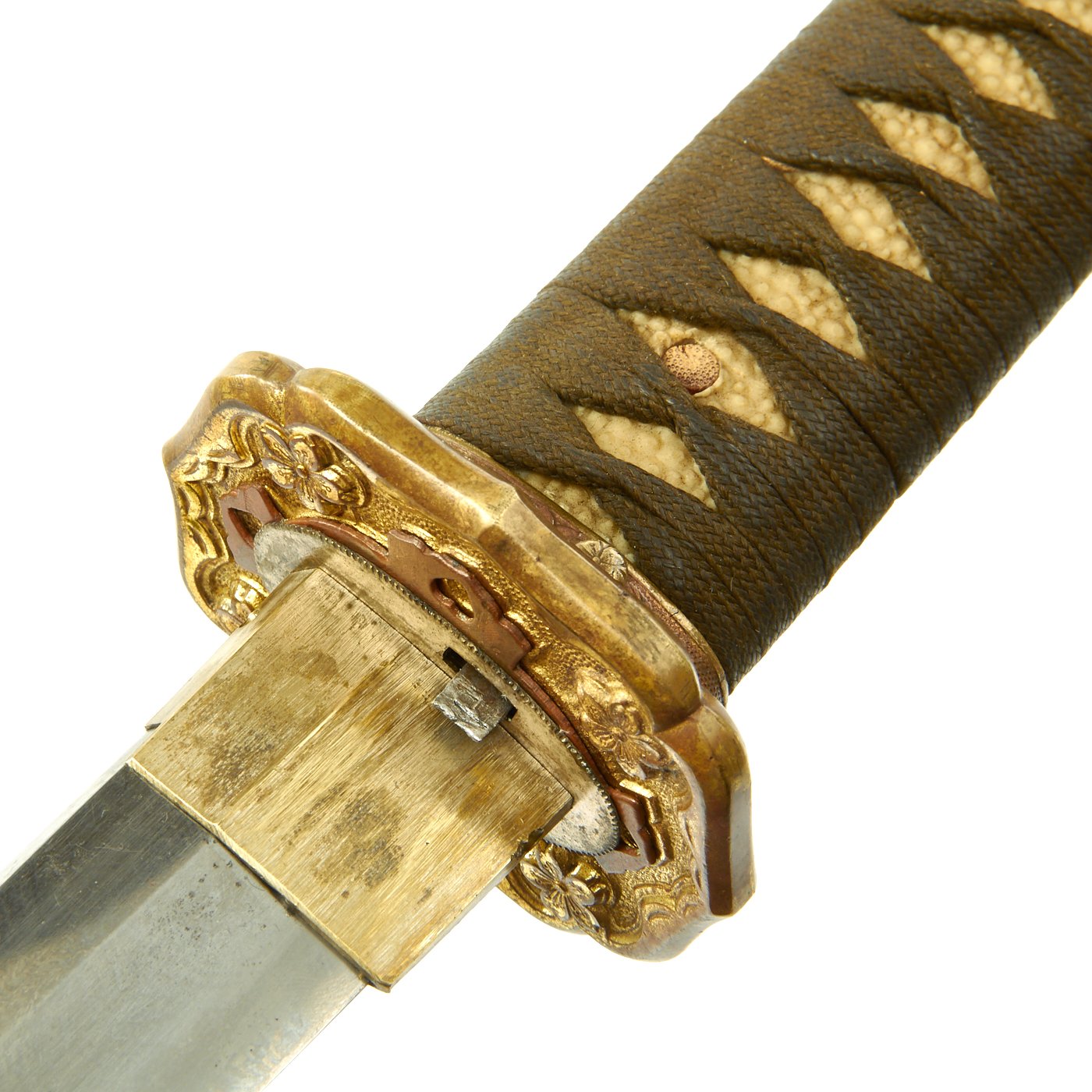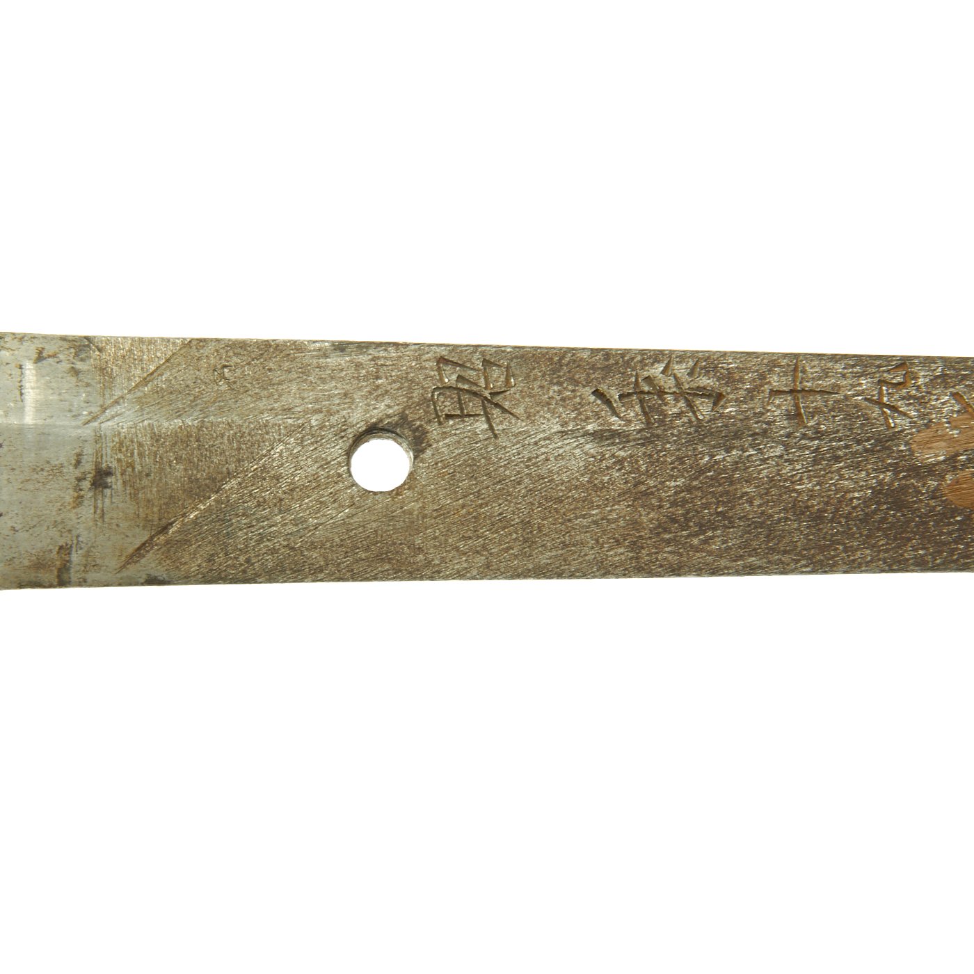 Offered in great condition, the blade is still sharp and is nick free, as far as we can see. Overall the polish on the blade is good, with some areas of light staining from oxidation on the edge in a few places. Blade length is approximately 26 1/8 inches and overall length 37 1/4 inches. The katana has a handmade arsenal made blade with an asymmetrically rounded (haagari) tang, and a proper geometric kissaki (tip) with a clear yokote (division between body and tip). Temper line (hamon) is visible, and is of the straight (sugu) type. On the Boshi (blade tip) the temper line takes a small circle (komaru) shape. Light grain on blade is visible on the blade flat (ji).