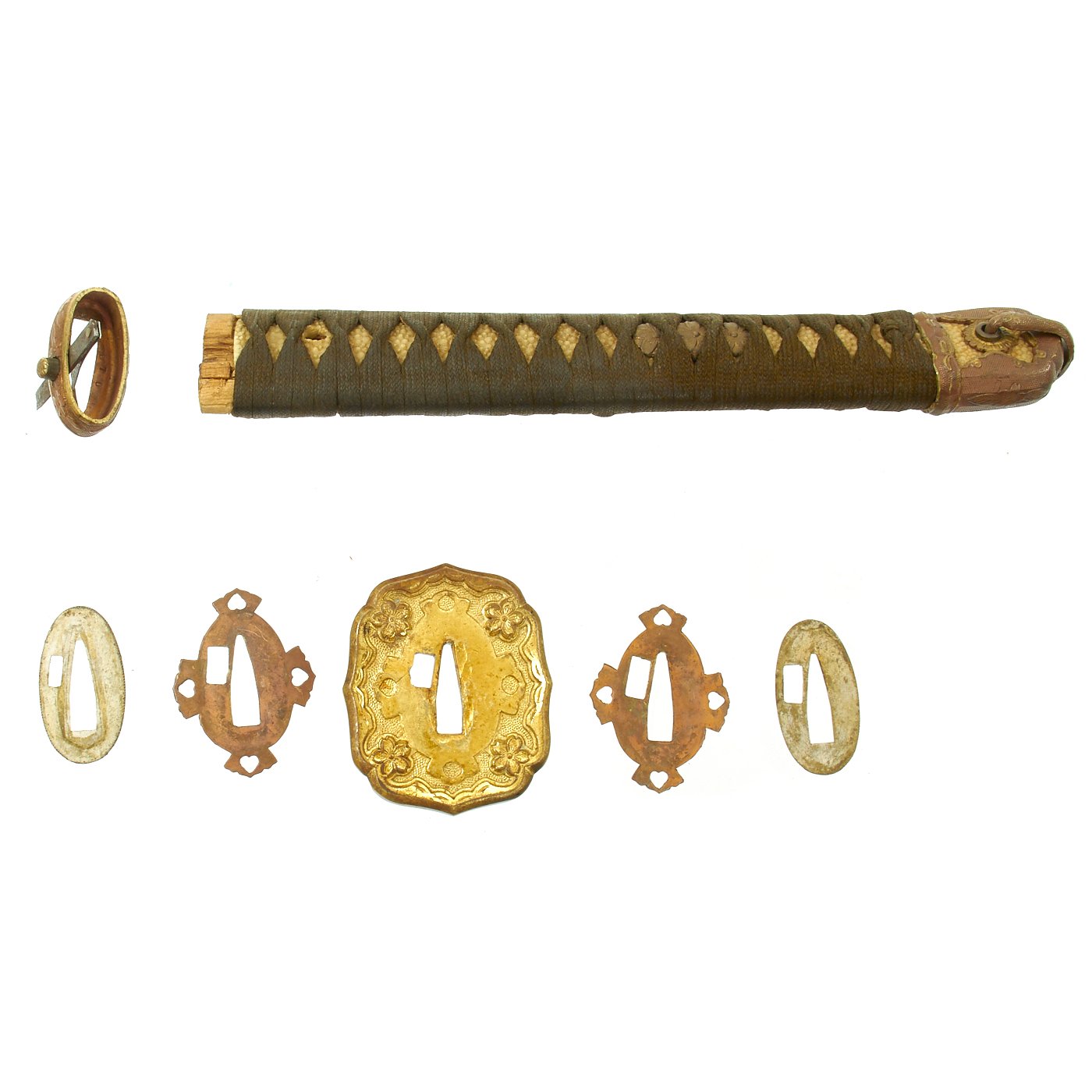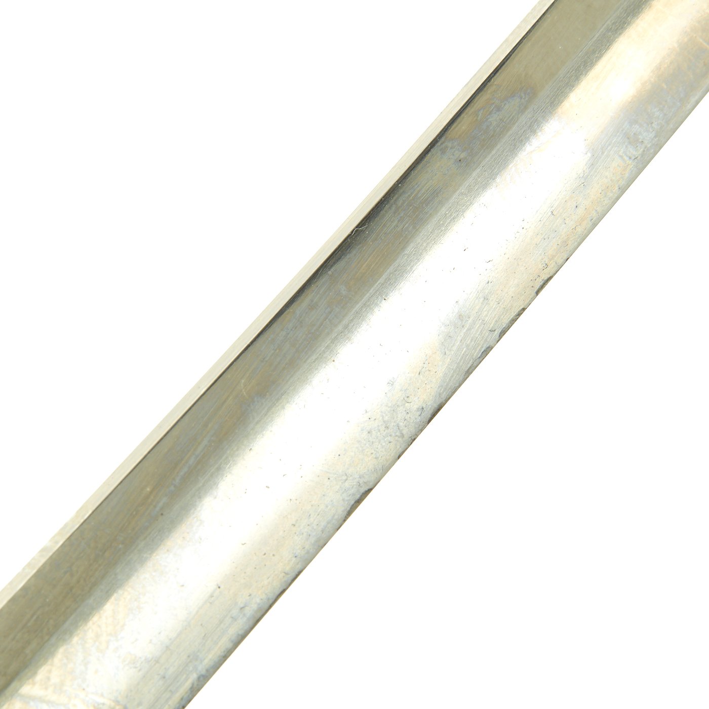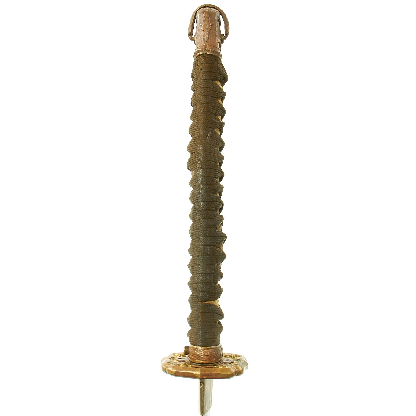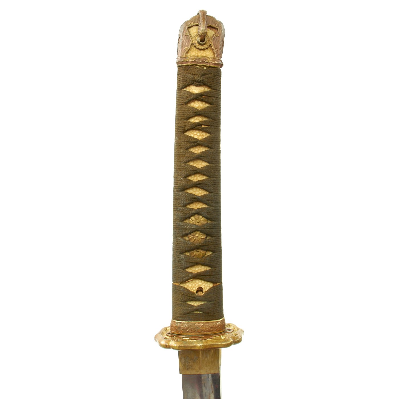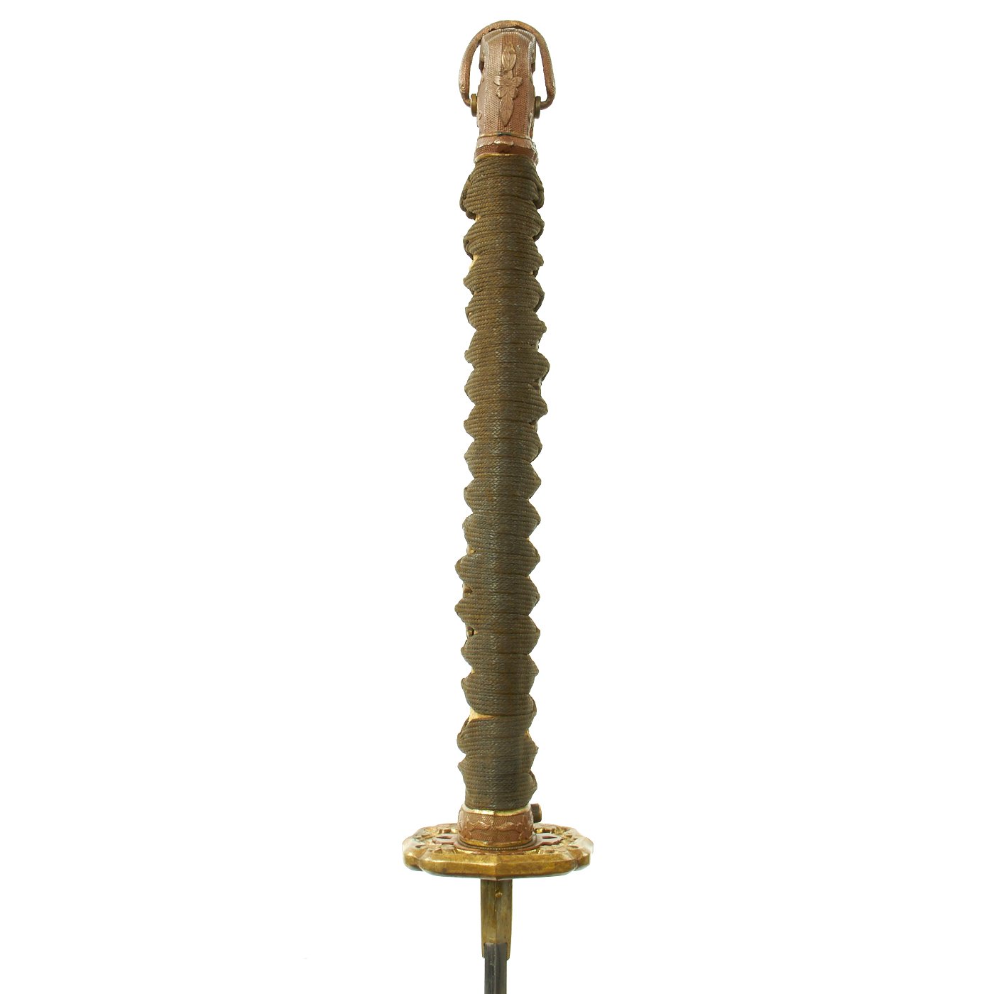 Offered in great condition, the blade is still sharp and is nick free, as far as we can see. Overall the polish on the blade is good, with some areas of light staining from oxidation on the edge in a few places. Blade length is approximately 26 1/8 inches and overall length 37 1/4 inches. The katana has a handmade arsenal made blade with an asymmetrically rounded (haagari) tang, and a proper geometric kissaki (tip) with a clear yokote (division between body and tip). Temper line (hamon) is visible, and is of the straight (sugu) type. On the Boshi (blade tip) the temper line takes a small circle (komaru) shape. Light grain on blade is visible on the blade flat (ji).