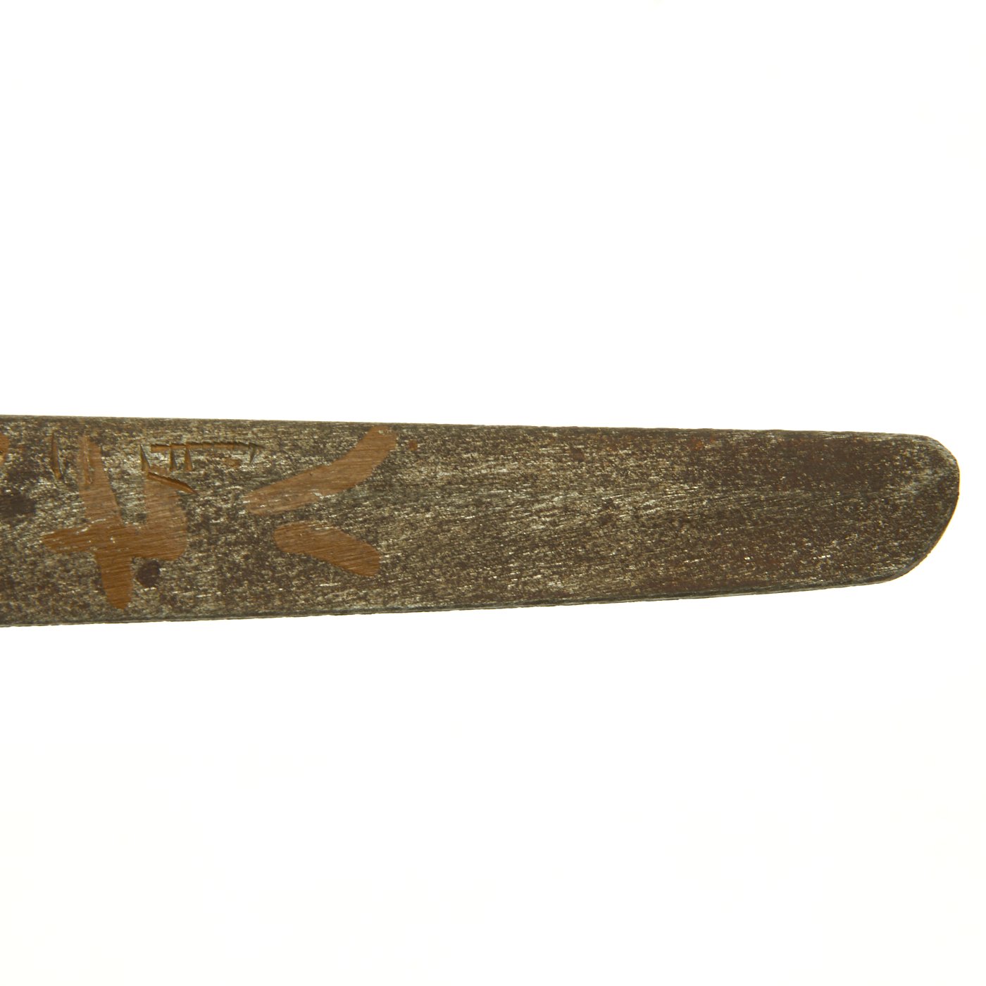 The fittings on this sword are not marked with any numbers, except for the fuchi, which is marked 878. This matches the painted number on the dated side of the tang, 八 七 八 - 8 7 8. Normally other parts would be marked, but in later war production, that step was omitted. There is also the number 一 三 四 五 - 1 3 4 5 painted on the Signed size of the blade, but we do not know what the significance is.